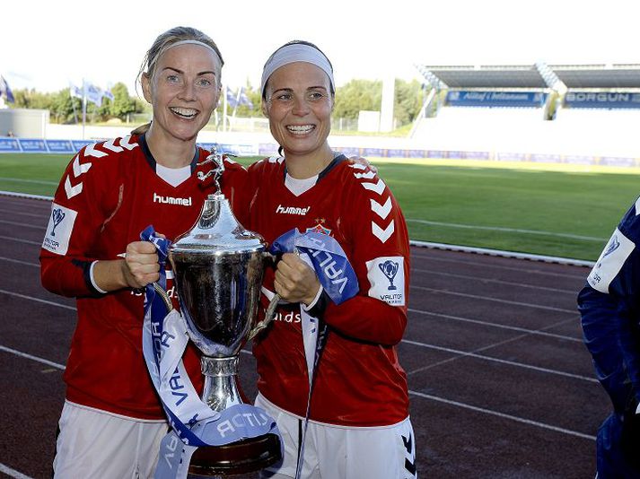Bikardrottningin í Valsliðinu Óskar Ófeigur Jónsson skrifar 22. ágúst 2011 08:00 Hallbera Guðný Gísladóttir fagnar sjöföldum bikarmeistara, Emblu Sigríði Grétarsdóttur, með því að sturta yfir hana úr vatnsbrúsa eins og venjan er á slíkum sigurstundum. Mynd/Arnþór Valskonur héldu sigurgöngu sinni áfram í bikarkeppninni um helgina með því að vinna öruggan 2-0 sigur á KR í úrslitaleik Valitor-bikarsins á Laugardalsvellinum. Valsliðið var þarna að vinna ellefta bikarleikinn í röð og fór því með bikarinn heim á Hlíðarenda þriðja árið í röð. Fyrir nokkrum árum gekk Valsliðinu oft illa að landa þessum titli þrátt fyrir nokkra yfirburði á Íslandsmótinu en nú er raunin önnur og bikarinn á eflaust orðið fastan stað í bikarskápnum á Hlíðarenda. Reynsluboltarnir Rakel Logadóttir og Kristín Ýr Bjarnadóttir sáu um að skora mörkin en sú síðarnefnda hefði auðveldlega getað skorað fernu í þessum leik. Kristín Ýr var því orðin langeygð eftir marki þegar glæsilegur skalli hennar þandi netmöskvana í seinni hálfleik, en það mark gerði nánast út um leikinn. „Við duttum aðeins niður í smá stress en við erum með reynsluna á bak við okkur og það vann með okkur í dag," sagði Rakel Logadóttir eftir leikinn, en hún var ein af þeim í Valsliðinu sem voru að vinna bikarinn í fimmta sinn. Laufey Ólafsdóttir er líka í þeim hópi en Laufey átti mjög góðan leik á miðju Valsliðsins í gær. Bikardrottningin í Valsliðinu er hins vegar Hornfirðingurinn Embla Sigríður Grétarsdóttir, sem varð bikarmeistari fimmta árið í röð og alls í sjöunda sinn á sínum ferli. Með þessum sjöunda bikarmeistaratitli jafnaði hún met Valskonunnar Guðrúnar Sæmundsdóttur, sem vann bikarinn sjö sinnum með Val á árunum 1984-1995. „Þetta er bara æðislegt og það er ógeðslega gaman að vinna þennan titil," sagði Embla í leikslok. „Íslandsmeistaratitilinn er farinn og það skipti því rosalega miklu máli að ná þessum titli. Við erum með það gott lið að það hefði verið hræðilegt að klúðra báðum titlunum þetta árið," sagði Embla, en það er líka langt síðan hún tapaði í bikarúrslitaleik, meira en áratugur. Embla þurfti að sætta sig við silfur 1998 og 2000 en eftir það hefur hún haldið sig við gullið.Bestu vinkonur Laufey Ólafsdóttir og Rakel Logadóttir fagna hér saman í leikslok, en þær hafa unnið marga titla saman.Fréttablaðið/ArnþórValskonur nýttu sér reynsluna í sínu liði eftir að hafa rétt sloppið inn í hálfleikinn án þess að fá á sig mark. „Þær komu dýrvitlausar inn í leikinn um miðjan fyrri hálfleik og pressuðu vel á okkur. Það hefði allt getað gerst þá en sem betur fer róuðum við okkur svolítið niður í hálfleik. Við vorum uppspenntar en við komum öflugar inn í seinni hálfleikinn og kláruðum þetta svona glæsilega. Það stafaði ekki mikil ógn af þeim í seinni hálfleik," sagði Embla. Embla er hluti af hinni sterku vörn Valsliðsins sem fékk ekki á sig mark í bikarkeppninni í ár. Liðið vann þrjá 1-0 sigra á leið sinni í úrslitaleikinn og hefur nú haldið marki sínu hreinu í 678 mínútur í bikarkeppninni. Embla hefur verið á sínum stað í Valsvörninni allan þennan tíma. Það bjuggust ekki margir við miklu af KR-liðinu, ekki síst eftir að liðið lenti undir á þriðju mínútu. „Við áttum góðan kafla í lokin á fyrri hálfleik en svo datt þetta allt niður hjá okkur í seinni hálfleiknum. Við vorum orðnar þreyttar og það var eins og orkan væri alveg búin hjá okkur. Við áttum færi í fyrri hálfleiknum og vorum þá að spila boltanum vel á milli okkar. Svo ætluðum við að halda því áfram en það gekk ekki," sagði KR-ingurinn Katrín Ásbjörnsdóttir. „Valsstelpurnar eru rosalega sterkar og þær halda þetta alveg út í 90 mínútur. Mér finnst þær vera besta liðið á Íslandi núna," sagði Katrín. Pepsi Max-deild kvenna Mest lesið Stór nöfn úr leik á HM í pílukasti Sport Dómarinn hlýtur mikið lof fyrir stundarbræði í garð Jake Paul og Joshua Sport Ronaldo á nærbuxunum lætur Elon Musk efast um sjálfan sig Fótbolti Gleði og sorg í sigri Liverpool Enski boltinn Slot fámáll um stöðuna á Isak Enski boltinn Gyökeres skaut Arsenal aftur á toppinn Enski boltinn Calvert-Lewin hættir ekki að skora Enski boltinn Donni fagnaði EM vali með skotsýningu Handbolti Orri Steinn kominn með nýjan þjálfara Fótbolti Gagnrýndi Paul: „Beið eftir að verða sleginn“ Sport Fleiri fréttir Elías mættur til meistaranna KR sagt vera að landa Arnóri Ingva Hilmar Árni til starfa hjá KR Segir fjórðung í bók Óla ósannan Víkingur í úrslit Bose-bikarsins eftir sigur „Verið heiður að spila í appelsínugulu með frábærum liðsfélögum“ Þekkir Egilshöllina vel og skoraði gegn fyrrum félögum Strákar Heimis Guðjóns fengu slæman skell í fyrsta leik Axel verður áfram hjá Aftureldingu Kveður pabba sinn í Laugardalnum og fer til FH „Félag sem var í basli með að ná endum saman og greiða laun á réttum tíma“ Skrýtið og taktlaust: „Ég er ekkert sátt með niðurstöðuna“ Fanndís kveður sviðið: „Ég er búin að fella nokkur tár“ Gylfi með tvö og Víkingar byrja á sigri Frá Akureyri til Danmerkur Markadrottningin heldur að landsliðið sé búið spil Strákarnir í 2. flokki Vals þeir einu sem ekki spila fyrir áramót Dæturnar vildu norður: „Mun alltaf gera allt fyrir þær“ Stjarnan sækir markvörð í 3. deildina „Ég var orðinn algjörlega bugaður“ Jónatan áfram á Hlíðarenda: „Var alltaf jákvæður fyrir því að framlengja“ Óli Jó kallar ráðninguna á Jóa Kalla algjört bull „Ég elska þig Ísland, takk fyrir allt!“ Sextán ára með fernu fyrir meistara Víkings Valur