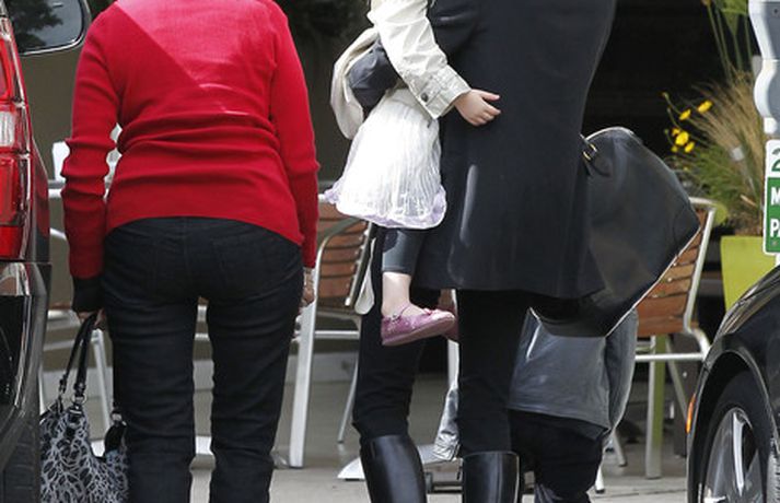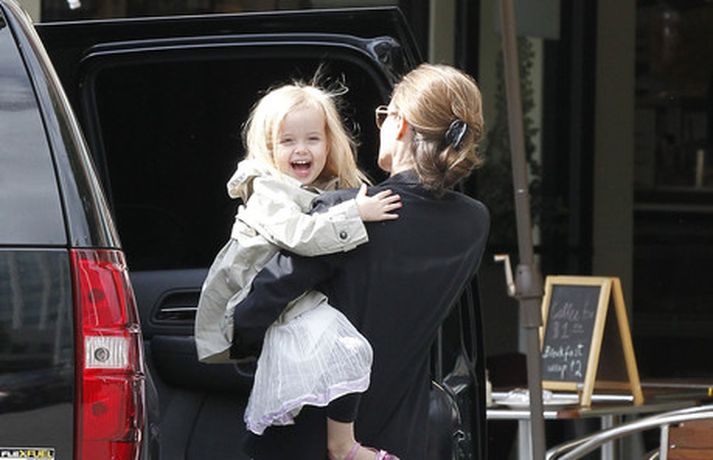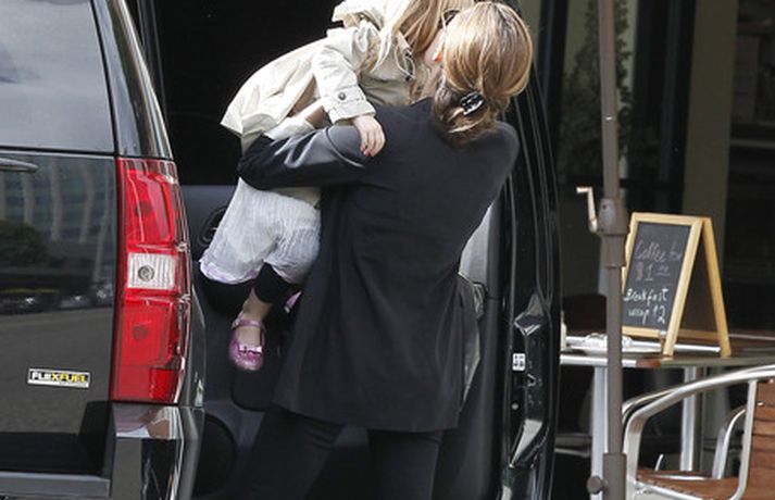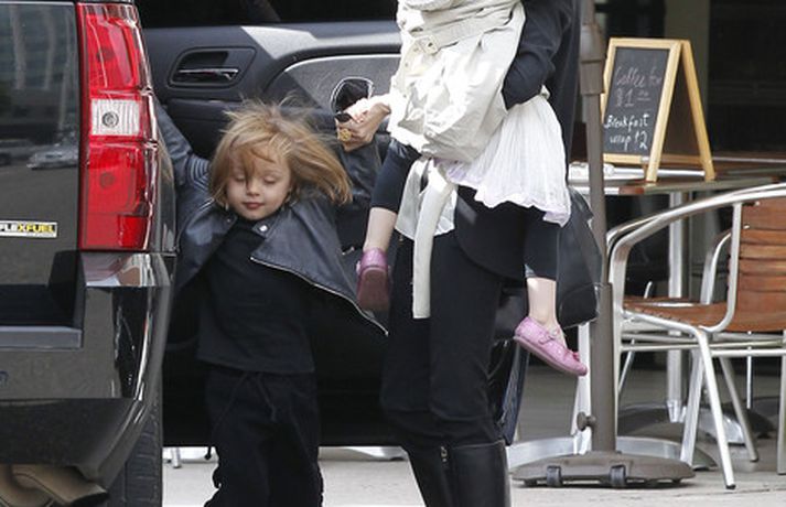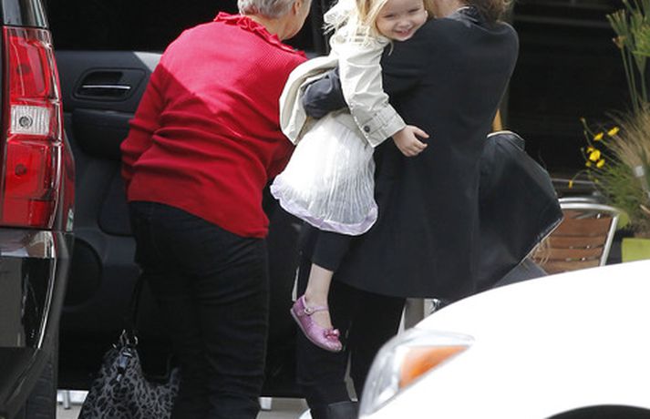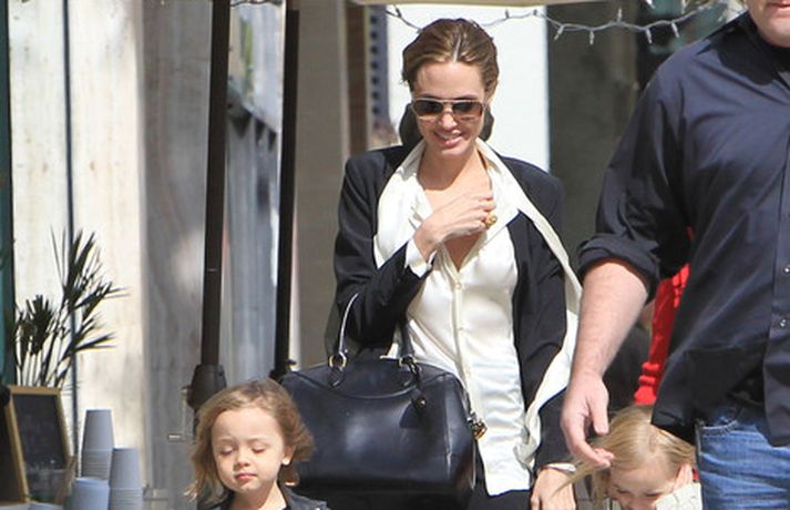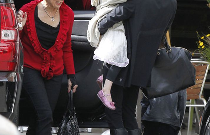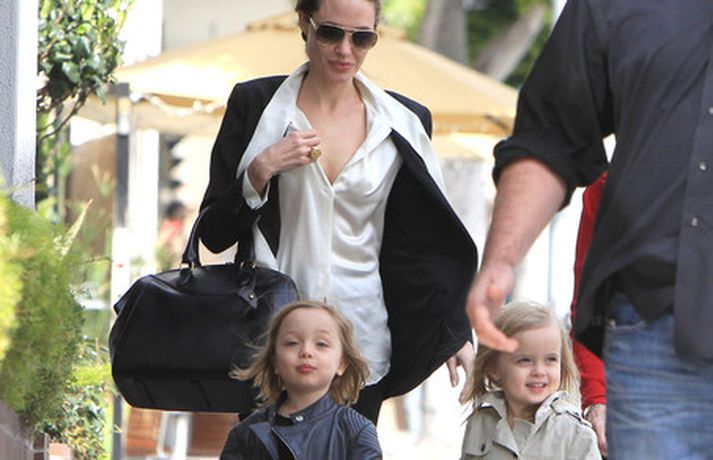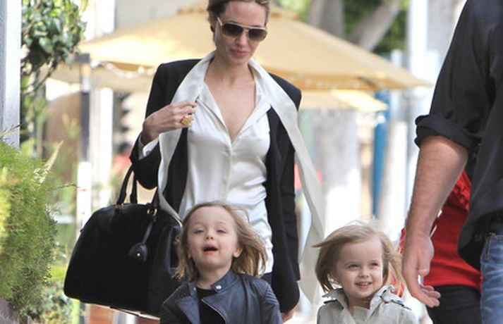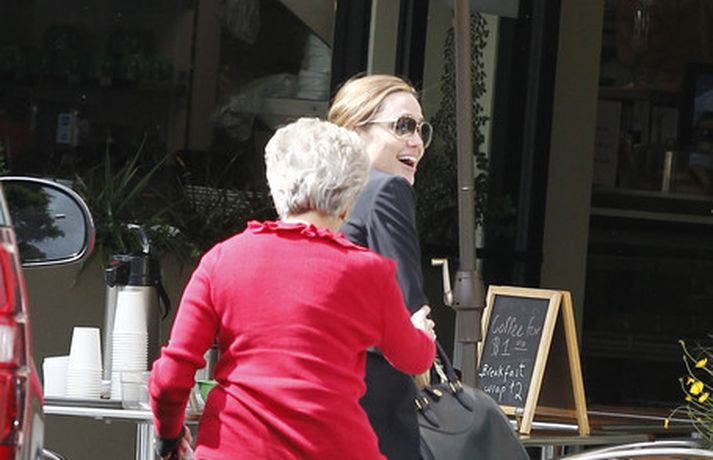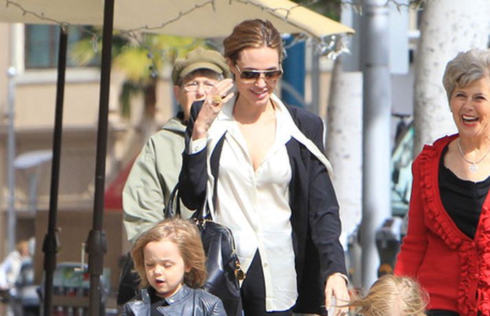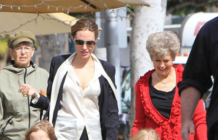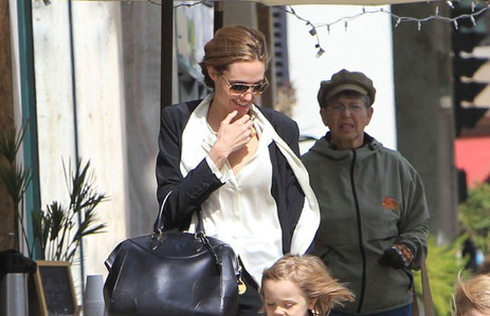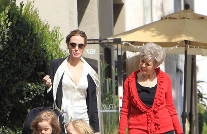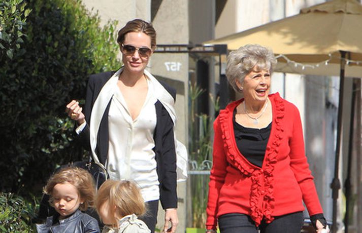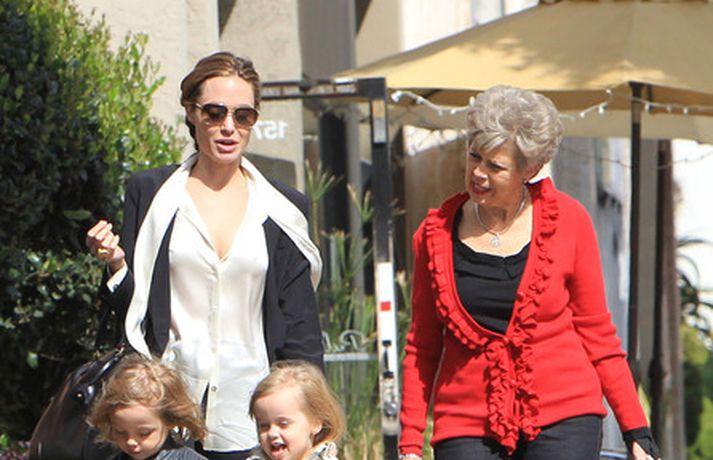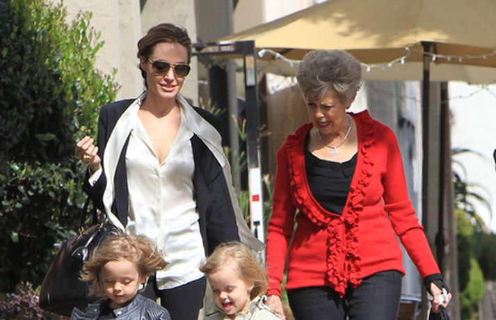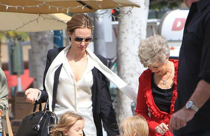 Angelina Jolie, 36 ára, tengdamóðir hennar og tvíburarnir Knox og Vivienne, 3 ára, nutu samverunnar í Beverly Hills í Kaliforníu í gærdag. „Við höfum rætt það. Hugmyndin er orðin að veruleika," sagði Angelina þegar hún viðurkenndi í sjónvarpsviðtali að hún og Brad Pitt ætla að leika saman í framhaldsmynd Mr. & Mrs. Smith sem kom út árið 2005 en þau byrjuðu saman sama ár.