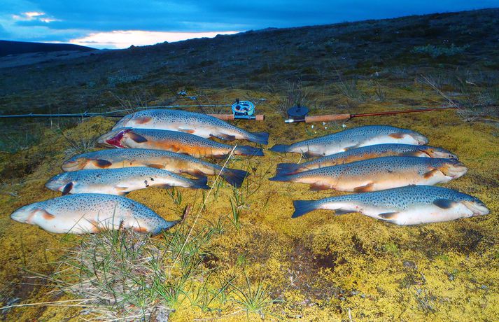 Á netaveiðitímanum í Veiðivötnum veiddust 4.715 fiskar í net og 647 fiskar á stöng, en hvort tveggja er heldur minni afli en í fyrra. Á veidivotn.is segir frá því að sumarið og haustið 2012 veiddust því alls 25.009 fiskar í Veiðivötnum. Þetta er nokkru minni veiði en undanfarin ár, en mjög gott miðað við síðustu áratugi (sjá samanburð á heildarveiði). Stangveiði í Veiðivötnum lauk 22. ágúst. Á stangveiðitímanum veiddust 19.647 fiskar sem er nokkru minni veiði en sumarið 2011, en þá fengust 21.240 fiskar. (sjá samanburð). Meðalþyngdin var aftur á móti betri en þá eða tæp tvö pund. Þetta er mesta meðalþyngd sem mælst hefur í Veiðivötnum frá árinu 2002 (sjá samanburð). Mest var meðalþyngdin í Grænavatni 4.54 pund. Þar veiddist einnig stærsti fiskur sumarsins 16.4 pund. Lang mest veiddist í Litlasjó á veiðitímabilinu. Alls komu 7.795 fiskar þar á land og þar af fengust 6.298 fiskar á stöng. svavar@frettabladid.isMynd/Haukur