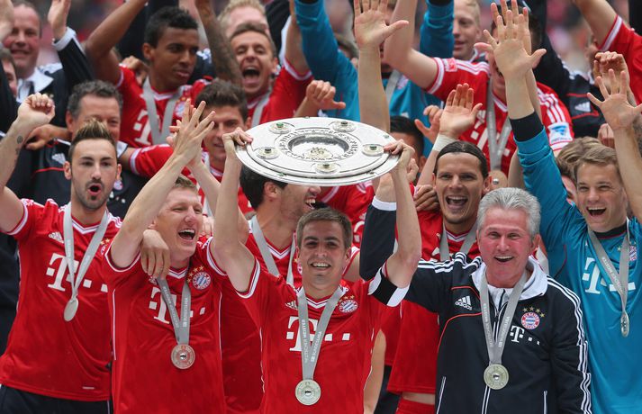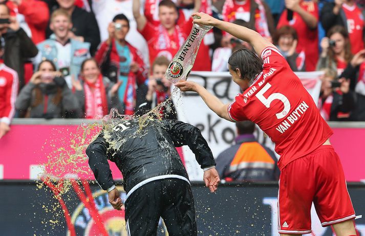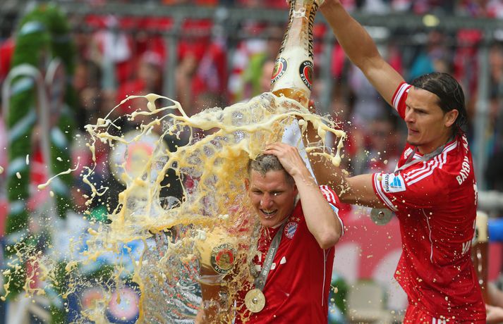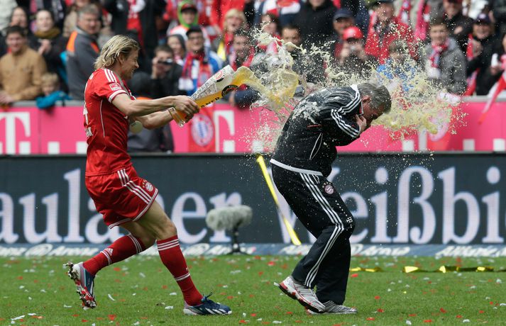 Bæjarar böðuðu sig upp úr bjór | Myndir 11. maí 2013 17:15 Schweinsteiger fær bjórbað. Bayern München fékk í dag afhentan skjöldinn fyrir sigur í þýsku úrvalsdeildinni. Var mikil gleði á Allianz-vellinum. Leikmenn sturtuðu meðal annars tugum lítra af bjór yfir hvorn annan en hefð er fyrir því í Þýskalandi að fagna með stórum bjórum. Bayern hefur átt frábært tímabil og er fyrir löngu síðan búið að tryggja sér titilinn heima fyrir og liðið er á leið í úrslit Meistaradeildarinnar. Meistararnir unnu 3-0 sigur á Augsburg í þessum síðasta heimaleik sínum í vetur. Deildin klárast um næstu helgi. Hægt er að skoða myndar af fagnaðarlátunum hér að ofan. Þýski boltinn Mest lesið Líður alltaf yfir hana þegar hún kemur í mark Sport Einkunnir Íslands: Þrjár heitastar í frostinu Fótbolti Magnús Már í viðræðum við HK Íslenski boltinn Vísar slúðrinu til föðurhúsanna Enski boltinn „Hefði séð eftir því alla ævi“ Íslenski boltinn Albert og Mikael Egill í vondum málum á Ítalíu Fótbolti „Við tókum bara þá ákvörðun að fara í Svanavatnið“ Fótbolti Rekinn fyrir ummæli sín um krabbameinssjúka handboltagoðsögn Handbolti Ísak Bergmann lagði upp gegn Bayern Fótbolti Dagskráin í dag: Íslenskur körfubolti og margt fleira Sport Fleiri fréttir Magnús Már í viðræðum við HK Vísar slúðrinu til föðurhúsanna Ísak Bergmann lagði upp gegn Bayern „Við tókum bara þá ákvörðun að fara í Svanavatnið“ Albert og Mikael Egill í vondum málum á Ítalíu Palace neitar að sleppa takinu á Liverpool „Eitthvað sem ég mun aldrei gleyma“ Einkunnir Íslands: Þrjár heitastar í frostinu Viktor Bjarki skoraði og lagði upp í fyrsta byrjunarliðsleiknum Uppgjörið: Ísland - Norður-Írland 3-0 | Áfram hluti af elítunni Pedri gæti verið frá keppni til langs tíma Arteta fyrstur stjóranna á fætur Þorsteinn breytir engu á milli leikja Snjóbræðslukerfi Þróttar kom KSÍ til bjargar Tölur úr Bestu 2025: Klúðraði langflestum dauðafærum í sumar Segja spurningar vakna um stöðu Elísabetar Litu á hann sem risaeðlu en sjáið hvað er í tísku núna Formaðurinn hjálpaði til við að moka völlinn Formenn sambandanna hjálpuðu við að moka völlinn Real Madrid mun ekki refsa Vinícius Júnior Fluttu fréttir af snjónum í Reykjavík Sýknaður í alvarlegu ofbeldismáli Búið að finna leiðina til að pirra og vinna Liverpool Sú leikjahæsta leggur skóna á hilluna og klárar læknanámið Stuðningsmaður RB Leipzig lést á bikarleiknum í gærkvöldi Arteta óttast ekki að keppinautarnir steli undrabarninu frá honum FH bíður með að tilkynna nýjan þjálfara Óskar Hrafn fer ekki fet Spánn og Þýskaland mætast í úrslitum Anguissa hetja meistaranna Sjá meira