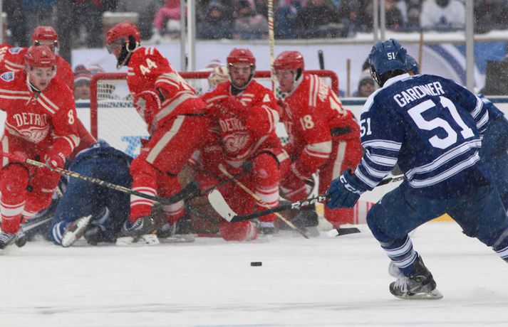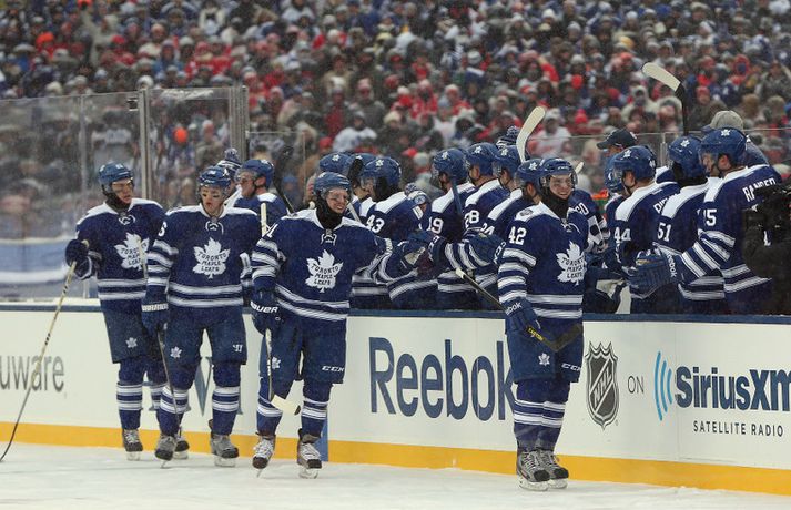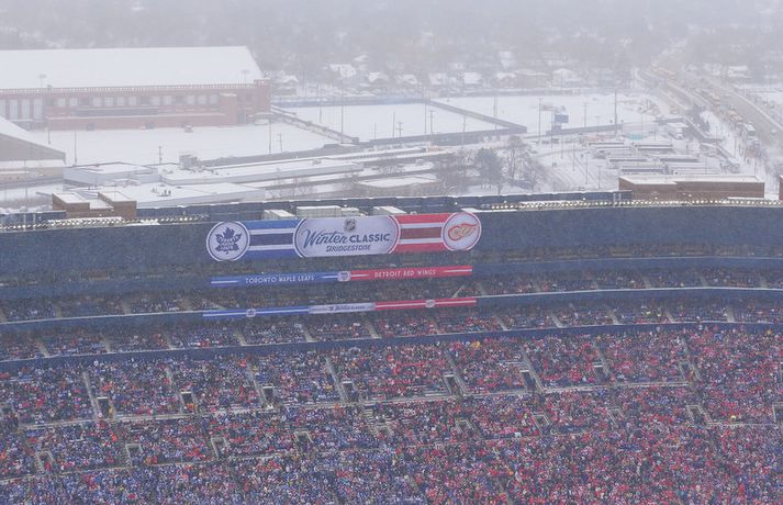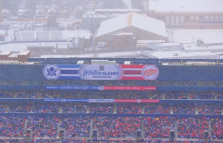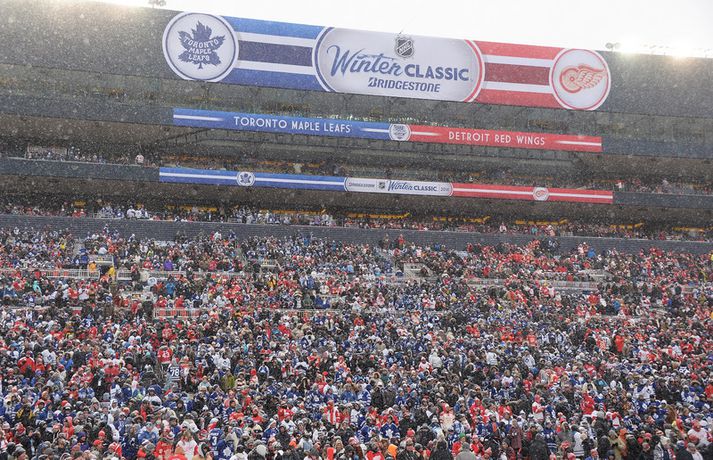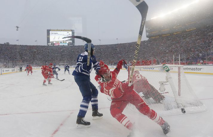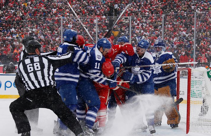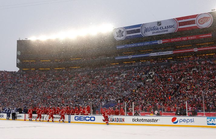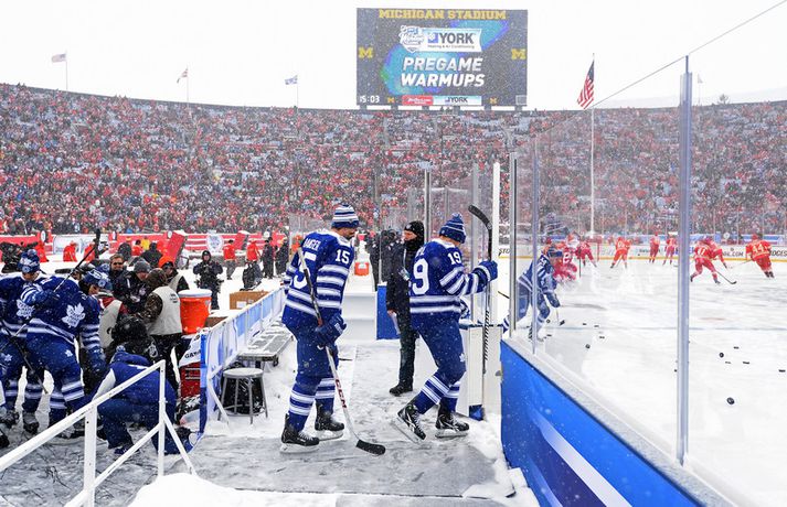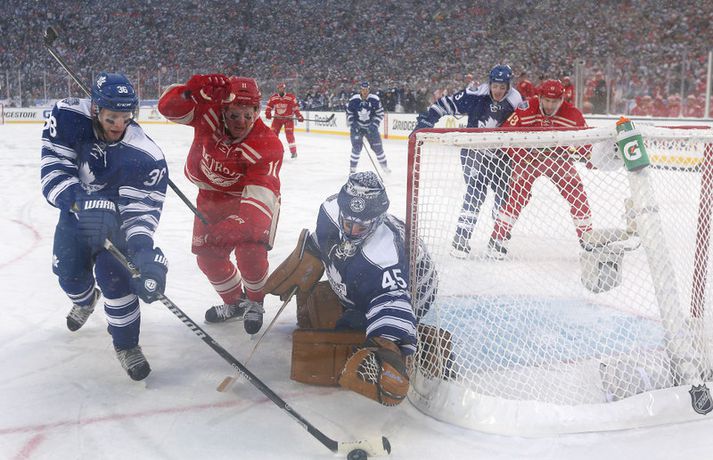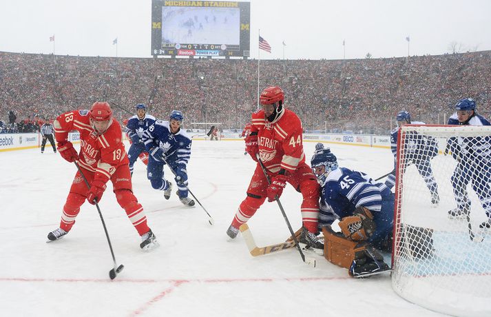 Það var mikil dramatík í sérstökum íshokkíleik á nýársdag þegar Toronto Maple Leafs unnu 3-2 sigur á Detroit Red Wings í NHL-deildinni í leik þar sem úrslitin réðust ekki fyrr en í vítakeppni. Þetta var sögulegur leikur og ekki bara fyrir að þarna voru tvö af stofnliðum NHL-deildarinnar að mætast á fyrsta degi ársins heldur var þarna sett nýtt áhorfendamet á íshokkíleik. Toronto Maple Leafs komst tvisvar yfir í venjulegum leiktíma en Detroit Red Wings jafnaði í bæði skiptin. Ekkert var skorað í framlengingunni en liðsmenn Detroit klikkuðu tvisvar í vítakeppninni og því var sigurinn Toronto Maple Leafs. Leikurinn bar nafnið "2014 NHL Winter Classic" og fór fram utanhúss eða á Michigan leikvanginum í Ann Arbor. Alls komu 105.491 áhorfendur á leikinn og létu kulda (mínus ellefu gráður) og snjókomu trufla sig. Gamla heimsmetið var frá desember 2010 þegar Michigan Wolverines unnu Michigan State Spartans Í háskólaíshokkíinu en um þúsund fleiri mættu á leikinn í gær. Gamla metið á NHL-leik var hinsvegar 71.217 manns á leik árið 2008. Snjókoman gerði reyndar leikmönnum erfitt fyrir á ísnum enda ekki að glíma við venjulegar aðstæður en er þó einn af sex leikjum tímabilsins sem fara fram utandyra. Leikirnir eru hluti af Stadium Series en það verður einnig spilað á Dodger Stadium (Los Angeles), Yankee Stadium (New York, 2 leikir), Soldier Field (Chicago) og BC Place (Vancouver). Hér fyrir neðan má sjá nokkrar skemmtilegar myndir frá þessum sögulega leik í Michigan.Mynd/NordicPhotos/GettyMynd/NordicPhotos/GettyMynd/NordicPhotos/GettyMynd/NordicPhotos/GettyMynd/NordicPhotos/GettyMynd/NordicPhotos/GettyMynd/NordicPhotos/GettyMynd/NordicPhotos/GettyMynd/NordicPhotos/Getty