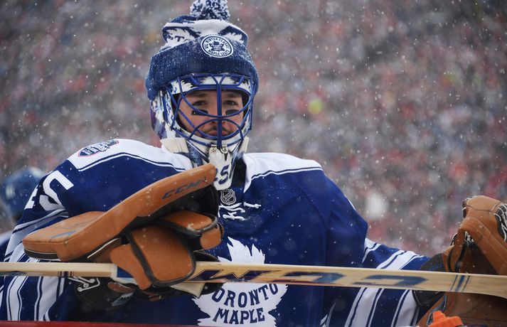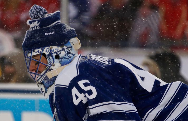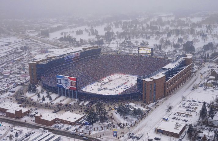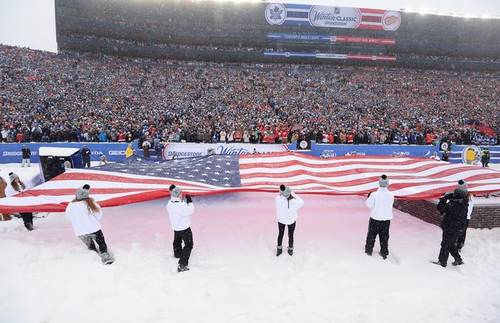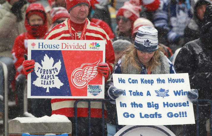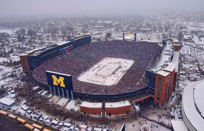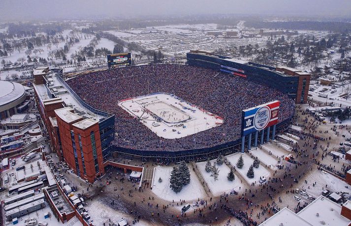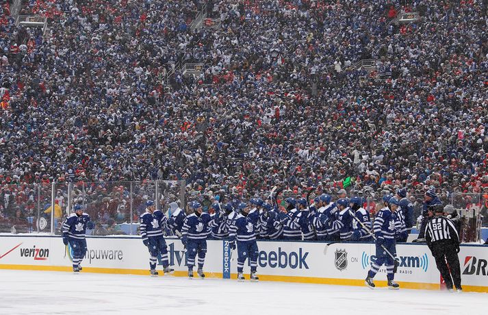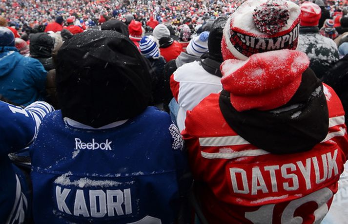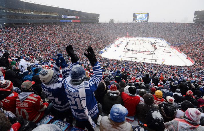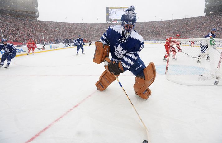 Það var mikil dramatík í sérstökum íshokkíleik á nýársdag þegar Toronto Maple Leafs unnu 3-2 sigur á Detroit Red Wings í NHL-deildinni í leik þar sem úrslitin réðust ekki fyrr en í vítakeppni. Þetta var sögulegur leikur og ekki bara fyrir að þarna voru tvö af stofnliðum NHL-deildarinnar að mætast á fyrsta degi ársins heldur var þarna sett nýtt áhorfendamet á íshokkíleik. Toronto Maple Leafs komst tvisvar yfir í venjulegum leiktíma en Detroit Red Wings jafnaði í bæði skiptin. Ekkert var skorað í framlengingunni en liðsmenn Detroit klikkuðu tvisvar í vítakeppninni og því var sigurinn Toronto Maple Leafs. Leikurinn bar nafnið "2014 NHL Winter Classic" og fór fram utanhúss eða á Michigan leikvanginum í Ann Arbor. Alls komu 105.491 áhorfendur á leikinn og létu kulda (mínus ellefu gráður) og snjókomu trufla sig. Gamla heimsmetið var frá desember 2010 þegar Michigan Wolverines unnu Michigan State Spartans Í háskólaíshokkíinu en um þúsund fleiri mættu á leikinn í gær. Gamla metið á NHL-leik var hinsvegar 71.217 manns á leik árið 2008. Snjókoman gerði reyndar leikmönnum erfitt fyrir á ísnum enda ekki að glíma við venjulegar aðstæður en er þó einn af sex leikjum tímabilsins sem fara fram utandyra. Leikirnir eru hluti af Stadium Series en það verður einnig spilað á Dodger Stadium (Los Angeles), Yankee Stadium (New York, 2 leikir), Soldier Field (Chicago) og BC Place (Vancouver). Hér fyrir neðan má sjá nokkrar skemmtilegar myndir frá þessum sögulega leik í Michigan.Mynd/NordicPhotos/GettyMynd/NordicPhotos/GettyMynd/NordicPhotos/GettyMynd/NordicPhotos/GettyMynd/NordicPhotos/GettyMynd/NordicPhotos/GettyMynd/NordicPhotos/GettyMynd/NordicPhotos/GettyMynd/NordicPhotos/Getty