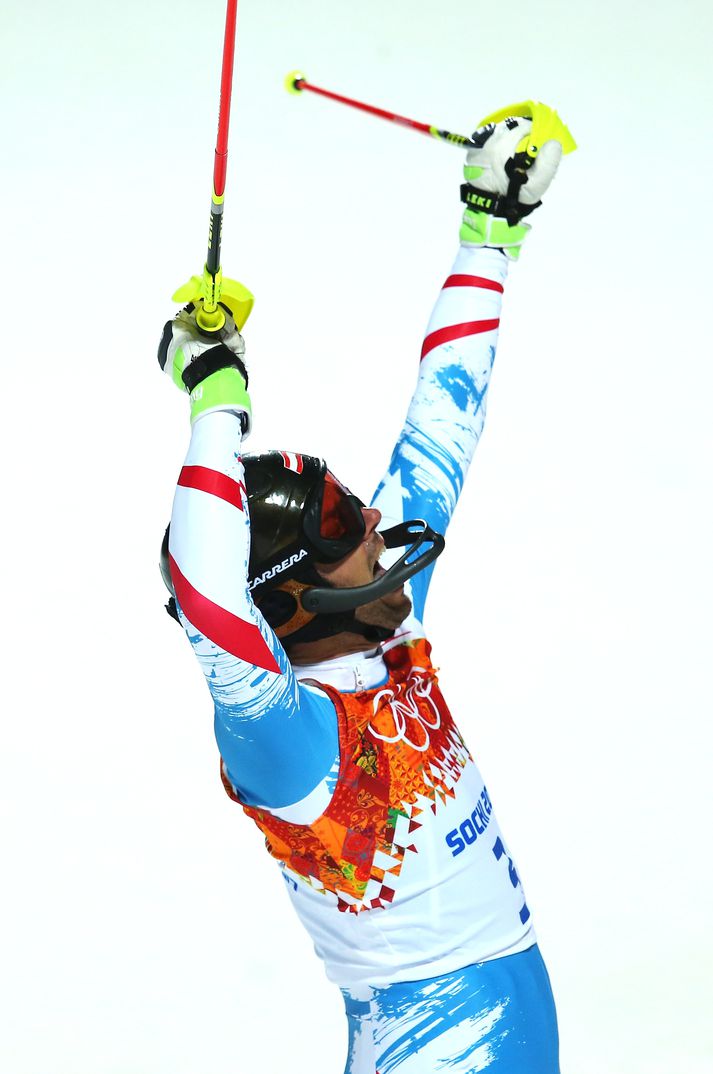 Austurríkismaðurinn Mario Matt tryggði sér gullverðlaun í svigi karla á Vetrarólympíuleikunum í Sotsjí í dag. Hann var með besta tímann eftir fyrri ferðina í morgun og sjötti besti tíminn í seinni ferðinni dugði honum til sigurs. Samanlagður tími Matts var 1:41,84 mínútur. Hann hafði betur í baráttunni við besta svigkappa heims, heimsmeistarann Marcel Hirscher frá Austurríki, sem margir veðjuðu á að myndi vinna gullið í dag. Henrik Kristoffersen, 19 ára gamall Norðmaður, fékk bronsið þrátt fyrir að vera bara með 15. besta tímann í fyrri ferðinni. Hann náði þeim þriðja besta í seinni ferðinni og kom í mark á samanlögðum tíma upp á 1:42,67 mínútur. Brautin var erfið og féllu margir frábærir keppendur úr leik sem hjálpaði Norðmanninum að hirða bronsið en hann gerði vel í að komast niður á eins góðum tíma og raun bar vitni. Kristoffersen er einn allra efnilegasti svigmaður heims en hann vann sitt fyrsta heimsbikarmót í Schladming í Austurríki á dögunum. Með gullinu í dag varð Matt, sem er 34 ára gamall, sá elsti í sögunni til að vinna gullverðlaun í alpagreinum á Vetrarólympíuleikum. Kristofferssen er sá yngsti í sögunni. Sögulegt svig í Sotsjí.Sigri fagnað í endamarkinu í dag.Vísir/Getty