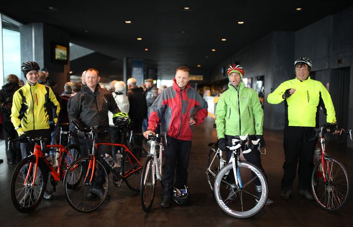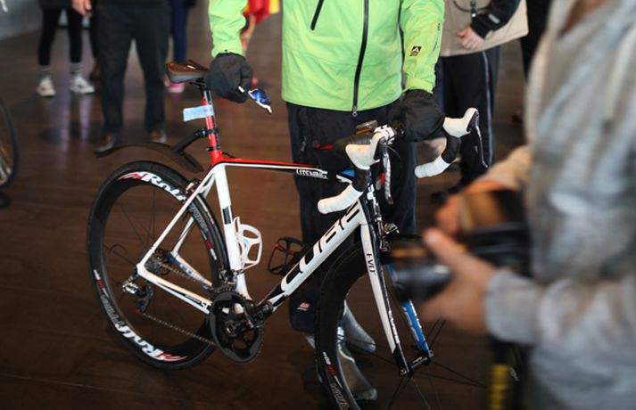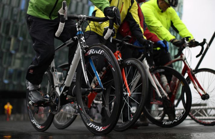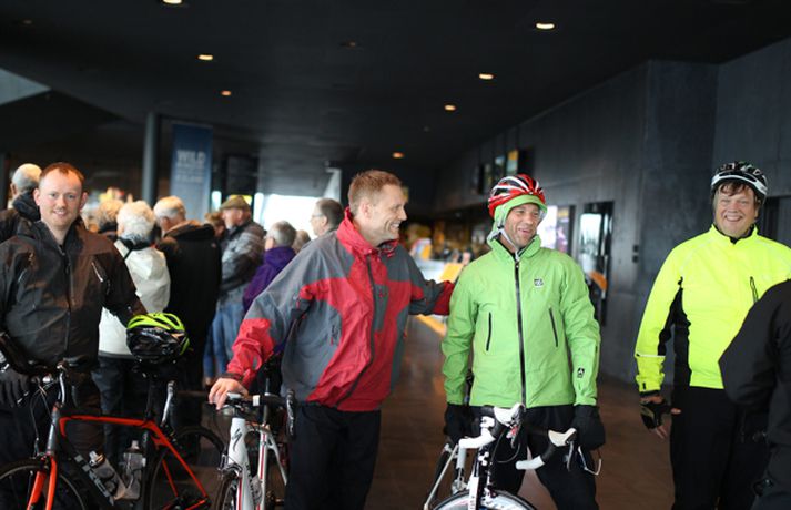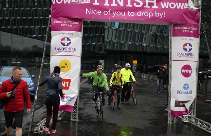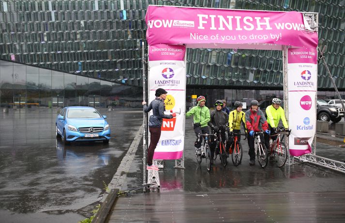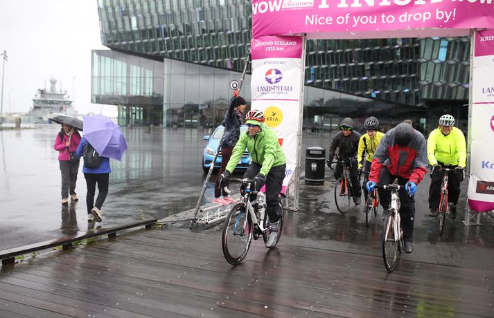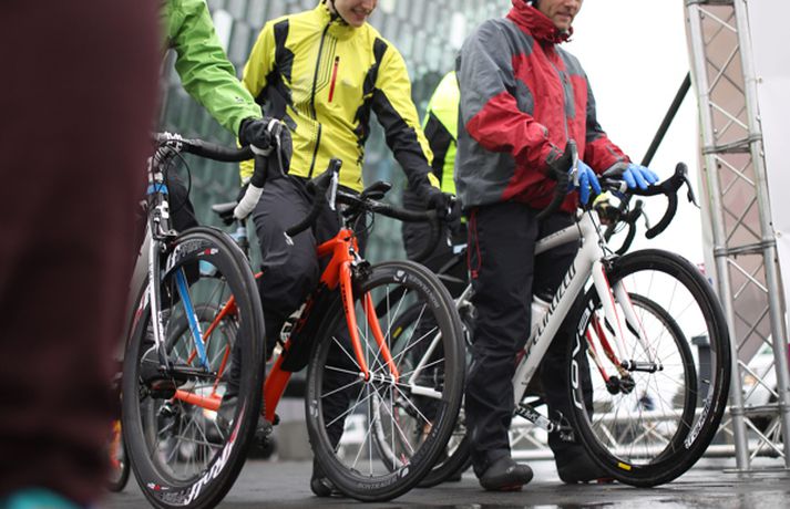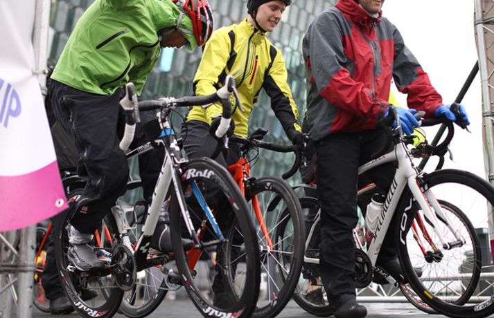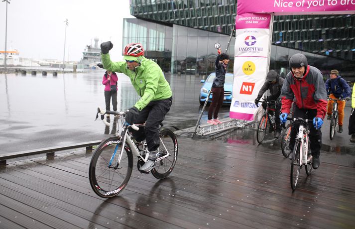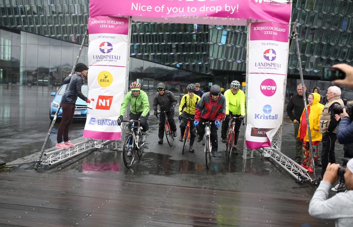 Spennu- og kvíðafiðrildi togast á í mörgum, sem leggja í dag af stað í hjólreiðakeppni hringinn í kringum landið. Markmið WOW Cyclothon er að fá fólk út fyrir þægindarammann og safna um leið áheitum fyrir gott málefni. WOW Cyclothon hjólreiðakeppnin hófst í morgun og stendur yfir fram á föstudag. Hjólað verður með boðsveitaformi hringinn í kringum landið, um Hvalfjörð og yfir Öxi, samtals 1332 kílómetra á innan við 72 tímum. Keppnin er nú haldin í þriðja sinn og taka 520 manns þátt, sem María Ögn Guðmundsdóttir, keppnisstjóri, segir mikla aukningu frá því í fyrra. „Markmiðið með WOW Cyclothon er að fá fólk til að hreyfa sig, fara út fyrir þægindarammann og safna áheitum til styrktar góðu málefni sem er núna bæklunarskurðdeild Landspítalans,“ segir María Ögn.Þegar hafa safnast um fjórar milljónir í áheitasöfnuninni, sem fram fer á heimasíðu keppninnar, wowcyclothon.is. Mikill skortur er á tækjum á bæklunarskurðdeildinni og María kveðst hafa viljað styrkja málefni sem tengdist hjólreiðum. „Það verður að segjast að það eru frístundaslys og þau rata inn á bæklunarskurðdeildina og sú deild hefur ekkii verið að fá mikið af gjöfum hingað til en það er þörf á nýju tæki og mér fannst þetta bara liggja beinast við.“Fjögurra og tíu manna liðin leggja af stað í kvöld en fjórir ofurhugar sem ætla að hjóla hringinn einir síns liðs, lögðu af stað í rigningu og roki í morgun. „Það er mikil tilhlökkun í fólki og margir með bæði kvíðahnút og spennuhnút og vita kannski ekki alveg hvernig þeim á að líða. Margir renna blint í sjóinn og þetta er stórt verkefni. Þetta fer í minningabankann. Þeir vita það sem hafa prófað að taka þátt í WOW Cyclothon að þetta er frekar einstakt.“ Arnþór Birkisson, ljósmyndari Fréttablaðsins og Vísis, var mættur í morgun í Hörpu og tók meðfylgjandi myndir.
