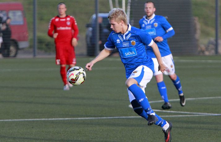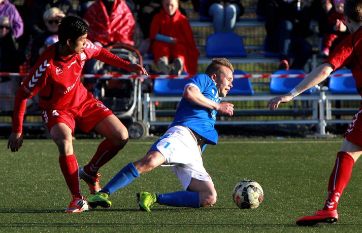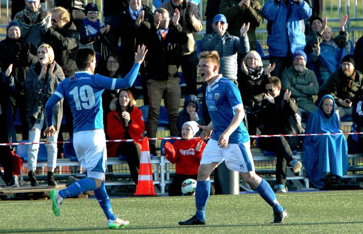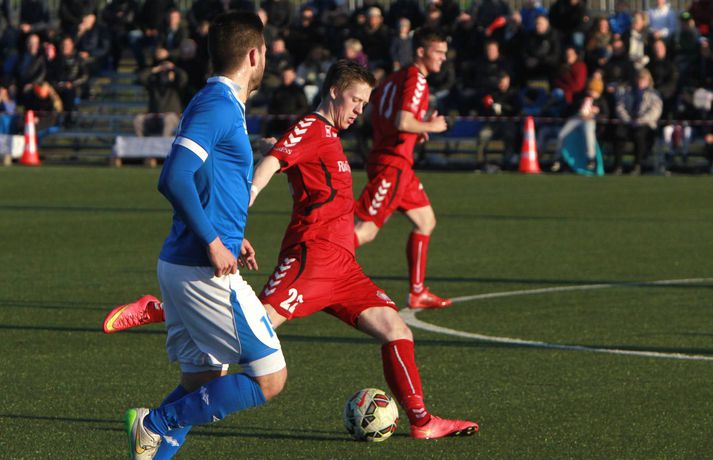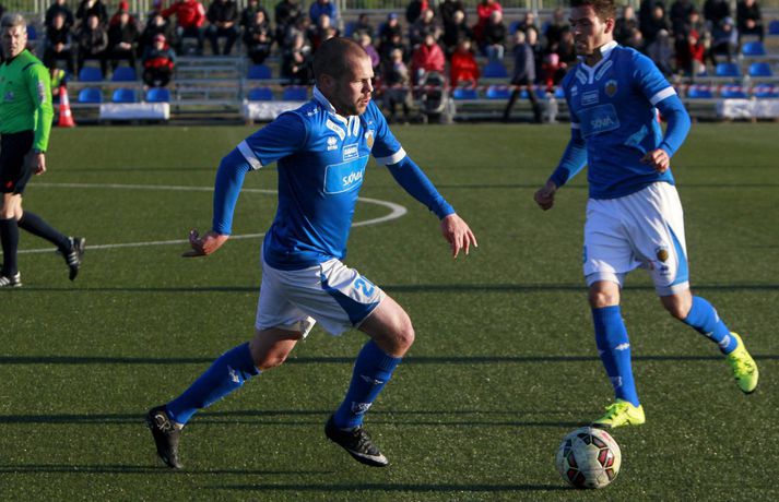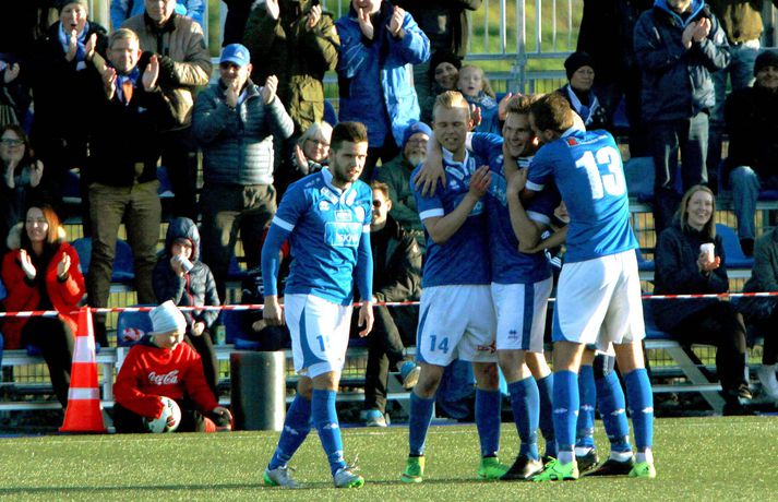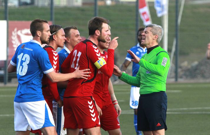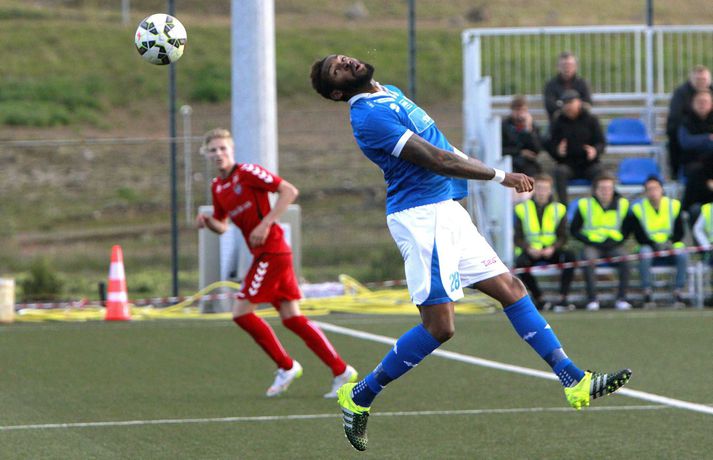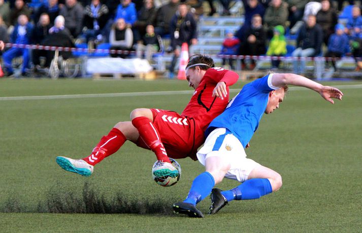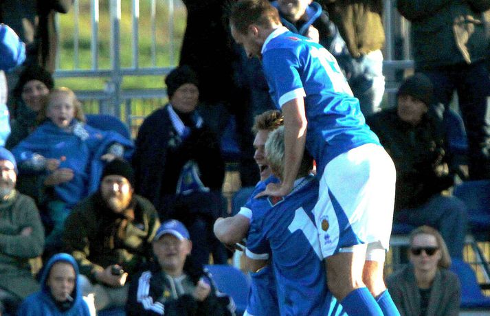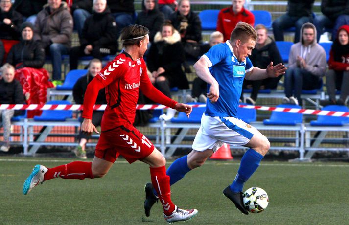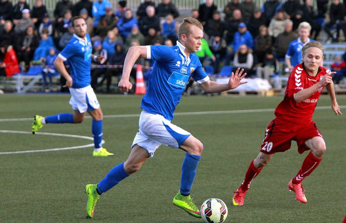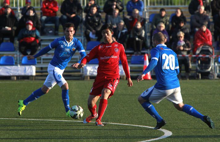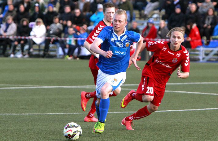 Fram vann mikilvægan 2-0 sigur á Haukum í 1. deildinni í kvöld en þetta var fyrsti sigur lærisveina Péturs Péturssonar í síðustu sjö leikjum. Með sigrinum skaust Fram upp fyrir Selfoss í níunda sætið, fimm stigum fyrir ofan fallsæti. Fram hafði aðeins nælt í þrjú stig í síðustu sex leikjum eftir að hafa unnið þrjá leiki af fjórum á undan því. Fyrir vikið hafði þetta sögufræga félag sogast inn í fallbaráttuna í 1. deild, ári eftir að hafa fallið úr Pepsi-deildinni. Nýjustu leikmenn liðsins virðast ætla að reynast þeim drjúgir en Indriði Áki Þorláksson sem gekk til liðs við Fram á frá FH í júlí skoraði annan leikinn í röð þegar hann kom Fram yfir á 29. mínútu. Atli Fannar Jónsson sem gekk til liðs við Fram á láni frá Víking bætti við öðru marki Fram um miðbik seinni hálfleiksins en Atli gerði endanlega út um leikinn þremur mínútum fyrir leikslok með þriðja marki heimamanna og öðru marki sínu í leiknum. Fram mætir Gróttu í næstu umferð í sannkölluðum botnslag en með sigri getur Fram skilið sig frá botnbaráttuni. Það var heldur betur dramatík þegar Fjarðarbyggð tók á móti Þór á Eskjuvelli í kvöld en á þriggja mínútna kafla í seinni hálfleik komu þrjú mörk og eitt rautt spjald. Jóhann Helgi Hannesson, leikmaður Þórs, kom Fjarðarbyggð yfir þegar hann varð fyrir því óláni að skora sjálfsmark í upphafi seinni hálfleiks en hann átti eftir að bæta upp fyrir það. Þegar korter var til leiksloka náði Kristinn Þór Björnsson að jafna metin fyrir Þór en aðeins mínútu síðar komst Fjarðarbyggð aftur yfir með marki Nik Anthony Chamberlain. Jóhann Helgi bætti upp fyrir mistök sín tveimur mínútum síðar þegar hann jafnaði aftur fyrir hönd Þórs. Jóhann Ragnar Benediktsson, leikmaður Fjarðarbyggðar, fékk rautt spjald eftir markið en gestirnir frá Akureyri náðu ekki að nýta sér liðsmuninn á síðustu mínútum leiksins og lauk leiknum með 2-2 jafntefli.Vísir/Andri Marinó