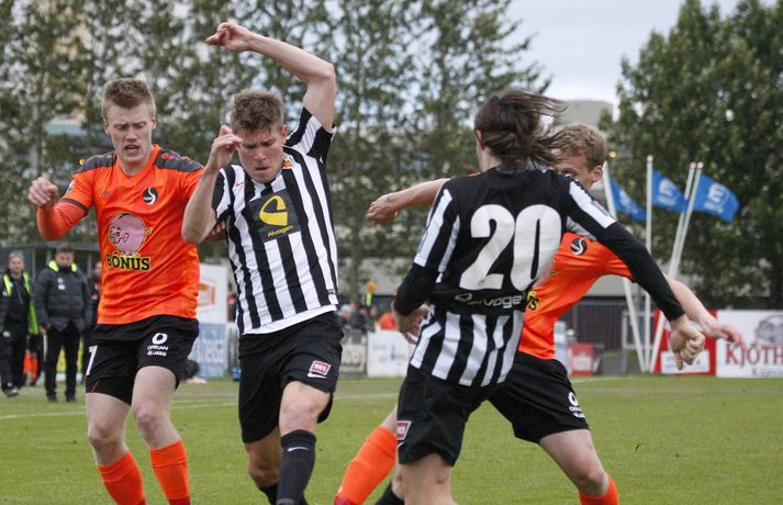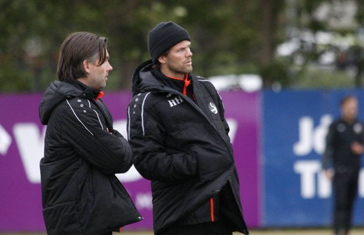 KR hélt í við FH á toppi Pepsi-deildar karla með mikilvægum 2-0 sigri á Fylki í kvöld. Þetta var fyrsta tap Fylkis á útivelli í deildinni í sumar. Fylkir varðist vel lengi en KR náði að brjóta ísinn tíu mínútum fyrir leikslok með marki Þorsteins Más Ragnarssonar. Stuttu síðar innsiglaði Pálmi Rafn Pálmason sigur KR með góðu skoti. Fyrir leikinn mátti búast við þéttum varnarleik Fylkismanna líkt og liðið hefur spilað undir stjórn Hermanns á útivelli í sumar. En engu að síður voru það Árbæingar sem hófu leikinn af miklum krafti. Ásgeir Örn komst í frábært skotfæri strax á annarri mínútu og hefði átt að gera betur en að skjóta beint á Stefán Loga. Fylkismenn náðu þó ekki að viðhalda pressunni allan leikinn og um miðbik hálfleiksins náðu KR-ingar betri tökum á sínu spili og eftir það fór liðið að skapa sér betri færi. Hólmbert Aron var í fínu skallafæri áður en hann þurfti að fara af velli vegna meiðsla. Þorsteinn Már, varamaður hans, kom inn á með fínan kraft og mikla baráttu og komst tvívegis í fín skallafæri en í hitti þó markið í hvorugt skiptið. Raunar átti KR ekki skot á markrammann allan fyrri hálfleikinn og segir það sitt um öflugan varnarleik Fylkismanna. Mikil barátta einkenndi leikinn fremur en falleg knattspyrna og dauðafæri en Valdimar Pálsson, dómari leiksins, átti í miklum vandræðum með að halda jafnvægi í dómgæslunni og gerði lítið annað en að fara í taugarnar í leikmenn og stuðningsmenn beggja liða með tilviljunarkenndum ákvörðunum sínum. KR-ingar komu af miklum krafti út í seinni hálfleikinn og stjórnuðu í raun leiknum allt til loka. Fylkismenn þreyttust á að halda úti þeirri pressu sem leikáætlun Hermanns Hreiðarssonar krafðist og KR-ingar færðust nær því að skora fyrsta markið. Fylkismenn fengu eitt hættulegt færi eftir skyndisókn í upphafi síðari hálfleiksins er Albert Brynjar komst í skotfæri en Stefán Logi varði vel frá honum. Eftir það fór pressa KR-inga segja til sín, hægt og rólega. Fyrirgjafir urðu sífellt hættulegri og eftir eina slíka kom loks fyrsta markið. Varamaðurinn Almarr Ormarsson gaf fyrir á Þorstein Má sem barðist um knöttinn við Ólaf Íshólm, markvörð Fylkis, en boltinn fór af þeim fyrrnefnda og í markið. Pálmi Rafn innsiglaði svo sigurinn sem fyrr segir stuttu síðar er laglegt skot hans hafnaði í netinu. KR-ingar voru meira að segja nálægt því að bæta við þriðja markinu en allt kom fyrir ekki. Sigur KR-inga var sanngjarn, sérstaklega miðað við síðari hálfleik en sjálfsagt hefði það breytt miklu ef Fylkir hefði komist yfir snemma leiks. Fylkismenn fá þó hrós fyrir mikla baráttu og dugnað og þó svo að það hafi verið smá heppnisstimpill yfir fyrra marki KR breytti það öllu fyrir heimamenn að brjóta loksins ísinn. KR-ingar gerðu vel í að halda einbeitingu gegn Fylkismönnum í kvöld. Bæði lið börðust grimmt og sjálfsagt hefðu margir látið skapið hlaupa með sig í gönur, sérstaklega þegar dómari leiksins á erfitt með að halda sinni línu. Valdimar átti þó auðveldar með það í síðari hálfleik en þeim fyrri. Stigin þrjú sem KR vann í kvöld skiptir liðið gríðarlegu miklu máli og eru vesturbæingar í góðum málum enn sem komið er í toppbaráttu deildarinnar. Fylkir er enn í sjöunda sæti en siglir sem fyrr nokkuð lygnan sjó um miðja deild.vísir/antonBjarni: Ekki bara í KR þar sem varamenn eru óánægðir Bjarni Guðjónsson, þjálfari KR, segir það misskilning hjá fréttamönnum að það tíðkist bara í KR að varamenn séu ósáttir við að þurfa að sitja á bekknum. KR-ingar voru lengi að brjóta Fylkismenn á bak aftur en skoruðu tvívegis á síðustu tíu mínútum leiksins. „Þeir voru þéttari til baka en ég bjóst við. Sérstaklega í seinni hálfleik þar sem þeir fóru nánast ekkert af eigin vallarhelmingi. Þeir hafa náð að stríða FH og unnið Breiðablik á þessu herbragði þannig að þetta var eitthvað sem við bjuggumst við.“ Hann segir að KR-ingar hafi náð að mæta baráttunni á miðjunni vel. „Við mættum henni af þeirri hörku sem þurfti. Svo fjaraði hún út og við tók þá gæðin sem búa í liðinu okkar. Við héldum boltanum vel og sérstaklega í seinni hálfleik þegar við náðum að stýra leiknum vel, nýta breiddina og skapa nokkur fín fær.“ Bjarni hafði ávallt trú á því að það kæmi mark hjá KR í leiknum. „Við vorum að reyna réttu hlutina í seinni hálfleik og ég hafði mikla trú á að þetta myndi ganga.“ KR tapaði fyrir Fjölni í síðustu umferð og Bjarni brást við því að hann gerði fjórar breytingar á sínu liði í kvöld. „Við erum að reyna að velja besta liðið hverju sinni gegn þeim andstæðingi sem við mætum hverjum sinni. Því miður gekk það ekki gegn Fjölni en mannskapurinn sem spilaði þá hefði alveg eins getað spilað leikinn í kvöld. Við erum ekki að rótera bara til að rótera og veljum besta liðið sem við höfum í hvern einasta leik.“ Varamannabekkur KR var skipaður öflugum leikmönnum í kvöld en Bjarni segir það ekki erfitt að halda öllum ánægðum. „Auðvitað vilja allir spila. Ég held að það sé misskilningur hjá fréttamönnum að það sé bara í KR þar sem varamenn eru ósáttir við að vera á bekknum. Vissulega er það svo hjá okkur að við erum með góða leikmenn sem allir væru í liðum annars staðar en þessir strákar eru að standa sig vel og ekkert mót eða titill sem vinnst á ellefu manna hóp. Við erum með þéttan átján manna hóp sem stendur sig vel og þeir geta allir komið inn í liðið án þess það veikist mikið.“Pálmi Rafn: Fylkismenn öskrandi og tæklandi Fyrirliði KR átti góðan leik fyrir sína menn í kvöld og skoraði síð