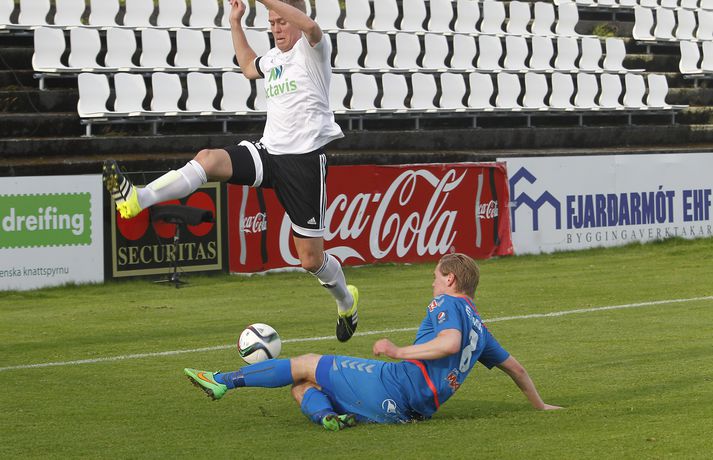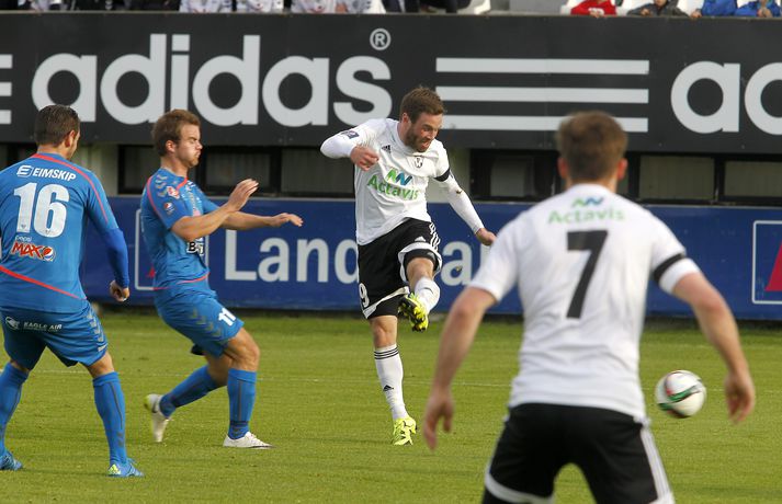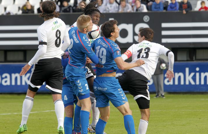FH lagði ÍBV 3-1 á heimavelli sínum í 19. umferð Pepsí deildar karla í fótbolta. Staðan í hálfleik var 1-1. Með sigrinum náði FH átta stiga forystu á toppi deildarinnar þegar níu stig eru í pottinum en ÍBV er enn þremur stigum fyrir ofan fallsæti.Pjetur Sigurðsson, ljósmyndari Vísis og Fréttablaðsins, mætti í Kaplakrika í kvöld og smellti af myndum sem sjá má hér fyrir ofan. Sigurinn var alls ekki eins öruggur og lokatölurnar kunna að gefa til kynna. FH þurfti að hafa mjög mikið fyrir sigrinum og var Þóroddur Hjaltalín dómari leiksins örlagavaldur. FH-ingar voru ekki á eitt sáttir með mark ÍBV en Eyjamenn komust yfir snemma leiks þegar boltinn var sendur á rangstæðan Gunnar Heiðar Þorvaldsson sem rétti upp hendurnar og lét boltann fara þar sem Ian Jeffs nýtti sér að varnarmenn FH stoppuðu og slapp inn fyrir og skoraði. Gunnar Heiðar var fyrir innan en dómurinn líklega réttur því hann lét boltann fara og gaf strax til kynna að hann myndi láta hann vera. Markið virtist vekja lið FH sem kom hálf sofandi inn í leikinn og sóttu FH-ingar mikið eftir markið sem skilaði jöfnunarmarki. Að sama skapi hætti ÍBV að pressa og komst liðið ekki yfir miðju eftir að liðið skoraði, allt þar til í seinni hálfleik. FH byrjaði seinni hálfleikinn betur og komst verðskuldað yfir snemma í hálfleiknum. Líkt og fyrsta markið í fyrri hálfleik vakti FH þá vakti annað mark FH lið ÍBV. Eyjamenn pressuðu stíft á toppliðið eftir markið og kom boltanum inn fyrir línuna á marki FH þar sem Kassim Doumbia sló boltann út. Ótrúlegt en satt dæmdi Þóroddur og aðstoðarmenn hans hvorki mark né vítaspyrnu heldur fékk ÍBV aðeins horn. Skömmu seinna fékk FH vítaspyrnu þar sem StevenLennon gerði út um leikinn með öðru marki sínu. Þar sem aðstoðardómarinn flaggaði ekki mark þegar boltinn fór yfir línuna hefði dómarinn átt að dæma víti og reka Doumbia útaf en segja má að heppnin hafi verið með FH í liði í þetta skiptið. FH getur tryggt sér Íslandsmeistaratitilinn í næstu umferð þegar liðið sækir Breiðablik heim og dugir liðinu stig þar. Heimir: Sýndist þetta vera hendi á KassimVisir/pjeturHeimir: Sýndist þetta vera hendi á Kassim „Það er frábært að aðra umferðina í röð falla leikir með okkur en við gerum okkur grein fyrir því að þetta er ekki komið og það er farsælast að hugsa um sjálfan sig í þessu,“ sagði Heimir Guðjónsson þjálfari FH. Heimir hafði ekkert út á mark ÍBV að setja og sagðist vilja sjá atvikið þegar Kassim ver með hendi í sjónvarpi áður en hann dæmi um það. „Ég held að fyrsta markið hjá ÍBV hafi verið réttur dómur. Ég gat ekki betur séð en hann hætti og reyni ekki við boltann og Jeffs var ekki rangstæður og klárar vel. „Þar sem ég stóð sýndist mér þetta vera hendi á Kassim en ég ætla ekki að vera 100% öruggur fyrr en ég sé það í sjónvarpi.“ Sjónvarpsupptökur sýna að ekki nóg með að Kassim hafi varið með hendi þá gerði hann það eftir að boltinn var kominn í markið. „Ef það er þá hjálpaði það okkur en ekki ÍBV,“ sagði Heimir um þessa ekki dómgæslu. „Við vorum ryðgaðir í byrjun og ÍBV hægði á öllu og tók tíma í allt. Í fyrri hálfleik kýldum við hraðann ekki nógu mikið upp í leiknum. Ég held að Eiki Þorvarðar markmannsþjálfari hafi verið sofnaður á bekknum í fyrri hálfleik, þetta var svo dauft. „Við náðum að kýla þetta upp í seinni hálfleik. Skoruðum góð mörk og kláruðum þetta. „Við verðum að halda áfram og getum ekki fagnað neinu núna. Við sáum það í fyrra í síðasta leik og sáum það 2008 þegar FH og Keflavík voru að berjast um titilinn að það er stutt á milli í fótbolta. Menn verða að vera klárir,“ sagði Heimir sem bætti við að FH mun ekki fara inn í leikinn gegn Breiðabliki til að leika upp á jafntefli. „Við eigum eftir að leggja þann leik upp en við förum ekki í Kópavoginn til að spila upp á jafntefli. Ef við gerum það þá lendum við í veseni. Einu mennirnir sem eru farnir að fagna sigri FH eru þið blaðamenn,“ sagði Heimir að lokum.Visir/pjeturÁsmundur: Þetta er sjokkerandi „Ég er svekktur. Mér fannst við koma vel inn í þennan leik og skorum gott mark. Heilt yfir er ég ánægður með leik minna manna,“ sagði Ásmundur Arnarsson þjálfari ÍBV. „Það voru kaflar þar sem við féllum of langt aftur, vorum of langt frá þeim og gáfum þeim of mikinn tíma sem við ætluðum ekki að gera.“ Ásmundur var ekki í nokkrum vafa um að mark ÍBV hafi verið löglegt, í það minnsta eins og hann þekkir reglurnar. „Eru ekki reglurnar þannig að þú þarft að taka boltann til þess að vera dæmdur? Ég held að þetta sé löglegt eins og þetta er. Svo má deila um það hvort reglurnar eigi að vera svona,“ sagði Ásmundur sem var ekki eins sáttur við „seinna“ mark ÍBV sem ekki var dæmt gilt þó hann vildi sem minnst tjá sig um það. „Verður maður ekki bara að segja no comment og tala um eitthvað annað en dómarann í þessu? Þetta er sjokkerandi. Það er ótrúlegt að enginn í dómarateyminu sjái þetta,“ sagði Ásmundur sem vildi ekki segja meira um þetta. „Við áttum fína kafla í þessum leik sem við getum byggt ofan á, gegn toppliðinu, verðandi meisturum. Við gefum þeim fínan leik en þetta augnablik sem þið nefnið og auðveld vítaspyrna hinum megin þar sem dómarinn er fljótur að dæma þó hendurnar séu alveg upp við líkamann af hálfs meters færi. Þetta eru augnablik sem taka vopnin úr okkar höndum og leikurinn fjarar út.“ Leiknir tapaði á sama tíma og því er ÍBV enn þremur stigum frá fallsæti þegar þrjár umferðir eru eftir af Íslandsmótinu. „Þetta er í okkar höndum. Við þurfum að tína inn 