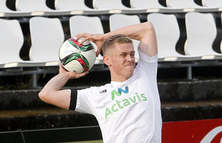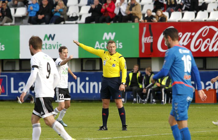 Umfjöllun, viðtöl, myndir og einkunnir: FH - ÍBV 3-1 | Sjöundi sigur FH í röð Guðmundur Marinó Ingvarsson í Kaplakrika skrifar 13. september 2015 00:01 Þóroddur Hjaltalín var í sviðsljósinu. Visir/pjetur FH lagði ÍBV 3-1 á heimavelli sínum í 19. umferð Pepsí deildar karla í fótbolta. Staðan í hálfleik var 1-1. Með sigrinum náði FH átta stiga forystu á toppi deildarinnar þegar níu stig eru í pottinum en ÍBV er enn þremur stigum fyrir ofan fallsæti.Pjetur Sigurðsson, ljósmyndari Vísis og Fréttablaðsins, mætti í Kaplakrika í kvöld og smellti af myndum sem sjá má hér fyrir ofan. Sigurinn var alls ekki eins öruggur og lokatölurnar kunna að gefa til kynna. FH þurfti að hafa mjög mikið fyrir sigrinum og var Þóroddur Hjaltalín dómari leiksins örlagavaldur. FH-ingar voru ekki á eitt sáttir með mark ÍBV en Eyjamenn komust yfir snemma leiks þegar boltinn var sendur á rangstæðan Gunnar Heiðar Þorvaldsson sem rétti upp hendurnar og lét boltann fara þar sem Ian Jeffs nýtti sér að varnarmenn FH stoppuðu og slapp inn fyrir og skoraði. Gunnar Heiðar var fyrir innan en dómurinn líklega réttur því hann lét boltann fara og gaf strax til kynna að hann myndi láta hann vera. Markið virtist vekja lið FH sem kom hálf sofandi inn í leikinn og sóttu FH-ingar mikið eftir markið sem skilaði jöfnunarmarki. Að sama skapi hætti ÍBV að pressa og komst liðið ekki yfir miðju eftir að liðið skoraði, allt þar til í seinni hálfleik. FH byrjaði seinni hálfleikinn betur og komst verðskuldað yfir snemma í hálfleiknum. Líkt og fyrsta markið í fyrri hálfleik vakti FH þá vakti annað mark FH lið ÍBV. Eyjamenn pressuðu stíft á toppliðið eftir markið og kom boltanum inn fyrir línuna á marki FH þar sem Kassim Doumbia sló boltann út. Ótrúlegt en satt dæmdi Þóroddur og aðstoðarmenn hans hvorki mark né vítaspyrnu heldur fékk ÍBV aðeins horn. Skömmu seinna fékk FH vítaspyrnu þar sem StevenLennon gerði út um leikinn með öðru marki sínu. Þar sem aðstoðardómarinn flaggaði ekki mark þegar boltinn fór yfir línuna hefði dómarinn átt að dæma víti og reka Doumbia útaf en segja má að heppnin hafi verið með FH í liði í þetta skiptið. FH getur tryggt sér Íslandsmeistaratitilinn í næstu umferð þegar liðið sækir Breiðablik heim og dugir liðinu stig þar. Heimir: Sýndist þetta vera hendi á KassimVisir/pjeturHeimir: Sýndist þetta vera hendi á Kassim „Það er frábært að aðra umferðina í röð falla leikir með okkur en við gerum okkur grein fyrir því að þetta er ekki komið og það er farsælast að hugsa um sjálfan sig í þessu,“ sagði Heimir Guðjónsson þjálfari FH. Heimir hafði ekkert út á mark ÍBV að setja og sagðist vilja sjá atvikið þegar Kassim ver með hendi í sjónvarpi áður en hann dæmi um það. „Ég held að fyrsta markið hjá ÍBV hafi verið réttur dómur. Ég gat ekki betur séð en hann hætti og reyni ekki við boltann og Jeffs var ekki rangstæður og klárar vel. „Þar sem ég stóð sýndist mér þetta vera hendi á Kassim en ég ætla ekki að vera 100% öruggur fyrr en ég sé það í sjónvarpi.“ Sjónvarpsupptökur sýna að ekki nóg með að Kassim hafi varið með hendi þá gerði hann það eftir að boltinn var kominn í markið. „Ef það er þá hjálpaði það okkur en ekki ÍBV,“ sagði Heimir um þessa ekki dómgæslu. „Við vorum ryðgaðir í byrjun og ÍBV hægði á öllu og tók tíma í allt. Í fyrri hálfleik kýldum við hraðann ekki nógu mikið upp í leiknum. Ég held að Eiki Þorvarðar markmannsþjálfari hafi verið sofnaður á bekknum í fyrri hálfleik, þetta var svo dauft. „Við náðum að kýla þetta upp í seinni hálfleik. Skoruðum góð mörk og kláruðum þetta. „Við verðum að halda áfram og getum ekki fagnað neinu núna. Við sáum það í fyrra í síðasta leik og sáum það 2008 þegar FH og Keflavík voru að berjast um titilinn að það er stutt á milli í fótbolta. Menn verða að vera klárir,“ sagði Heimir sem bætti við að FH mun ekki fara inn í leikinn gegn Breiðabliki til að leika upp á jafntefli. „Við eigum eftir að leggja þann leik upp en við förum ekki í Kópavoginn til að spila upp á jafntefli. Ef við gerum það þá lendum við í veseni. Einu mennirnir sem eru farnir að fagna sigri FH eru þið blaðamenn,“ sagði Heimir að lokum.Visir/pjeturÁsmundur: Þetta er sjokkerandi „Ég er svekktur. Mér fannst við koma vel inn í þennan leik og skorum gott mark. Heilt yfir er ég ánægður með leik minna manna,“ sagði Ásmundur Arnarsson þjálfari ÍBV. „Það voru kaflar þar sem við féllum of langt aftur, vorum of langt frá þeim og gáfum þeim of mikinn tíma sem við ætluðum ekki að gera.“ Ásmundur var ekki í nokkrum vafa um að mark ÍBV hafi verið löglegt, í það minnsta eins og hann þekkir reglurnar. „Eru ekki reglurnar þannig að þú þarft að taka boltann til þess að vera dæmdur? Ég held að þetta sé löglegt eins og þetta er. Svo má deila um það hvort reglurnar eigi að vera svona,“ sagði Ásmundur sem var ekki eins sáttur við „seinna“ mark ÍBV sem ekki var dæmt gilt þó hann vildi sem minnst tjá sig um það. „Verður maður ekki bara að segja no comment og tala um eitthvað annað en dómarann í þessu? Þetta er sjokkerandi. Það er ótrúlegt að enginn í dómarateyminu sjái þetta,“ sagði Ásmundur sem vildi ekki segja meira um þetta. „Við áttum fína kafla í þessum leik sem við getum byggt ofan á, gegn toppliðinu, verðandi meisturum. Við gefum þeim fínan leik en þetta augnablik sem þið nefnið og auðveld vítaspyrna hinum megin þar sem dómarinn er fljótur að dæma þó hendurnar séu alveg upp við líkamann af hálfs meters færi. Þetta eru augnablik sem taka vopnin úr okkar höndum o