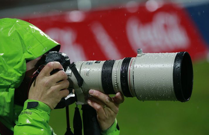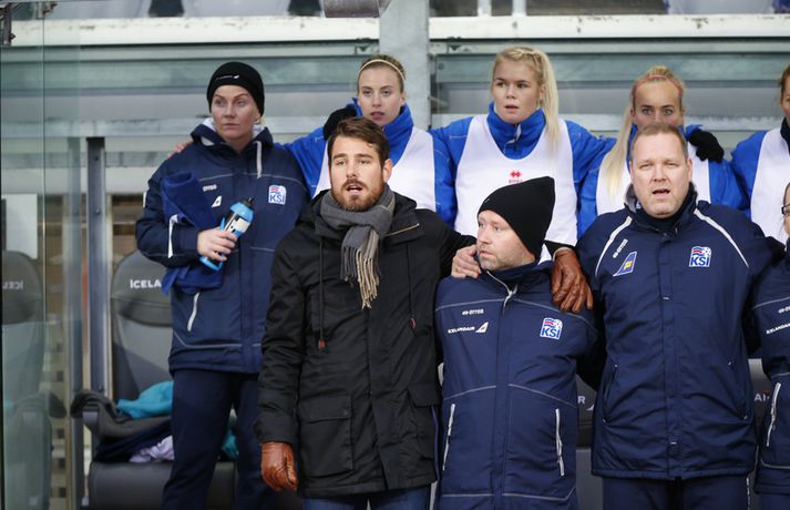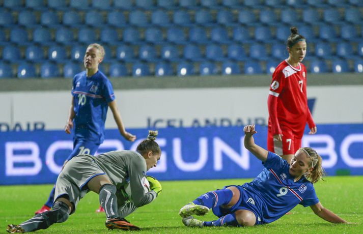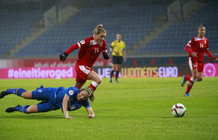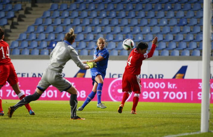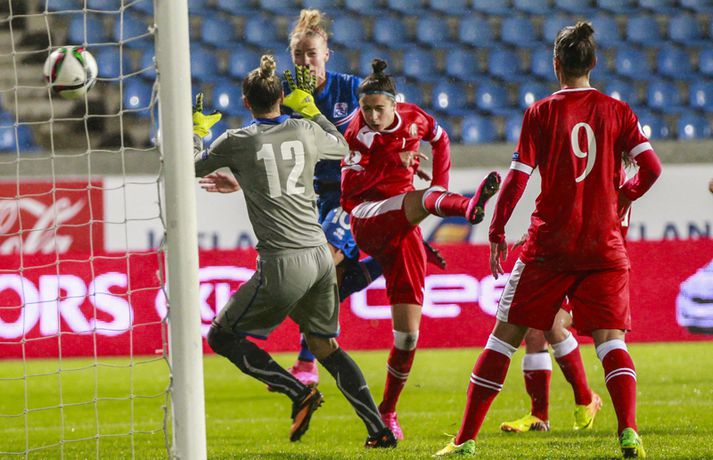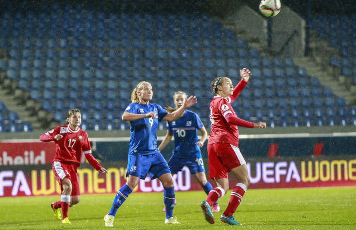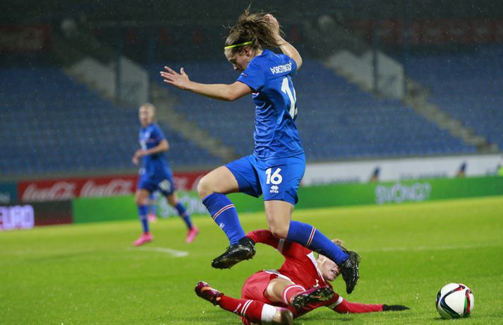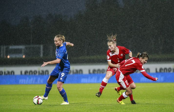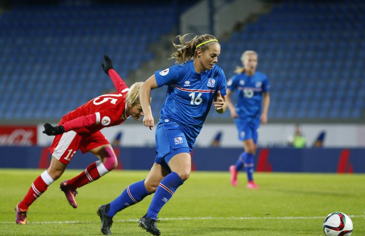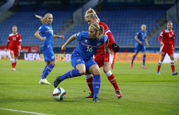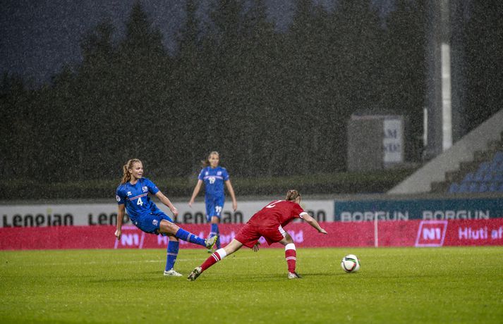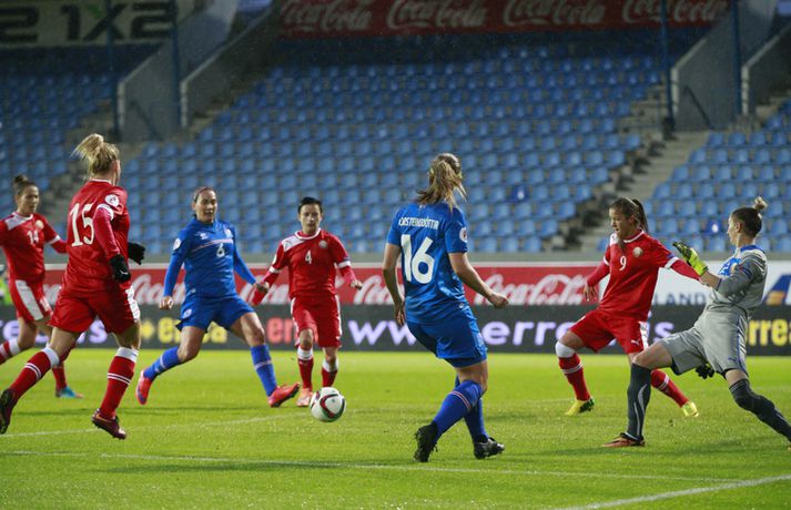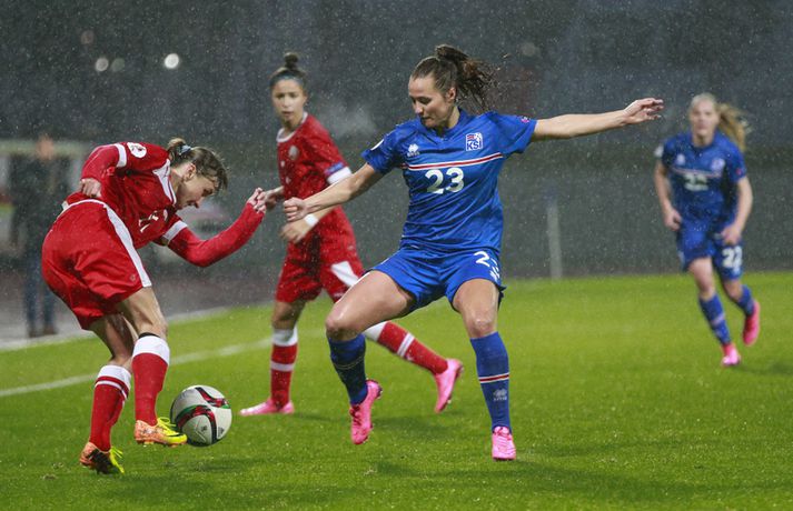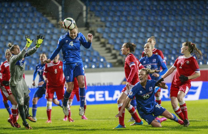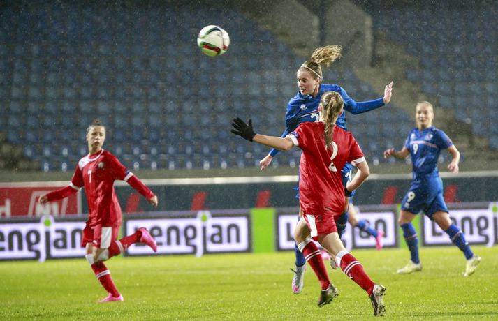 Íslenska landsliðið steig í kvöld fyrsta skrefið í átt að lokakeppni EM 2017 í Hollandi með öruggum 2-0 sigri á Hvíta-Rússlandi í fyrsta leik sínum í undankeppninni á Laugardalsvelli.Vilhelm Gunnarsson, ljósmyndari Vísis og Fréttablaðsins, var á leiknum á Laugardalsvellinum í kvöld og náði þessum myndum hér fyrir ofan. Íslenska liðið var miklu sterkari aðilinn í leiknum og hefði með réttu átt að vinna mun stærri sigur. Mörkin urðu aðeins tvö og komu í sitthvorum hálfleiknum. Hólmfríður Magnúsdóttir kom Íslandi yfir á 30. mínútu eftir góða skyndisókn og sendingu Hörpu Þorsteinsdóttur. Dagný Brynjarsdóttir bætti öðru marki við á 73. mínútu með skalla eftir fyrirgjöf Hallberu Gísladóttur sem átti frábæran leik í stöðu vinstri bakvarðar. Margrét Lára Viðarsdóttir lék sinn 100. landsleik í kvöld og hún fékk upplagt tækifæri til að skora í tímamótaleiknum en skaut yfir úr vítaspyrnu á 79. mínútu. Munurinn á Íslandi og Hvíta-Rússlandi er mikill og það sást bersýnislega í ljós í kvöld. Íslenska liðið er einfaldlega miklu sterkara en það hvít-rússneska og sýndi það í þessum leik. Íslensku stelpurnar komu framarlega á völlinn og pressuðu vörn Hvít-Rússa stíft. Gestirnir höfðu fá svör við þessari pressu íslenska liðið og enduðu oftast á því að þruma boltanum fram, beint á leikmenn íslenska liðsins sem hófu strax nýja sókn. Hvít-Rússarnir höfðu engin sóknarvopn og íslenska vörnin átti afar náðugt kvöld. Eina hættan sem skapaðist upp við íslenska markið kom eftir fáránlega sendingu Önnu Bjarkar Kristjánsdóttur til baka. Anna Pilipenko komst inn í sendinguna en Guðbjörg Gunnarsdóttir var fljót út úr markinu og bjargaði. Íslenska liðsins var meira og minna með boltann í fyrri hálfleik og skapaði sér nóg af færum, bæði í opnum leik og eftir föst leikatriði. Glódís Perla Viggósdóttir og Dagný fengu báðar góð færi eftir föst leikatriði á fyrstu 10 mínútum leiksins og á 13. mínútu fékk Anna Björk dauðafæri eftir aukaspyrnu en þrumaði boltanum hátt yfir. Á 24. mínútu átti Hólmfríður svo fremur slakt skot beint á markið eftir frábæran sprett. Fanndís Friðriksdóttir hefði auk þess átt fá að vítaspyrnu á 22. mínútu þegar hún skaut í hendi varnarmanns Hvít-Rússa en slakur dómari leiksins, Marija Kurtes, dæmdi ekkert. Fanndís hefði einnig getað fengið víti eftir 35 mínútur en Kurtes lét sér aftur fátt um finnast. Það sama var uppi á teningnum í seinni hálfleik. Íslenska liðið sótti og sótti en tókst ekki að koma boltanum yfir línuna framan af hálfleiknum. Harpa fékk nokkur ákjósanleg færi en henni voru mislagðar fætur inni í vítateignum. Margrét Lára og Sara Björk áttu einnig fínar tilraunir og Hólmfríður fékk svo sannkallað dauðafæri á 69. mínútu en skallaði framhjá eftir frábæra fyrirgjöf Fanndísar. Annað markið lét bíða eftir sér en kom loks á 73. mínútu. Hallbera átti þá enn eina gullsendinguna inn á teiginn og Dagný gerði það sem hún gerir best, skilaði sér inn á teiginn og skallaði boltann af öryggi framhjá Ekaterina Kovalchuk í marki Hvít-Rússa. Berglind Björg Þorvaldsdóttir kom inn á sem varamaður fyrir Hörpu á 70. mínútu og sex mínútum síðar hefði hún svo átt að koma íslenska liðinu í 3-0 þegar hún skallaði framhjá úr dauðafæri eftir fyrirgjöf Hólmfríðar. Margrét Lára fékk svo enn betra færi til að skora þriðja markið á 79. mínútu en skaut hátt yfir úr vítaspyrnu sem dæmd var eftir að skot Hallberu fór í hendi varnarmanns gestanna. Íslenska liðið fékk fleiri færi til að bæta við forskotið en nýtti þau ekki. Niðurstaðan samt öruggur íslenskur sigur sem hefði að ósekju mátt vera talsvert stærri. En stigin þrjú er það sem skiptir mestu máli.Glódís Perla Viggósdóttir.Vísir/VilhelmGlódís: Þakklát fyrir stuðninginn Glódís Perla Viggósdóttir átti frábæran leik þegar Ísland lagði Hvíta-Rússland með tveimur mörkum gegn engu í fyrsta leik sínum í undankeppni EM 2017 í kvöld. Hún var að vonum ánægð þegar hún ræddi við blaðamenn eftir leikinn. "Ég er rosalega ánægð með þennan sigur og það skiptir miklu máli að fara vel af stað, halda hreinu og skora tvö mörk," sagði Glódís sem sagði verkefni dagsins hafa verið erfitt. "Þetta var rosalega erfiður leikur þannig séð því þær pökkuðu bara í vörn. En við héldum þolinmæðinni og skoruðum tvö góð mörk. "Við hefðum getað skorað fleiri mörk en stundum eru þessir leikir svona. Grasið var erfitt og það var pínu erfitt að spila boltanum í bleytunni en við leystum þetta vel." Glódís þurfti sjaldan að verjast í kvöld en Hvít-Rússar buðu ekki upp á merkilegan sóknarleik. Þess í stað var Glódís oft í því hlutverki að bera boltann upp og átti margar góðar sendingar á framherja íslenska liðsins. "Ég lendi ekki oft í þessu en það var bara gaman að fá að vera aðeins meira með í spilinu," sagði Glódís sem fannst íslenska liðinu ganga vel að halda einbeitingu í varnarleiknum þrátt fyrir að munurinn á liðunum væri mikil. "Það gekk alveg vel og við vissum að við þyrftum að vera tilbúnar því þær eiga alveg sínar skyndisóknir. En svo vorum við oft að vinna boltann framarlega á vellinum sem er mjög jákvætt." Stemmingin á Laugardalsvellinum í kvöld var með besta móti en Tólfan lét vel í sér heyra. Glódís kvaðst þakklát fyrir stuðninginn sem íslenska liðið fékk í kvöld. "Ég er ótrúlega ánægð með og þakklát fyrir stuðninginn. Það skiptir svo miklu máli. Það er ekki oft sem maður lendir í því að heyra varla í samherjunum vegna þess hversu hátt það heyrðist í áhorfendum. Þetta var frábæ