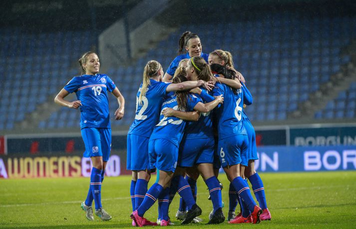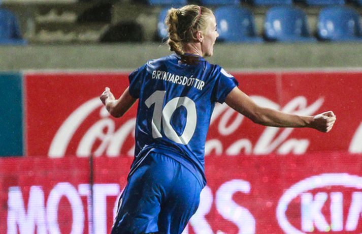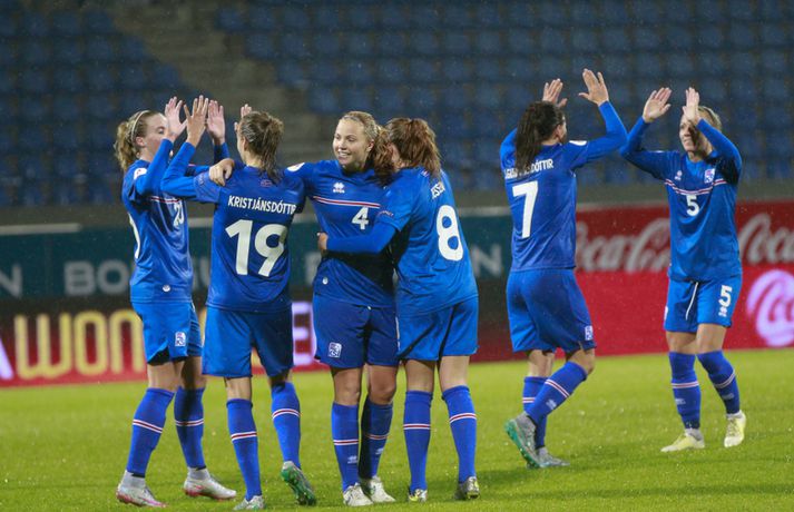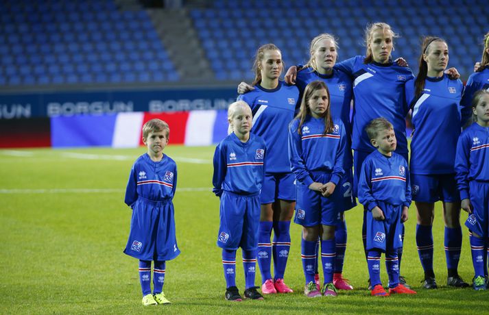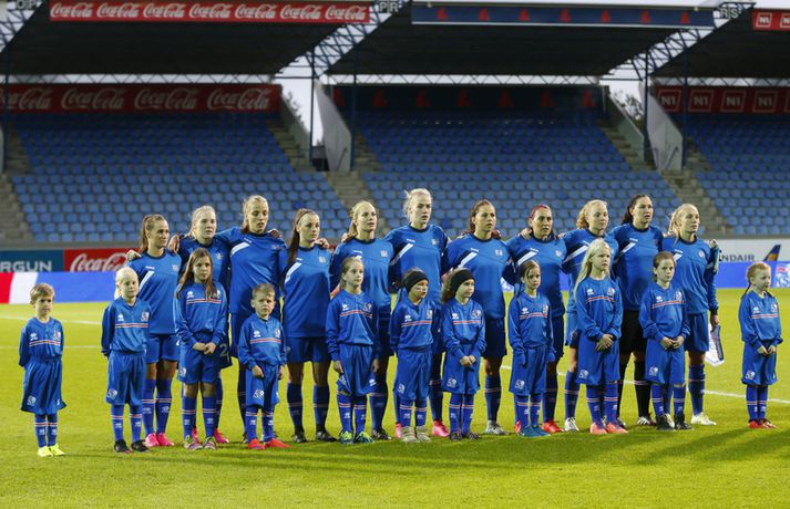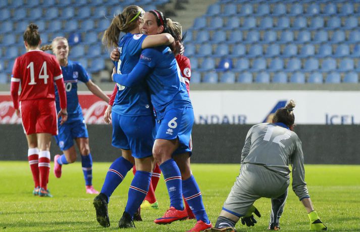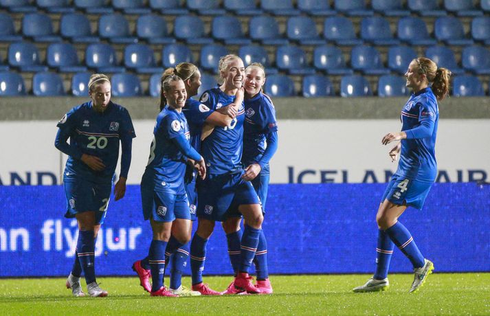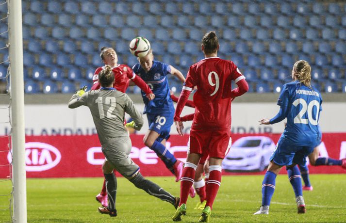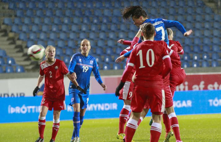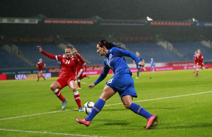 Umfjöllun, viðtöl og myndir: Ísland - Hvíta-Rússland 2-0 | Stelpurnar með öruggan sigur í 100. leik Margrétar Láru Tómas Þór Þórðarson og Ingvi Þór Sæmundsson á Laugardalsvelli skrifar 22. september 2015 21:30 Íslenska landsliðið steig í kvöld fyrsta skrefið í átt að lokakeppni EM 2017 í Hollandi með öruggum 2-0 sigri á Hvíta-Rússlandi í fyrsta leik sínum í undankeppninni á Laugardalsvelli.Vilhelm Gunnarsson, ljósmyndari Vísis og Fréttablaðsins, var á leiknum á Laugardalsvellinum í kvöld og náði þessum myndum hér fyrir ofan. Íslenska liðið var miklu sterkari aðilinn í leiknum og hefði með réttu átt að vinna mun stærri sigur. Mörkin urðu aðeins tvö og komu í sitthvorum hálfleiknum. Hólmfríður Magnúsdóttir kom Íslandi yfir á 30. mínútu eftir góða skyndisókn og sendingu Hörpu Þorsteinsdóttur. Dagný Brynjarsdóttir bætti öðru marki við á 73. mínútu með skalla eftir fyrirgjöf Hallberu Gísladóttur sem átti frábæran leik í stöðu vinstri bakvarðar. Margrét Lára Viðarsdóttir lék sinn 100. landsleik í kvöld og hún fékk upplagt tækifæri til að skora í tímamótaleiknum en skaut yfir úr vítaspyrnu á 79. mínútu. Munurinn á Íslandi og Hvíta-Rússlandi er mikill og það sást bersýnislega í ljós í kvöld. Íslenska liðið er einfaldlega miklu sterkara en það hvít-rússneska og sýndi það í þessum leik. Íslensku stelpurnar komu framarlega á völlinn og pressuðu vörn Hvít-Rússa stíft. Gestirnir höfðu fá svör við þessari pressu íslenska liðið og enduðu oftast á því að þruma boltanum fram, beint á leikmenn íslenska liðsins sem hófu strax nýja sókn. Hvít-Rússarnir höfðu engin sóknarvopn og íslenska vörnin átti afar náðugt kvöld. Eina hættan sem skapaðist upp við íslenska markið kom eftir fáránlega sendingu Önnu Bjarkar Kristjánsdóttur til baka. Anna Pilipenko komst inn í sendinguna en Guðbjörg Gunnarsdóttir var fljót út úr markinu og bjargaði. Íslenska liðsins var meira og minna með boltann í fyrri hálfleik og skapaði sér nóg af færum, bæði í opnum leik og eftir föst leikatriði. Glódís Perla Viggósdóttir og Dagný fengu báðar góð færi eftir föst leikatriði á fyrstu 10 mínútum leiksins og á 13. mínútu fékk Anna Björk dauðafæri eftir aukaspyrnu en þrumaði boltanum hátt yfir. Á 24. mínútu átti Hólmfríður svo fremur slakt skot beint á markið eftir frábæran sprett. Fanndís Friðriksdóttir hefði auk þess átt fá að vítaspyrnu á 22. mínútu þegar hún skaut í hendi varnarmanns Hvít-Rússa en slakur dómari leiksins, Marija Kurtes, dæmdi ekkert. Fanndís hefði einnig getað fengið víti eftir 35 mínútur en Kurtes lét sér aftur fátt um finnast. Það sama var uppi á teningnum í seinni hálfleik. Íslenska liðið sótti og sótti en tókst ekki að koma boltanum yfir línuna framan af hálfleiknum. Harpa fékk nokkur ákjósanleg færi en henni voru mislagðar fætur inni í vítateignum. Margrét Lára og Sara Björk áttu einnig fínar tilraunir og Hólmfríður fékk svo sannkallað dauðafæri á 69. mínútu en skallaði framhjá eftir frábæra fyrirgjöf Fanndísar. Annað markið lét bíða eftir sér en kom loks á 73. mínútu. Hallbera átti þá enn eina gullsendinguna inn á teiginn og Dagný gerði það sem hún gerir best, skilaði sér inn á teiginn og skallaði boltann af öryggi framhjá Ekaterina Kovalchuk í marki Hvít-Rússa. Berglind Björg Þorvaldsdóttir kom inn á sem varamaður fyrir Hörpu á 70. mínútu og sex mínútum síðar hefði hún svo átt að koma íslenska liðinu í 3-0 þegar hún skallaði framhjá úr dauðafæri eftir fyrirgjöf Hólmfríðar. Margrét Lára fékk svo enn betra færi til að skora þriðja markið á 79. mínútu en skaut hátt yfir úr vítaspyrnu sem dæmd var eftir að skot Hallberu fór í hendi varnarmanns gestanna. Íslenska liðið fékk fleiri færi til að bæta við forskotið en nýtti þau ekki. Niðurstaðan samt öruggur íslenskur sigur sem hefði að ósekju mátt vera talsvert stærri. En stigin þrjú er það sem skiptir mestu máli.Glódís Perla Viggósdóttir.Vísir/VilhelmGlódís: Þakklát fyrir stuðninginn Glódís Perla Viggósdóttir átti frábæran leik þegar Ísland lagði Hvíta-Rússland með tveimur mörkum gegn engu í fyrsta leik sínum í undankeppni EM 2017 í kvöld. Hún var að vonum ánægð þegar hún ræddi við blaðamenn eftir leikinn. "Ég er rosalega ánægð með þennan sigur og það skiptir miklu máli að fara vel af stað, halda hreinu og skora tvö mörk," sagði Glódís sem sagði verkefni dagsins hafa verið erfitt. "Þetta var rosalega erfiður leikur þannig séð því þær pökkuðu bara í vörn. En við héldum þolinmæðinni og skoruðum tvö góð mörk. "Við hefðum getað skorað fleiri mörk en stundum eru þessir leikir svona. Grasið var erfitt og það var pínu erfitt að spila boltanum í bleytunni en við leystum þetta vel." Glódís þurfti sjaldan að verjast í kvöld en Hvít-Rússar buðu ekki upp á merkilegan sóknarleik. Þess í stað var Glódís oft í því hlutverki að bera boltann upp og átti margar góðar sendingar á framherja íslenska liðsins. "Ég lendi ekki oft í þessu en það var bara gaman að fá að vera aðeins meira með í spilinu," sagði Glódís sem fannst íslenska liðinu ganga vel að halda einbeitingu í varnarleiknum þrátt fyrir að munurinn á liðunum væri mikil. "Það gekk alveg vel og við vissum að við þyrftum að vera tilbúnar því þær eiga alveg sínar skyndisóknir. En svo vorum við oft að vinna boltann framarlega á vellinum sem er mjög jákvætt." Stemmingin á Laugardalsvellinum í kvöld var með besta móti en Tólfan lét vel í sér heyra. Glódís kvaðst þakklát fyrir stuðninginn sem íslenska liðið fékk í kvöld. "Ég er ótrúleg