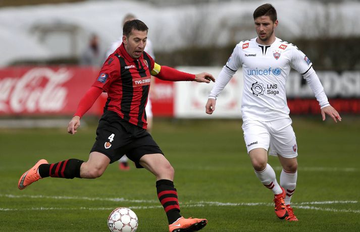 Víkingur Reykjavík er enn án sigurs í Pepsi-deildinni eftir 2-2 jafntefli gegn Val á heimavelli í kvöld en varamaðurinn Óttar Magnús Bjarnason tryggði heimamönnum stig með góðum skalla stuttu fyrir leikslok.Vilhelm Gunnarsson, ljósmyndari Fréttablaðsins og Vísis, var á Víkingsvelli og tók meðfylgjandi myndir. Víkingar voru betri í fyrri hálfleik og leiddu verðskuldað í hálfleik 1-0 eftir mark frá Alex Frey Hilmarssyni en Valsmönnum tókst mun betur að skapa sér færi í seinni hálfleik og var Haukur Páll Sigurðsson allt í öllu í sóknarleik liðsins. Kristinn Freyr kom Valsmönnum aftur inn í leikinn eftir klaufanlegan varnarleik Víkings og stuttu síðar kom Haukur Páll Valsmönnum yfir með glæsilegu skoti frá vítateigsboganum. Óttari Magnúsi tókst hinsvegar að bjarga stigi fyrir Víking með fyrsta marki sínu fyrir félagið eftir að hafa komið inn sem varamaður er hann skallaði fyrirgjöf Ívars í netið.Af hverju lauk leiknum með jafntefli? Heimamenn voru mun sterkari í fyrri hálfleiks en náðu ekki að skapa sér færin til að taka stærra forskot inn í hálfleik. Á sama tíma gekk Valsmönnum illa að fóta sig á misjöfnu grasi á Víkingsvallarins. Í seinni hálfleik fóru Valsmenn að senda boltann hátt á Hauk Pál sem skallaði niður á liðsfélaga sína með góðum árangri. Kom fyrra mark Valsmanna eftir innkast þar sem Víkingar fjölmenntu í baráttuna gegn Hauki og seinna markið kom þegar boltinn féll fyrir Hauk eftir skallaeinvígi og hann náði að leggja boltann glæsilega í fjærhornið. Þetta virtist vekja leikmenn Víkings til lífsins sem uppskáru jöfnunarmark tíu mínútum fyrir leikslok og fengu rétt eins og Valsmenn færi til að stela sigrinum áður en lokaflautið gall. Valsmenn munu eflaust kvarta undan því þegar Vilhjálmur Alvar Þórarinsson benti leikmönnum að halda áfram skömmu fyrir leikslok þegar Alan Lowing virtist fella Nikolaj Hansen innan vítateigsins.Þessir stóðu upp úr: Alex Freyr Hilmarsson var afar sprækur í fyrri hálfleikur og komu hann að flestum af sóknum Víkinga í fyrri hálfleik. Fyrir aftan hann stóðu Igor Taskovic og Ívar Örn Jónsson vakt sína á miðjunni vel í kvöld. Óttar Magnús kom af krafti inn af bekknum hjá Víking og var hann öflugur í sóknarleiknum í seinni hálfleik þegar Alex missti aðeins taktinn. Í liði Valsmanna átti Haukur Páll góðan leik og fór sóknarleikur liðsins í gegnum hann í seinni hálfleik. Hélt hann sífellt áfram að berjast í skallaeinvígunum allt til loka leiksins og var greinilegt að fyrirliðinn ætlaði sér þrjú stig í leik kvöldsins.Hvað gekk illa? Framherjar liðanna, Rolf Toft og Gary Martin, hafa báðir átt betri daga í Pepsi-deildinni og voru þeir báðir teknir af velli í seinni hálfleik eftir bragðdaufa frammistöðu. Gary Martin tókst þó að taka þátt í uppspili Víkinga í fyrri hálfleik og tengdi oft vel við liðsfélaga sína en Rolf Toft var einfaldlega slakur í þessum leik og verður fróðlegt að sjá hvort hann haldi sæti sínu í liðinu mikið lengur þegar Nikolaj Hansen snýr aftur.Hvað gerist næst? Víkingar eiga erfitt verkefni framundan þegar þeir mæta Eyjamönnum á einum af erfiðustu útivöllum landsins, Hásteinsvelli. Leikmenn liðsins virtust hengja örlítið haus eftir jöfnunarmark Valsmanna og eru leikmenn liðsins eflaust orðnir hungraðir í að vinna fyrsta leik sumarsins. Valsmenn aftur á móti mæta nýliðum Þróttar sem unnu óvæntan 2-0 sigur á Breiðablik í kvöld. Verður fróðlegt að sjá hvort Ólafur Jóhannesson, þjálfari liðsins, reyni að hrista upp í sóknarleik liðsins, til að koma betri flæði í leik liðsins. Ólafur: Vorum einfaldlega ekki með í fyrri hálfleikÓlafur hugsi á hliðarlínunni í kvöld.Vísir/Vilhelm„Þetta eru blendnar tilfinningar, maður tekur stig af erfiðum útivelli gegn góðu liði en mér fannst við vera komnir með leikinn í seinni hálfleik þegar við komumst yfir,“ sagði Ólafur Jóhannesson, þjálfari Vals, aðspurður hvort hann tæki stiginu fagnandi eða færi svekktur heim eftir tvö töpuð stig. Ólafur var ekkert af skafa af því þegar hann var spurður út í andlausa frammistöðu Valsmanna í fyrri hálfleik. „Það var ekkert sem benti til þess að eitthvað væri að í undirbúningnum en við vorum einfaldlega ekki með í fyrri hálfleik. Við tókum í raun bara þátt í 40. mínútur í dag en ég var feginn að fá þá inn í hálfleik til að gera reynt að leiðrétta hluti,“ sagði Ólafur hreinskilinn. Ólafur hrósaði Hauki Pál fyrir baráttuna í dag en Valsmenn spiluðu mikið upp á Hauk í seinni hálfleik. „Við áttum í erfiðleikum með völlinn og við þurftum að breyta til í seinni hálfleik. Við reyndum að breyta til og það gekk mun betur að sækja í seinni hálfleik.“ Ólafur var vonsvikinn með jöfnunarmark Víkinga í seinni hálfleik. „Við erum með hávaxið og sterkt lið og eigum að geta komið í veg fyrir mörk eins og þessi,“ sagði Ólafur sem sagði fjögur stig úr fyrstu fjórum leikjunum vera vonbrigði. „Auðvitað eru það vonbrigði að vera aðeins með fjögur stig, þetta er minna en við vonuðum eftir. Það er fínt að fá stig á erfiðum útivelli en uppskeran hefur vissulega ekki verið nægilega góð í upphafi móts,“ sagði Ólafur. Milos: Lítum vel út á æfingarsvæðinu en erum hikstandi í leikjumAlex kemur Víkingum yfir í fyrri hálfleik.Vísir/Vilhelm„Ekki spyrja mig afhverju en við mætum ekki til leiks, aftur, í seinni hálfleik því ég veit ekki svarið. Ég þarf að fara að finna lausn á þessu,“ sagði Milos Milojevic, þjálfari Víkings, svekktur eftir jafnteflið í kvöld. „Þetta er ekki í fyrsta sinn sem þetta gerist og við virtumst ekkert læra af sömu mistökum sem við gerðum gegn Stjörnunni.