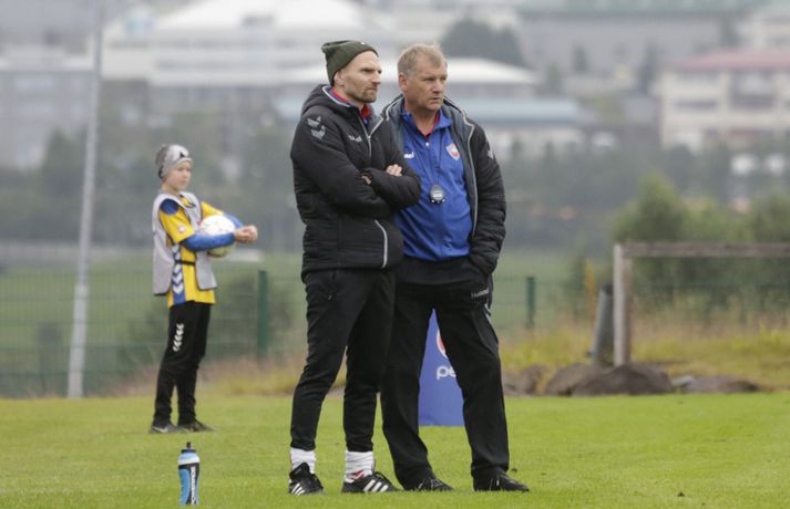 Valsmenn voru afar nálægt því að ná í sinn fyrsta útisigur í Pepsi-deildinni þegar þeir heimsóttu Fjölnismenn í Grafarvoginn.Hanna Andrésdóttir var á vellinum í kvöld og náði þessum myndum hér fyrir ofan. Fjölnismenn byrjuðu leikinn betur og strax á 6.mínútu kom Gunnar Már Guðmundsson þeim yfir eftir góða sendingu frá Martin Lund Pedersen. Valsmenn náðu að jafna fyrir hlé þegar Kristinn Freyr Sigurðsson skoraði gott mark. 1-1 í hálfleik. Í upphafi síðari hálfleik skoraði svo Kristinn Ingi Halldórsson mark sem virtist ætla að verða sigurmark leiksins. Birnir Snær Ingason var hins vegar á öðru máli og jafnaði á 89.mínútu með glæsilegu marki. 2-2 lokastaðan.Af hverju varð jafntefli?Leikurinn var nokkuð jafn, þó Valsmenn hafi haft yfirhöndina lengst af. Fjölnismenn byrjuðu leikinn mjög vel og voru komnir yfir eftir sex mínútur. Upp úr miðjum fyrri hálfleik fór hins vegar að draga af heimamönnum og Valsmenn komust í gang. Þeir jöfnuðu fyrir hlé, skoruðu svo aftur í upphafi seinni hálfleiks og komust sanngjarnt yfir. En þá er eins og Valsmenn hafi farið að hugsa um að þeir gætu verið að landa fyrsta útisigrinum í Pepsi-deildinni þetta sumarið. Þeir duttu langt til baka og fóru að verja forskotið. Fjölnismenn gengu á lagið og settu oft harða pressu að marki gestanna. Pressan bar árangur, þó ekki fyrr en á 90.mínútu. Jafntefli eru nokkuð sanngjörn úrslit úr þessum leik, þó svo að Valsmenn hafi eflaust gengið svekktari af velli.Þessir stóðu upp úr?Kristinn Freyr Sigurðsson átti góðan leik í liði Vals og var oft maðurinn á bakvið sóknir gestanna. Hann skoraði fyrra markið þegar hann vippaði glæsilega yfir Þórð Ingason í markinu, listavel afgreitt. Rasmus Christiansen átti einnig ágætan leik í vörn Vals og þá var Kristinn Ingi Halldórsson ógnandi þó svo að hann hafi ansi oft fallið í rangstöðugildru heimamanna. Hjá Fjölni átti Birnir Snær Ingason mjög góða innkomu. Hann var sífellt ógnandi þær 15 mínútur sem hann spilaði og skoraði markið sem tryggði heimamönnum stig. Igor Jugovic átti ágætan leik á miðjunni og Viðar Ari stóð fyrir sínu í hægri bakverðinum.Hvað gekk illa?Hans Viktor Guðmundsson og Tobias Salquist byrjuðu leikinn vel í miðri vörn Fjölnismanna en svo fór aðeins að halla undan fæti. Bæði mörk Vals komu eftir sendingar í gegnum vörn Fjölnis og virðist sem heimamenn hafi saknað Daniel Ivanovski sem var ekki með í dag. Framherjum Vals gekk afar illa að leika á rangstöðugildru heimamanna og þá sérstaklega Kristni Inga Halldórssyni í fyrri hálfleik. Það er spurning hvort Ólafur Jóhannesson hafi eitthvað farið yfir hlutina með honum í hálfleik því hann skoraði í upphafi síðari hálfleiks eftir góða stungusendingu. Valsmönnum virtust verða stressaðir þegar þeir komust yfir því þeir lögðust strax til baka og reyndu að halda forystunni í stað þess að halda áfram að sækja á heimamenn. Það reyndist dýrkeypt var Ólafur þjálfari þeirra ósáttur í lok leiks að hans menn skyldu falla jafn mikið til baka og raun bar vitni.Hvað gerist næst?Fjölnismenn fá ágæta pásu núna því þeir eiga ekki leik fyrr en 3.ágúst þegar þeir fara til Eyja og mæta þar ÍBV. Pásan er kannski kærkomin því það hefur gengið fremur illa hjá þeim gulklæddu að safna stigum undanfarið. Ágúst Gylfason er eflaust með nokkur atriði sem hann vill líta betur á svo Fjölnir haldi sig í námunda við topp deildarinnar. Valsmenn eiga hins vegar leik í vikunni þegar þeir mæta Selfyssingum í undanúrslitum Borgunarbikarsins. Þar gæti verið tækifæri til að bjarga tímabilinu sem hefur verið frekar ákveðin vonbrigði fram að þessu. Næsti leikur Valsmanna í Pepsi-deildinni er gegn Víkingi Ólafsvík þann 3.ágúst. Ólafur: Okkur hafa verið boðnir leikmennÓlafur Jóhannesson þjálfari Vals var svekktur eftir að hans menn fengu á sig jöfnunarmark á lokamínútunum gegn Fjölni í Grafarvogi í kvöld. „Mér líður svosem ágætlega. Auðvitað er það fúlt að fá á sig jöfnunarmark hér í restina en hann hitti boltann vel og lítið við því að gera,“ sagði Ólafur í samtali við Vísi eftir leik „Verður maður ekki að vera aðeins hlutdrægur, mér fannst þetta ekki sanngjarnt,“ bætti Ólafur við. Fjölnismenn komust yfir í leiknum en Valsmenn svöruðu með tveimur mörkum, sitt hvoru megin við hálfleikinn. „Ég er ánægður með að við komum til baka eftir að hafa lent undir. Mér fannst við vera sterarki aðilinn í leiknum þá og komumst yfir í upphafi seinni hálfleik. Þá duttum við aðeins til baka og fórum of snemma að reyna að halda forystunni,“ sagði Ólafur. Valsmenn hafa verið orðaðir við nokkra leikmenn nú í félagaskiptaglugganum, m.a. Gary Martin, Hrvoje Tokic og Hólmbert Aron Friðjónsson. Ólafur sagði ekkert til í því að Valsmenn væru á höttunum á eftir leikmönnum. „Ég er hérna til að tala um leikinn, það eruð þið sem eruð að tala um þessa leikmenn. Við höfum ekki talað um þá, ekki eitt orð. Okkur hafa verið boðnir þeir.“Stendur til að styrkja liðið áður en félagaskiptaglugginn lokar?„Nei, ekki neitt,“ sagði Ólafur að lokum. Ágúst: Súrsætt stigÁgúst Gylfason.Vísir/HannaÁgúst Gylfason var nokkuð sáttur eftir að hans menn náðu að jafna í lokin gegn Valsmönnum í kvöld. Hann sagði þó að hann hefði að sjálfsögðu viljað fá þrjú stig á heimavelli. „Ég er auðvitað ánægður að ná að jafna svona seint í leiknum. Við sýndum karakter og ég hefði viljað fá markið fyrr því við vorum með þá í vasanum síðustu 25 mínúturnar í leiknum. Við fengum færi og hefðu getað klárað þennan leik. Þannig að þetta er súrsætt stig, ég hefði viljað þrjú