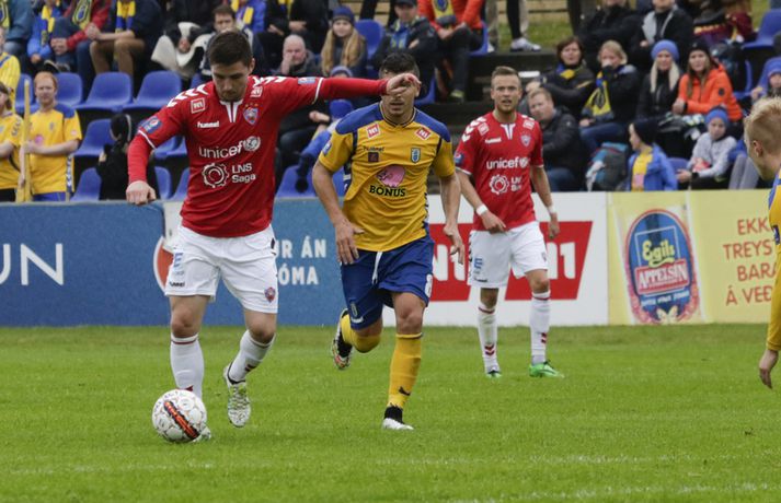 Umfjöllun, viðtöl og einkunnir: Fjölnir - Valur 2-2 | Fjölnismenn jöfnuðu í lokin Smári Jökull Jónsson í Grafarvogi skrifar 24. júlí 2016 21:45 Valsmaðurinn Kristinn Freyr Sigurðsson í leiknum í kvöld. Vísir/Hanna Valsmenn voru afar nálægt því að ná í sinn fyrsta útisigur í Pepsi-deildinni þegar þeir heimsóttu Fjölnismenn í Grafarvoginn.Hanna Andrésdóttir var á vellinum í kvöld og náði þessum myndum hér fyrir ofan. Fjölnismenn byrjuðu leikinn betur og strax á 6.mínútu kom Gunnar Már Guðmundsson þeim yfir eftir góða sendingu frá Martin Lund Pedersen. Valsmenn náðu að jafna fyrir hlé þegar Kristinn Freyr Sigurðsson skoraði gott mark. 1-1 í hálfleik. Í upphafi síðari hálfleik skoraði svo Kristinn Ingi Halldórsson mark sem virtist ætla að verða sigurmark leiksins. Birnir Snær Ingason var hins vegar á öðru máli og jafnaði á 89.mínútu með glæsilegu marki. 2-2 lokastaðan.Af hverju varð jafntefli?Leikurinn var nokkuð jafn, þó Valsmenn hafi haft yfirhöndina lengst af. Fjölnismenn byrjuðu leikinn mjög vel og voru komnir yfir eftir sex mínútur. Upp úr miðjum fyrri hálfleik fór hins vegar að draga af heimamönnum og Valsmenn komust í gang. Þeir jöfnuðu fyrir hlé, skoruðu svo aftur í upphafi seinni hálfleiks og komust sanngjarnt yfir. En þá er eins og Valsmenn hafi farið að hugsa um að þeir gætu verið að landa fyrsta útisigrinum í Pepsi-deildinni þetta sumarið. Þeir duttu langt til baka og fóru að verja forskotið. Fjölnismenn gengu á lagið og settu oft harða pressu að marki gestanna. Pressan bar árangur, þó ekki fyrr en á 90.mínútu. Jafntefli eru nokkuð sanngjörn úrslit úr þessum leik, þó svo að Valsmenn hafi eflaust gengið svekktari af velli.Þessir stóðu upp úr?Kristinn Freyr Sigurðsson átti góðan leik í liði Vals og var oft maðurinn á bakvið sóknir gestanna. Hann skoraði fyrra markið þegar hann vippaði glæsilega yfir Þórð Ingason í markinu, listavel afgreitt. Rasmus Christiansen átti einnig ágætan leik í vörn Vals og þá var Kristinn Ingi Halldórsson ógnandi þó svo að hann hafi ansi oft fallið í rangstöðugildru heimamanna. Hjá Fjölni átti Birnir Snær Ingason mjög góða innkomu. Hann var sífellt ógnandi þær 15 mínútur sem hann spilaði og skoraði markið sem tryggði heimamönnum stig. Igor Jugovic átti ágætan leik á miðjunni og Viðar Ari stóð fyrir sínu í hægri bakverðinum.Hvað gekk illa?Hans Viktor Guðmundsson og Tobias Salquist byrjuðu leikinn vel í miðri vörn Fjölnismanna en svo fór aðeins að halla undan fæti. Bæði mörk Vals komu eftir sendingar í gegnum vörn Fjölnis og virðist sem heimamenn hafi saknað Daniel Ivanovski sem var ekki með í dag. Framherjum Vals gekk afar illa að leika á rangstöðugildru heimamanna og þá sérstaklega Kristni Inga Halldórssyni í fyrri hálfleik. Það er spurning hvort Ólafur Jóhannesson hafi eitthvað farið yfir hlutina með honum í hálfleik því hann skoraði í upphafi síðari hálfleiks eftir góða stungusendingu. Valsmönnum virtust verða stressaðir þegar þeir komust yfir því þeir lögðust strax til baka og reyndu að halda forystunni í stað þess að halda áfram að sækja á heimamenn. Það reyndist dýrkeypt var Ólafur þjálfari þeirra ósáttur í lok leiks að hans menn skyldu falla jafn mikið til baka og raun bar vitni.Hvað gerist næst?Fjölnismenn fá ágæta pásu núna því þeir eiga ekki leik fyrr en 3.ágúst þegar þeir fara til Eyja og mæta þar ÍBV. Pásan er kannski kærkomin því það hefur gengið fremur illa hjá þeim gulklæddu að safna stigum undanfarið. Ágúst Gylfason er eflaust með nokkur atriði sem hann vill líta betur á svo Fjölnir haldi sig í námunda við topp deildarinnar. Valsmenn eiga hins vegar leik í vikunni þegar þeir mæta Selfyssingum í undanúrslitum Borgunarbikarsins. Þar gæti verið tækifæri til að bjarga tímabilinu sem hefur verið frekar ákveðin vonbrigði fram að þessu. Næsti leikur Valsmanna í Pepsi-deildinni er gegn Víkingi Ólafsvík þann 3.ágúst. Ólafur: Okkur hafa verið boðnir leikmennÓlafur Jóhannesson þjálfari Vals var svekktur eftir að hans menn fengu á sig jöfnunarmark á lokamínútunum gegn Fjölni í Grafarvogi í kvöld. „Mér líður svosem ágætlega. Auðvitað er það fúlt að fá á sig jöfnunarmark hér í restina en hann hitti boltann vel og lítið við því að gera,“ sagði Ólafur í samtali við Vísi eftir leik „Verður maður ekki að vera aðeins hlutdrægur, mér fannst þetta ekki sanngjarnt,“ bætti Ólafur við. Fjölnismenn komust yfir í leiknum en Valsmenn svöruðu með tveimur mörkum, sitt hvoru megin við hálfleikinn. „Ég er ánægður með að við komum til baka eftir að hafa lent undir. Mér fannst við vera sterarki aðilinn í leiknum þá og komumst yfir í upphafi seinni hálfleik. Þá duttum við aðeins til baka og fórum of snemma að reyna að halda forystunni,“ sagði Ólafur. Valsmenn hafa verið orðaðir við nokkra leikmenn nú í félagaskiptaglugganum, m.a. Gary Martin, Hrvoje Tokic og Hólmbert Aron Friðjónsson. Ólafur sagði ekkert til í því að Valsmenn væru á höttunum á eftir leikmönnum. „Ég er hérna til að tala um leikinn, það eruð þið sem eruð að tala um þessa leikmenn. Við höfum ekki talað um þá, ekki eitt orð. Okkur hafa verið boðnir þeir.“Stendur til að styrkja liðið áður en félagaskiptaglugginn lokar?„Nei, ekki neitt,“ sagði Ólafur að lokum. Ágúst: Súrsætt stigÁgúst Gylfason.Vísir/HannaÁgúst Gylfason var nokkuð sáttur eftir að hans menn náðu að jafna í lokin gegn Valsmönnum í kvöld. Hann sagði þó að hann hefði að sjálfsögðu viljað fá þrjú stig á heimavelli. „Ég er auðvitað ánægður að ná að jafna svona seint í leiknum. Við sýndum karakter og
