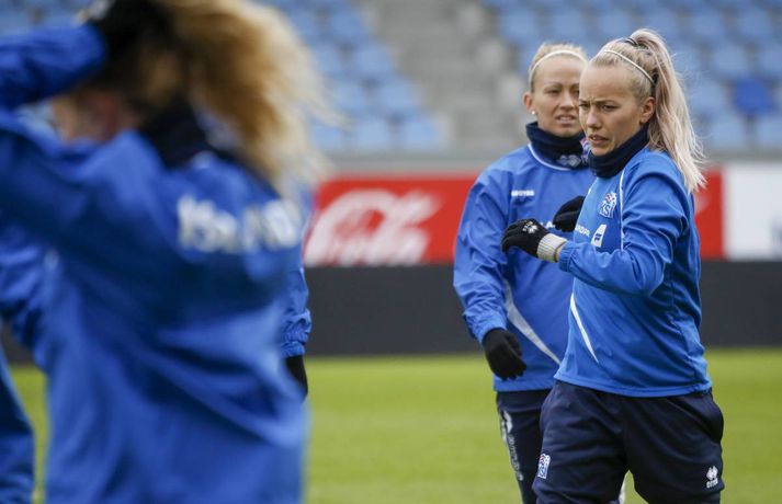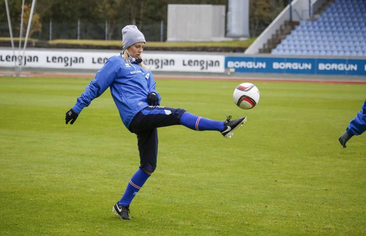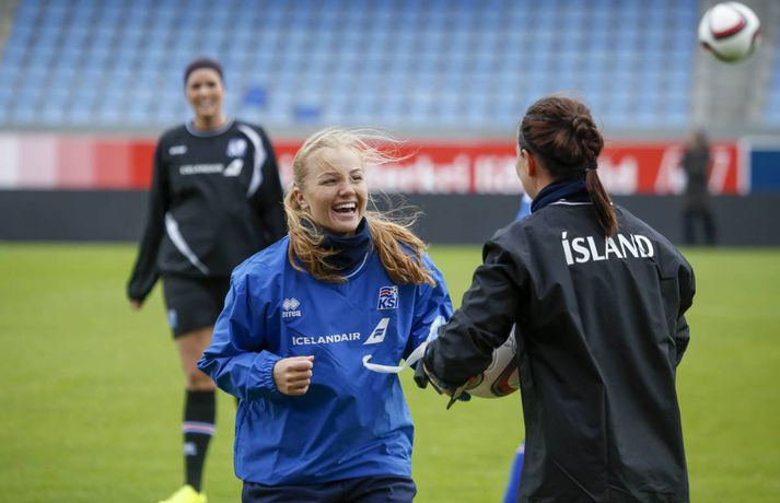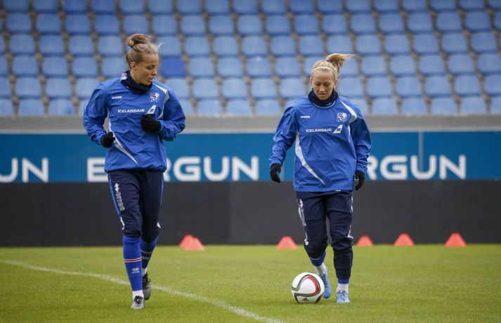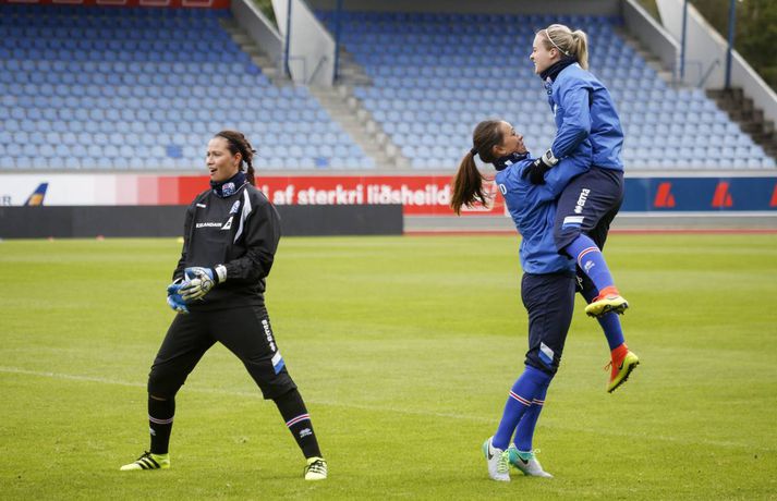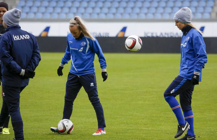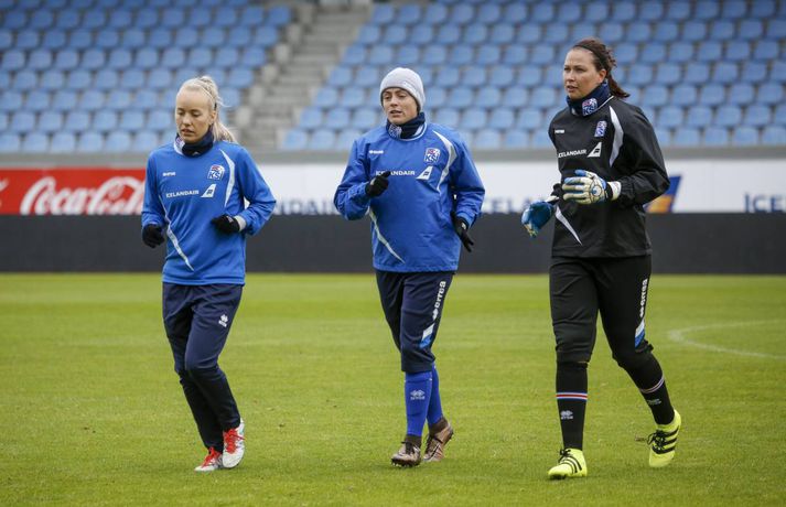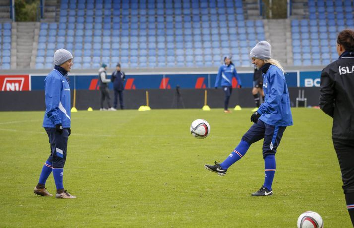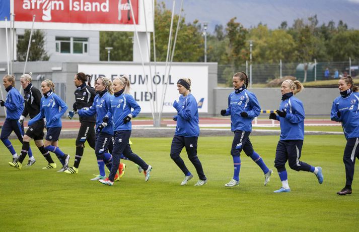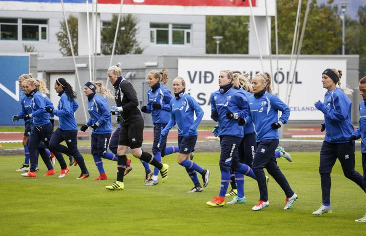 Stelpurnar okkar í kvennalandsliðinu í fótbolta mættu til æfinga á Laugardalsvelli í morgun í fyrsta sinn fyrir tvíhöfðann gegn Slóveníu og Skotlandi en það eru síðustu tveir leikir liðsins í undankeppni EM 2017. Með því að ná einu stigi gegn Slóveníu á föstudaginn tryggja stelpurnar sig á EM þriðja skiptið í röð en þær eru efstar í riðlinum með fullt hús stiga og eiga enn eftir að fá á sig mark. Fyrri leikurinn gegn Slóvenum endaði 6-0 fyrir Íslandi. Það var létt yfir stelpunum í dalnum í morgun þrátt fyrir að kalt væri í veðri eins og sjá má á myndunum sem Eyþór Árnason, ljósmyndari Fréttablaðsins og Vísis, tók á Laugardalsvelli. Seinni leikur stelpnanna verður gegn Skotlandi á þriðjudaginn í næstu viku en Skotar eru með 18 stig eins og Ísland en hafa leikið sjö leiki á móti sex leikjum Íslands.