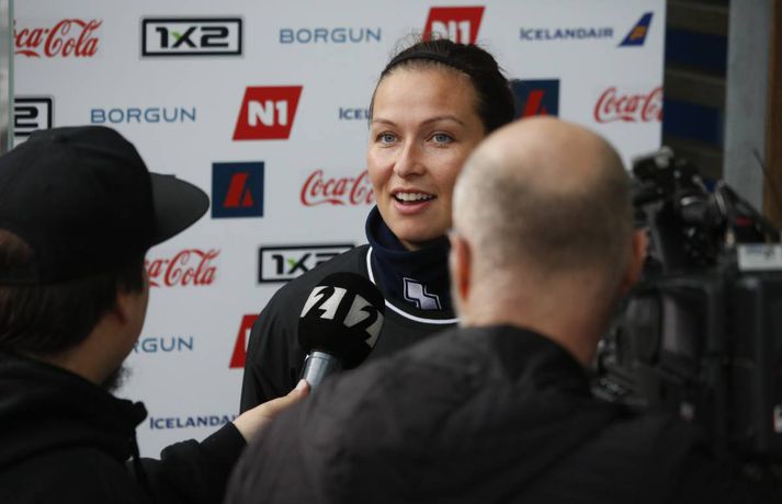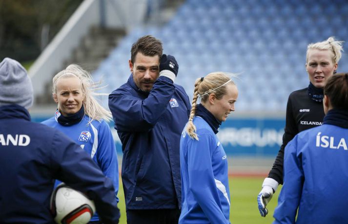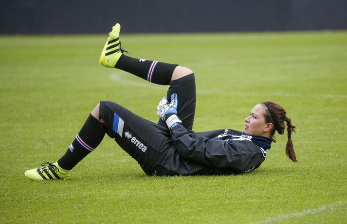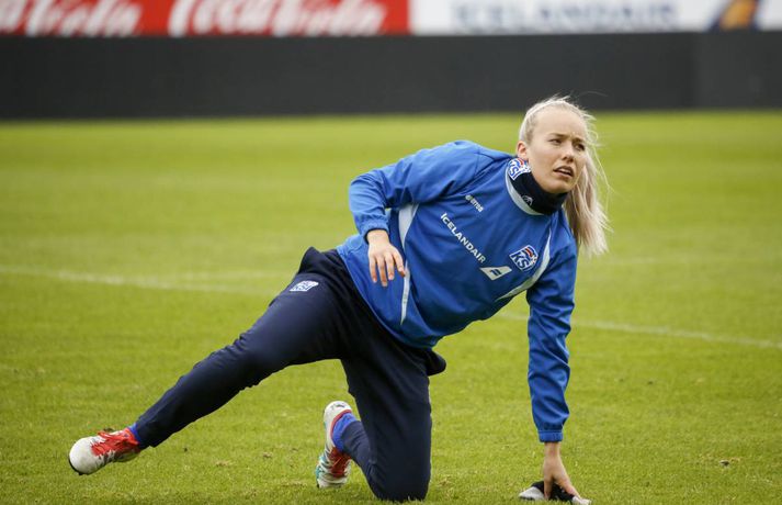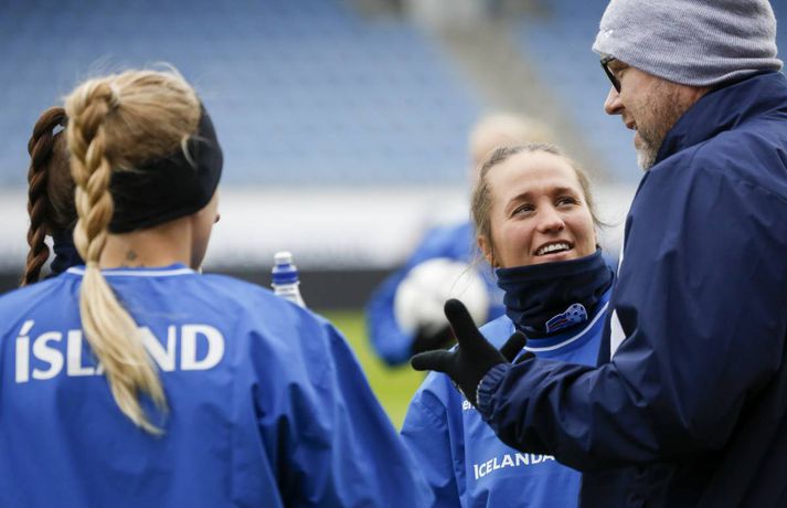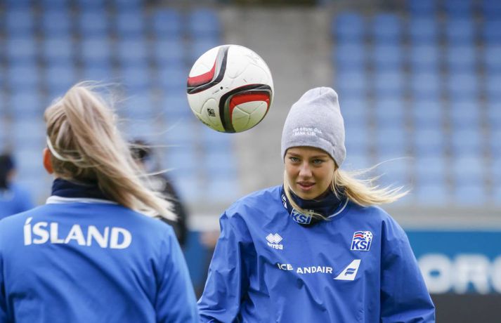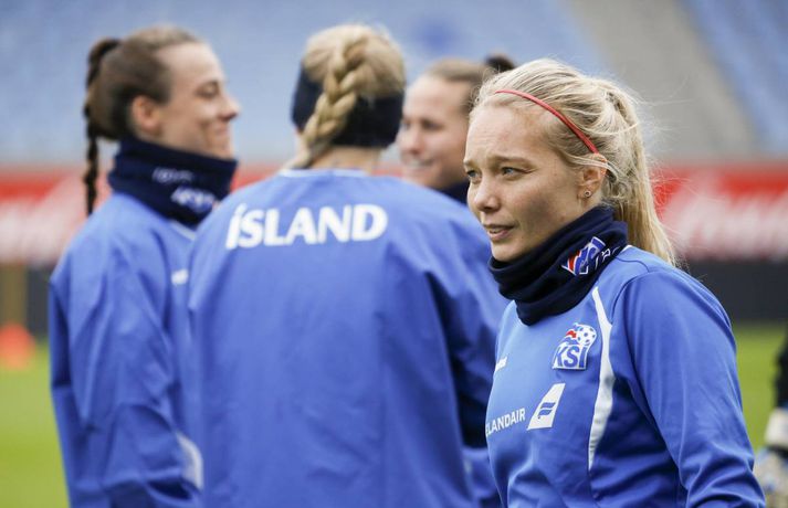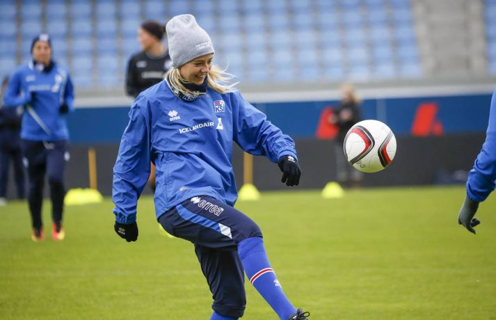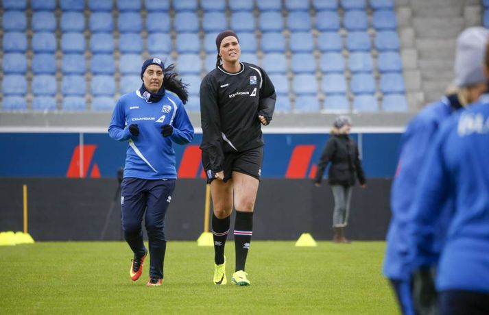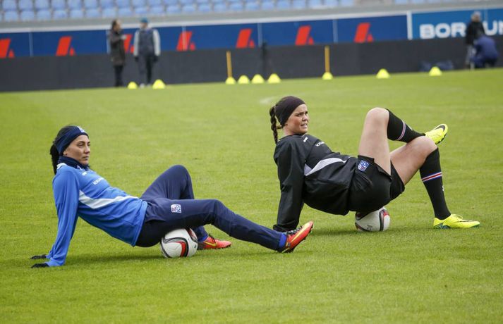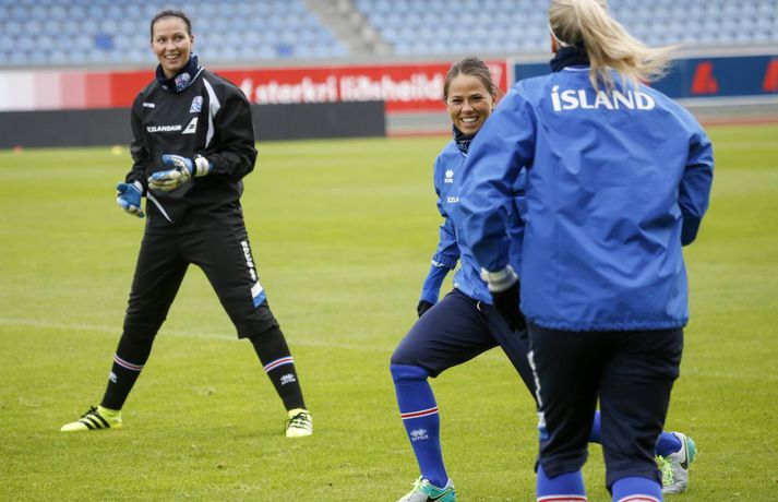 Stelpurnar okkar í kvennalandsliðinu í fótbolta mættu til æfinga á Laugardalsvelli í morgun í fyrsta sinn fyrir tvíhöfðann gegn Slóveníu og Skotlandi en það eru síðustu tveir leikir liðsins í undankeppni EM 2017. Með því að ná einu stigi gegn Slóveníu á föstudaginn tryggja stelpurnar sig á EM þriðja skiptið í röð en þær eru efstar í riðlinum með fullt hús stiga og eiga enn eftir að fá á sig mark. Fyrri leikurinn gegn Slóvenum endaði 6-0 fyrir Íslandi. Það var létt yfir stelpunum í dalnum í morgun þrátt fyrir að kalt væri í veðri eins og sjá má á myndunum sem Eyþór Árnason, ljósmyndari Fréttablaðsins og Vísis, tók á Laugardalsvelli. Seinni leikur stelpnanna verður gegn Skotlandi á þriðjudaginn í næstu viku en Skotar eru með 18 stig eins og Ísland en hafa leikið sjö leiki á móti sex leikjum Íslands.