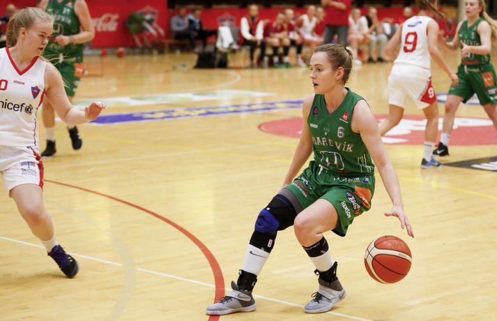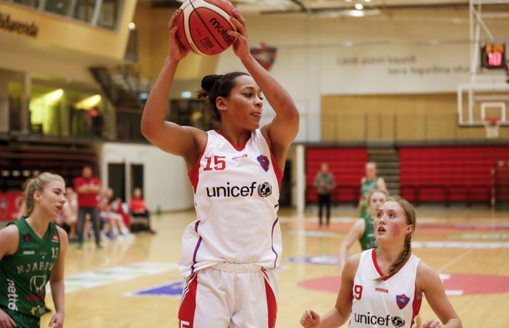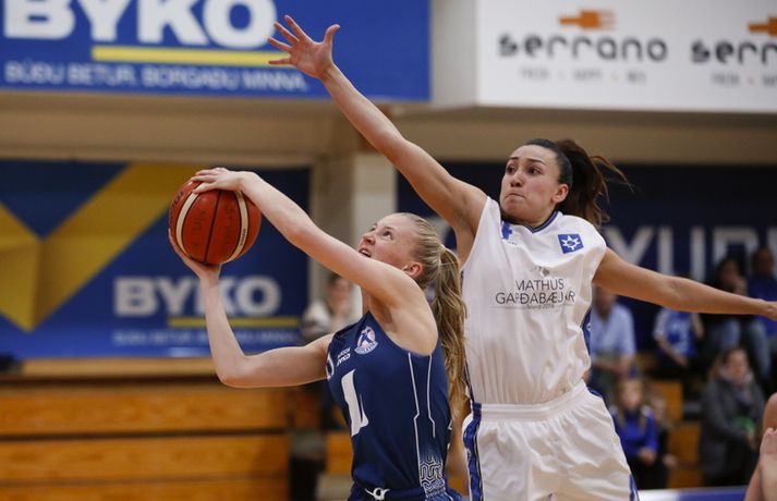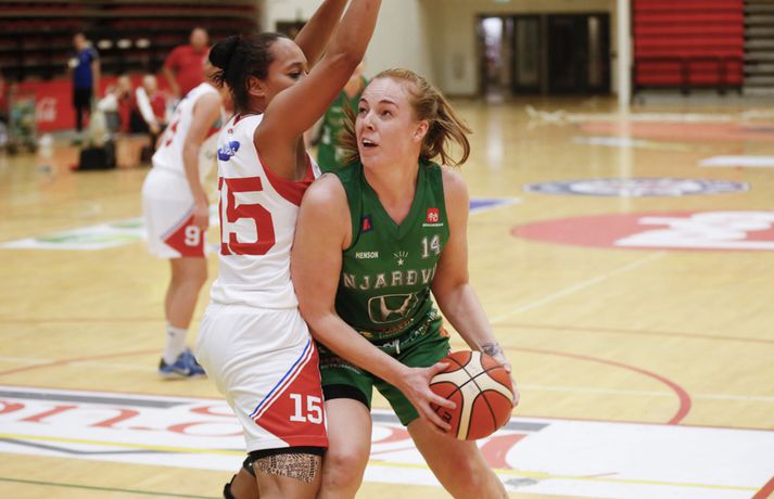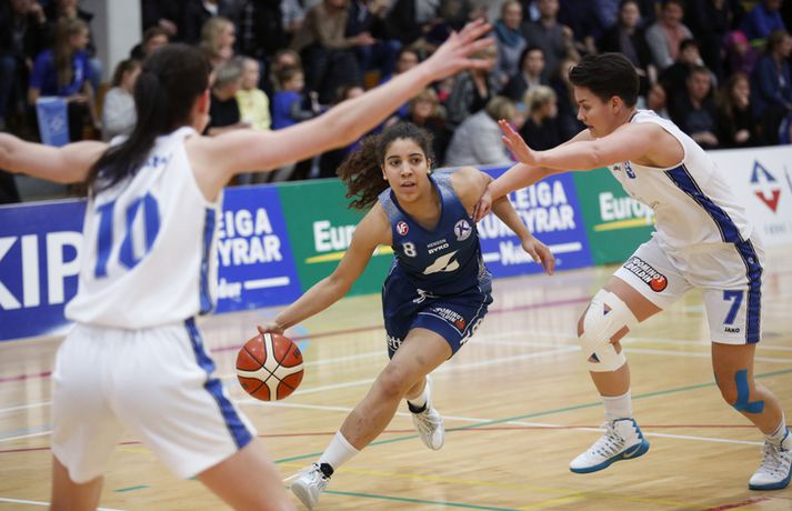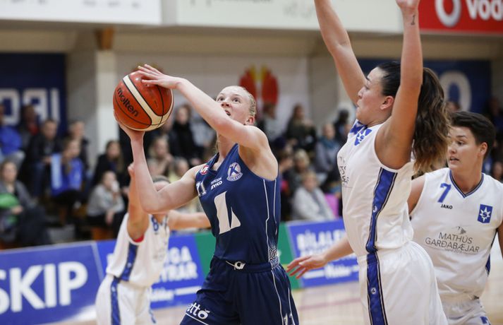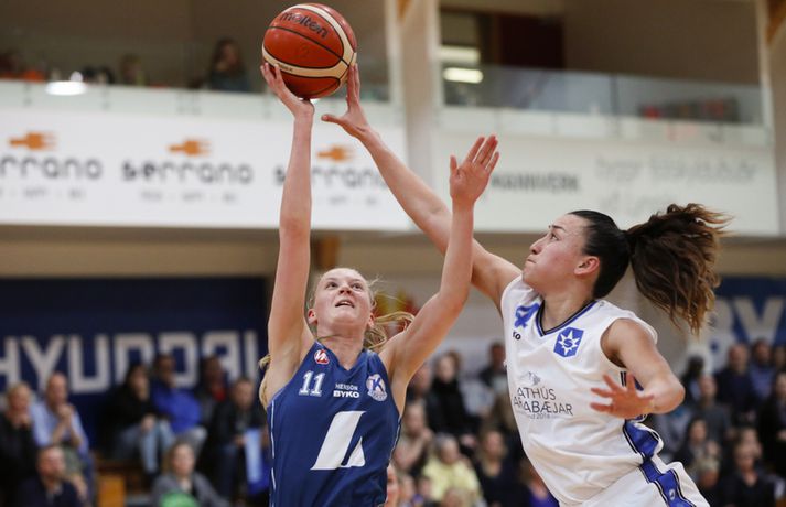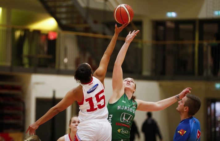 Haukar og Valur komust bæði upp fyrir Grindavík eftir heimasigra í áttundu umferð Domino´s deildar kvenna í körfubolta kvöld.Eyþór Árnason, ljósmyndari Vísis og Fréttablaðsins, kom við á leik Stjörnunnar og Keflavíkur annarsvegar og leik Vals og Njarðvíkur hinsvegar. Það má sjá myndirnar hans hér fyrir ofan. Haukar og Valur voru í tveimur neðstu sætunum fyrir umferðina en komust bæði upp fyrir Grindavík sem er nú í neðsta sæti deildarinnar. Haukakonur unnu sjö stiga sigur á Grindavík, 65-58, á Ásvöllum. Grindavík var tveimur stigum yfir í hálfleik en Haukar tóku frumkvæðið með því að vinna þriðja leikhlutann 15-8. Bjarni Magnússon stýrði Grindavík þarna í fyrsta sinn í deildinni en varð að sætta sig við tap á móti sínu gamla liði. Bjarni þjálfaði Haukaliðið í nokkur ár. Michelle Nicole Mitchell var með 23 stig og 13 fráköst hjá Haukum og Rósa Björk Pétursdóttir bætti við 13 stigum, 8 stoðsendingum og 6 fráköstum. Ashley Grimes var yfirburðarleikmaður í liði Grindavíkur með 27 stig og 10 fráköst. Haukaliðið hefur nú unnið tvo heimaleiki í röð og þrjá af fjóra heimaleikjum liðsins í deildinni í vetur. Valskonur unnu á sama tíma 19 stiga heimasigur á Njarðvík, 74-55, á heimavelli sínum en Njarðvíkurliðið lék án Carmen Tyson-Thomas í leiknum og munaði mikið um það. var með 26 stig og 17 fráköst fyrir Val, Guðbjörg Sverrisdóttir skoraði 14 stig og Dagbjörg Samúelsdóttir var með 12 stig. Björk Gunnarsdóttir var stigahæst hjá Njarðvík með 15 stig. Keflavíkurkonur komust upp að hlið Snæfelli á toppnum eftir sannfærandi fimmtán stiga sigur á Stjörnunni í Garðabæ, 72-57. Dominique Hudson skoraði 20 stig fyrir Keflavíkurliðið, Erna Hákonardóttir skoraði 12 stig og hin sextán ára Birna Valgerður Benónýsdóttir var með 11 stig. Danielle Victoria Rodriguez var atkvæðamest hjá Stjörnunni með 21 stig, 14 fráköst, 5 stoðsendingar og 9 stolna bolta. Bríet Sif Hinriksdóttir og Ragna Margrét Brynjarsdóttir skoruðu báðar 10 stig.Úrslitin og stigaskor úr öllum leikjum Domino´s deildarinnar í kvöld:Haukar-Grindavík 65-58 (11-13, 21-21, 15-8, 18-16)Haukar: Michelle Nicole Mitchell 23/13 fráköst, Rósa Björk Pétursdóttir 13/6 fráköst/8 stoðsendingar/6 stolnir, Sólrún Inga Gísladóttir 9, Magdalena Gísladóttir 8/7 fráköst, Dýrfinna Arnardóttir 7/5 stolnir, Anna Lóa Óskarsdóttir 5.Grindavík: Ashley Grimes 27/10 fráköst, Jeanne Lois Figueroa Sicat 8, María Ben Erlingsdóttir 8/4 fráköst, Petrúnella Skúladóttir 5/4 fráköst, Lovísa Falsdóttir 3, Íris Sverrisdóttir 2/8 fráköst, Ingibjörg Jakobsdóttir 2/5 fráköst/5 stoðsendingar, Ingunn Embla Kristínardóttir 2/4 fráköst, Sigrún Elfa Ágústsdóttir 1.Stjarnan-Keflavík 57-72 (14-15, 14-23, 13-20, 16-14)Stjarnan: Danielle Victoria Rodriguez 21/14 fráköst/5 stoðsendingar/9 stolnir/4 varin skot, Ragna Margrét Brynjarsdóttir 10/6 fráköst, Bríet Sif Hinriksdóttir 10, María Lind Sigurðardóttir 6/7 fráköst, Jenný Harðardóttir 4, Bryndís Hanna Hreinsdóttir 4, Viktoría Líf Steinþórsdóttir 2.Keflavík: Dominique Hudson 20/9 fráköst, Erna Hákonardóttir 12, Birna Valgerður Benónýsdóttir 11, Emelía Ósk Gunnarsdóttir 9, Salbjörg Ragna Sævarsdóttir 9/4 fráköst, Thelma Dís Ágústsdóttir 6/7 fráköst, Irena Sól Jónsdóttir 5.Snæfell-Skallagrímur 72-57 (18-10, 20-23, 15-16, 19-8)Snæfell: Aaryn Ellenberg-Wiley 34/10 fráköst/7 stolnir, Berglind Gunnarsdóttir 18/5 fráköst, Gunnhildur Gunnarsdóttir 11/4 fráköst/8 stolnir, Andrea Björt Ólafsdóttir 4, Bryndís Guðmundsdóttir 2, María Björnsdóttir 2, Helga Hjördís Björgvinsdóttir 1/5 fráköst.Skallagrímur: Tavelyn Tillman 24/7 fráköst, Sigrún Sjöfn Ámundadóttir 13/13 fráköst/5 stoðsendingar, Kristrún Sigurjónsdóttir 8, Jóhanna Björk Sveinsdóttir 5/5 fráköst, Auður Íris Ólafsdóttir 5/4 fráköst, Ragnheiður Benónísdóttir 2/6 fráköst.Valur-Njarðvík 74-55 (13-12, 26-16, 16-18, 19-9)Valur: Mia Loyd 26/17 fráköst, Guðbjörg Sverrisdóttir 14/8 fráköst, Dagbjört Samúelsdóttir 12/5 fráköst, Elín Sóley Hrafnkelsdóttir 10, Dagbjört Dögg Karlsdóttir 5/5 stoðsendingar, Bergþóra Holton Tómasdóttir 5, Elfa Falsdóttir 2.Njarðvík: Björk Gunnarsdóttir 15, Soffía Rún Skúladóttir 11, Árnína Lena Rúnarsdóttir 6, María Jónsdóttir 4/9 fráköst, Heiða Björg Valdimarsdóttir 4, Svala Sigurðadóttir 4, Júlía Scheving Steindórsdóttir 4/8 fráköst, Hulda Bergsteinsdóttir 3, Alexandra Eva Sverrisdóttir 2, Erna Freydís Traustadóttir 2.Njarðvíkingurinn María Jónsdóttir í leiknum á Hlíðarenda í kvöld.Vísir/Eyþór
