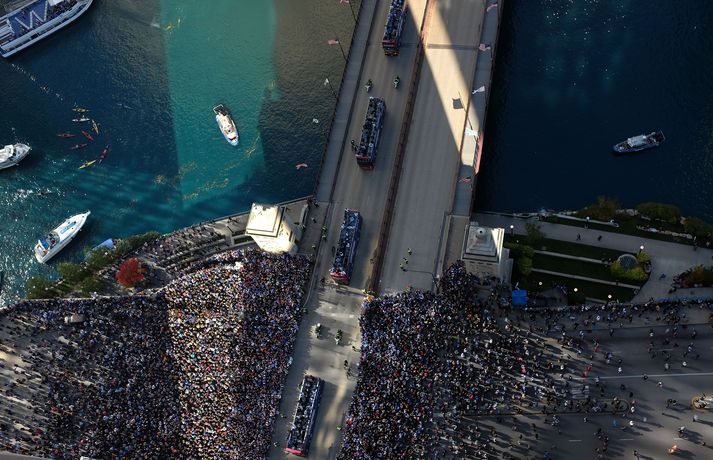 Fimm milljónir mættu á sigurhátíð Cubs | Myndir Kristinn Páll Teitsson skrifar 5. nóvember 2016 11:45 Ótrúlegar móttökur. Vísir/Getty Eftir 108 ára bið eftir meistaratitili Chicago Cubs létu áhorfendur sig ekki vanta þegar skrúðganga var haldin leikmönnum til heiðurs í Chicago í gær. Líkt og hefur verið fjallað um á Vísi var þetta sögulegur sigur eftir að hafa lent 1-3 undir en íbúar Chicago-borgar töluðu um að álög væru á liðinu hefðu áhrif á titilmöguleika liðsins. Hefur nú loksins bölvuninni verið aflétt. Samkvæmt lögreglunni í Chicago mættu fimm milljónir manns til að fagna með leikmönnum Cubs en FOX greinir frá því að þetta sé fimmti fjölmennasti atburðurðurinn í mannkynssögunni. Til samanburðar mættu 1,3 milljón manns þegar Cleveland Cavaliers fögnuðu NBA-meistaratitlinum í vor en það var fyrsti titill Cleveland-borgar í rúmlega fimmtíu ár. Sjá má skemmtilegar myndir frá þessum atburði í myndaalbúminu hér fyrir ofan. Aðrar íþróttir Tengdar fréttir Bölvun aflétt Ein merkasta stund í bandarískri íþróttasögu kom er Chicago Cubs varð hafnaboltameistari í fyrsta skipti í 108 ár. Úrslitaleikurinn var ein dramatík frá upphafi til enda og endirinn í anda myndar frá Disney. 4. nóvember 2016 06:30 108 ára bið Chicago Cubs lauk í nótt | Myndbönd Bölvun Chicago Cubs var loks aflétt í nótt er liðið varð meistari í bandaríska hafnaboltanum í fyrsta skipti síðan 1908. Ekkert lið í bandarískum íþróttum hefur mátt bíða eins lengi eftir titli. 3. nóvember 2016 08:00 Bill Murray með viðtal ársins | Myndband Einn þekktasti stuðningsmaður Chicago Cubs er gamanleikarinn Bill Murray og hann var að sjálfsögðu á leiknum sögulega í nótt er Cubs varð meistari. 3. nóvember 2016 10:00 Bölvun Cubs eða Indians verður aflétt í oddaleik Það verður líklega metáhorf á hafnaboltaleik í nótt er tvö félög sem hafa ekki unnið bandarísku hafnaboltadeildina í áratugi berjast um sigurinn í oddaleik. 2. nóvember 2016 09:00 Mest lesið Vonast til að komast í Kórinn: „Menn hafa aldrei séð annað eins“ Fótbolti Fær þrjár milljónir á dag næstu sex árin fyrir að gera ekkert Sport Landsleiknum aflýst og framhaldið óljóst Fótbolti Stöðufundur í Laugardal klukkan 10:30 Fótbolti Enska úrvalsdeildin í jólaköttinn Enski boltinn Elsta konan til klára Járnkarlinn Sport Markvörður Inter banaði háöldruðum manni í hjólastól Sport Nýi íþróttastjóri Kjartans stal mörgæs og endaði í fangelsi í Singapúr Fótbolti Segir að Slot verði að taka tvo leikmenn út úr Liverpool-liðinu Enski boltinn Brendan Rodgers sagði starfinu sínu lausu eftir ásakanir Fótbolti Fleiri fréttir Öllum leikjum Bónus-deildar kvenna í kvöld frestað Arnar skilur ekkert í Tottenham Landsleiknum aflýst og framhaldið óljóst Bardagakapparnir vilja ólmir fá að keppa í Hvíta húsinu Segir að Slot verði að taka tvo leikmenn út úr Liverpool-liðinu Vonast til að komast í Kórinn: „Menn hafa aldrei séð annað eins“ Markvörður Inter banaði háöldruðum manni í hjólastól „Alltaf gaman að fá nýjar raddir inn“ Gleðifréttir fyrir Argentínumenn: Messi vill spila á HM „Sagan hefur sýnt það að ég er góður að þjálfa unga og efnilega leikmenn“ Stöðufundur í Laugardal klukkan 10:30 Enska úrvalsdeildin í jólaköttinn Nýi íþróttastjóri Kjartans stal mörgæs og endaði í fangelsi í Singapúr Tyrkneska sambandið segir dómara hafa veðjað á þúsundir leikja Brendan Rodgers sagði starfinu sínu lausu eftir ásakanir Fær þrjár milljónir á dag næstu sex árin fyrir að gera ekkert Segir sitt fyrrum lið í krísu Elsta konan til klára Járnkarlinn Dagskráin í dag: VARsjáin, Lokasóknin, íslenskur körfubolti og margt fleira Fylltu í eyðurnar: Vanmetnasti leikmaður deildarinnar? Fyrirliði Real Madríd þarf að fara í aðgerð á hné Einkaviðtal við Carrick: „Hálfgerð tískubylgja sem einkennir fótboltann í dag“ Stólarnir ekki í vandræðum á Egilsstöðum Markaóður Stefán Ingi eftirsóttur Öllu búin skildi snjóspáin raungerast „Eitthvað sem við erum óvanar eftir Þjóðadeildina“ Heimir kynntur til leiks í Árbænum Danir heiðra Michael Laudrup De Bruyne verður lengi frá Túfa rekinn frá Val Sjá meira
