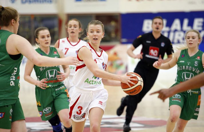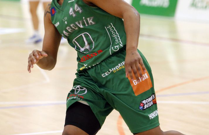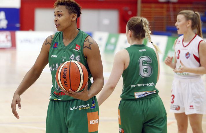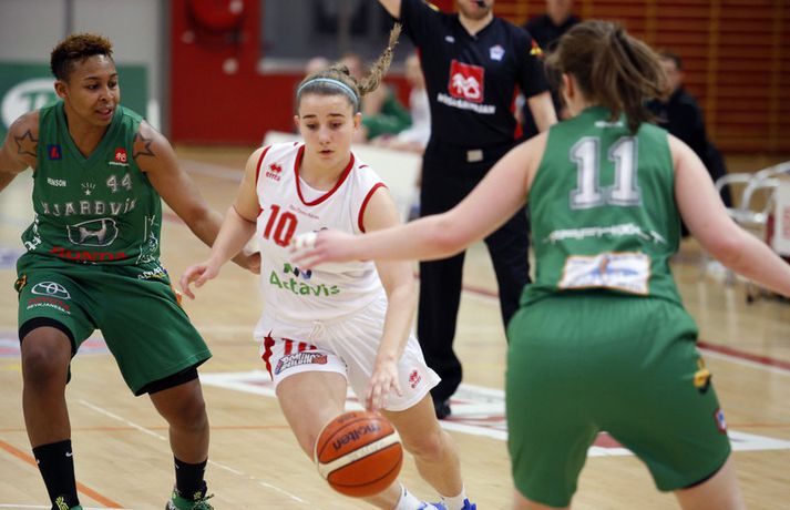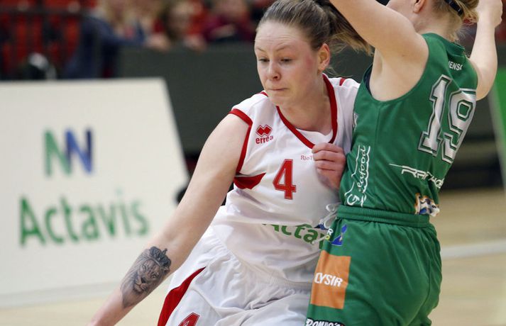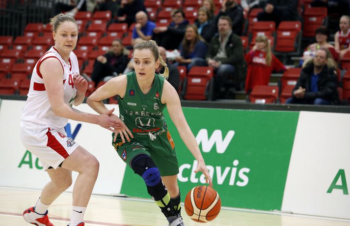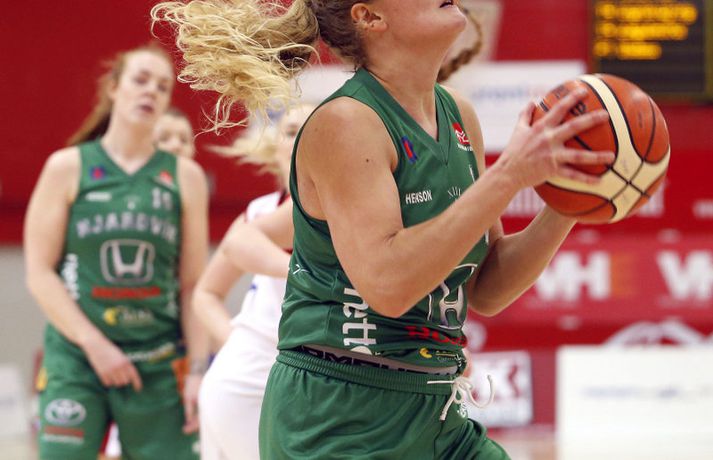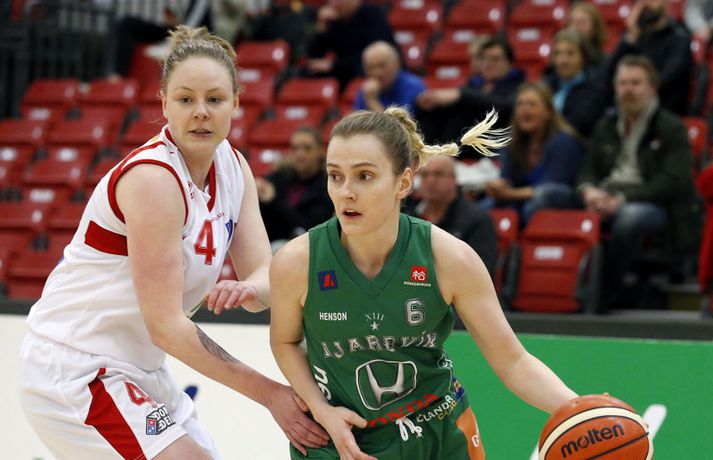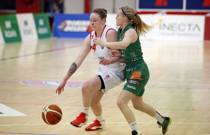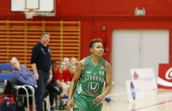 Njarðvík vann Hauka með minnsta mun, 73-74, þegar liðin mættust í lokaleik 14. umferðar Domino's deildar kvenna í kvöld.Stefán Karlsson, ljósmyndari Vísis og Fréttablaðsins, var á leiknum og náði þessum myndum hér fyrir ofan. Sem fyrr var Carmen Tyson-Thomas atkvæðamest í liði Njarðvíkur en hún skoraði 40 stig og tók 16 fráköst. Haukar léku án bandarísks leikmanns í kvöld en voru samt nálægt því að kreista fram sigur. Njarðvík leiddi með níu stigum í hálfleik, 28-37. Haukar tóku við sér í 3. leikhluta og náðu að minnka muninn í fjögur stig fyrir fjórða og síðasta leikhlutann, 53-57. Njarðvík byrjaði 4. leikhlutann betur en Haukar komu aftur til baka og Sólrún Inga Gísladóttir minnkaði muninn í 67-71 þegar hún setti niður þrist. Njarðvíkingar reyndust hins vegar sterkari á lokakaflanum og lönduðu eins stigs sigri, 73-74. Tyson-Thomas var langstigahæst í liði Njarðvíkur eins og áður sagði. Soffía Rún Skúladóttir kom næst með 12 stig og Björk Gunnarsdóttir skoraði sex stig, tók sex fráköst og gaf sjö stoðsendingar. Dýrfinna Arnardóttir skoraði 16 stig fyrir Hauka og Rósa Björk Pétursdóttir fimmtán. Þóra Kristín Jónsdóttir skoraði 12 stig, tók níu fráköst og gaf sex stoðsendingar. Njarðvík er áfram í 5. sæti deildarinnar og Haukar í áttunda og neðsta sætinu.Haukar-Njarðvík 73-74 (15-18, 13-19, 25-20, 20-17)Haukar: Dýrfinna Arnardóttir 16/4 fráköst/5 stolnir, Rósa Björk Pétursdóttir 15/5 fráköst, Sólrún Inga Gísladóttir 14/9 fráköst/5 stolnir, Anna Lóa Óskarsdóttir 13, Þóra Kristín Jónsdóttir 12/9 fráköst/6 stoðsendingar, Ragnheiður Björk Einarsdóttir 2, Sigrún Björg Ólafsdóttir 1.Njarðvík: Carmen Tyson-Thomas 40/16 fráköst/5 varin skot, Soffía Rún Skúladóttir 12, Björk Gunnarsdótir 6/6 fráköst/7 stoðsendingar, Heiða Björg Valdimarsdóttir 4/5 fráköst, Linda Þórdís Barðdal Róbertsdóttir 4/6 fráköst, María Jónsdóttir 3/11 fráköst, Karen Dögg Vilhjálmsdóttir 3, Erna Freydís Traustadóttir 2.Carmen Tyson-Thomas átti enn einn stórleikinn.Vísir/Stefán