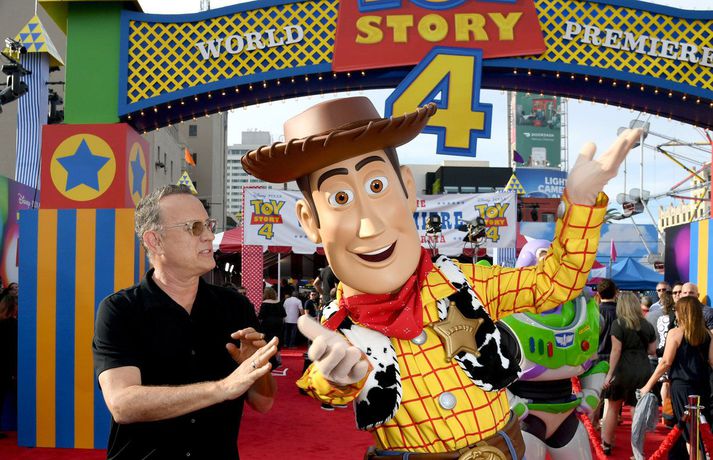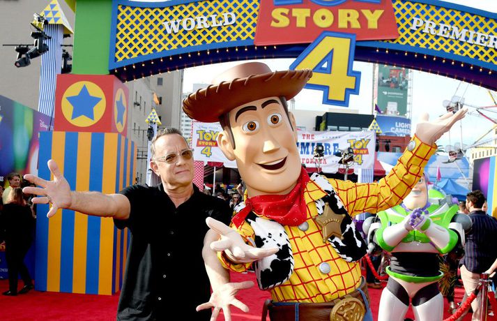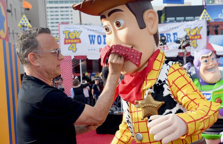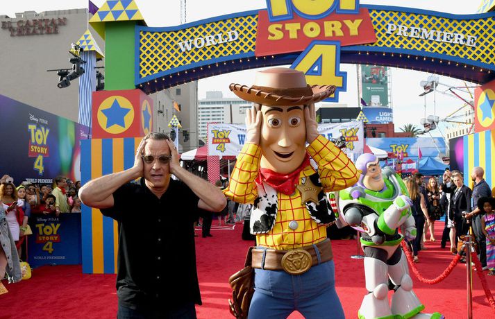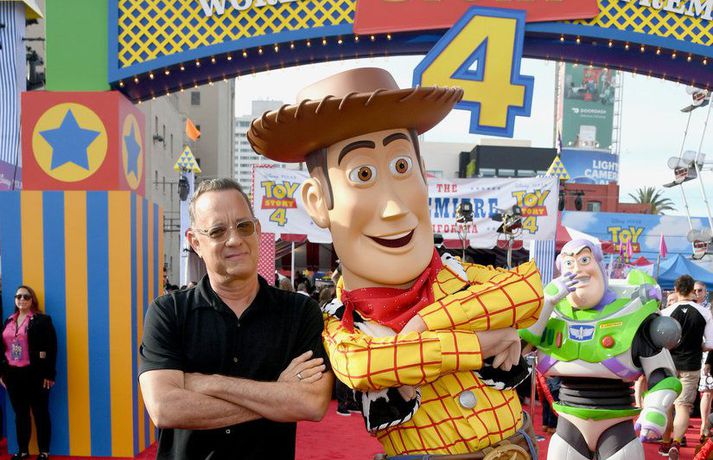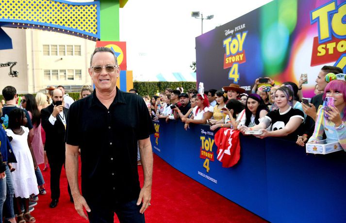 Sérstaka athygli vakti hve vel fór á með þeim félögum, honum og Vidda sjálfum, en þetta verður síðasta myndin í Toy Story-sögunni. Búist er við að Toy Story 4 hali inn 200 milljónir dollara um helgina þegar myndin verður frumsýnd. Að sjálfsögðu var Tim Allen einnig á svæðinu en hann leikur Bósa ljósár og hefur gert síðan 1995. Þá birtust þau Keanu Reeves, Christina Hendricks, Jordan Peele, Annie Potts, Timothy Dalton og Joan Cusack svo nokkrir séu nefndir úr leikaraliðinu. Toy Story-sagan hefur verið gríðarlega vinsæl. Flestir héldu að þriðja myndin yrði sú síðasta enda hafði verið sagt að Pixar og Disney væru ekki með þá fjórðu á teikniborðinu. En mikið vatn rann svo til sjávar og myndin hefur þegar fengið góða dóma og er nánast lofað að hörðustu aðdáendur felli tár í lokin. Leikararnir sem tala fyrir karakterana í Toy Story 4 komu saman á rauða dreglinum í vikunni þegar myndin var frumsýnd í Kaliforníu. Tom Hanks, sem hefur talað fyrir Vidda síðan fyrsta myndin var gerð 1995, var í frekar látlausum klæðnaði;