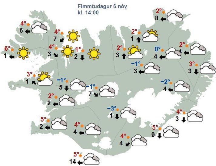 Á vef Veðurstofunnar segir að austanáttinni fylgi þungbúið veður og lítilsháttar úrkoma um landið austanvert, en í öðrum landshlutum verður þurrt og víða nokkuð bjart. Hiti á landinu verður yfirleitt núll til sjö stig að deginum. „Í kvöld og nótt hvessir um tíma í Öræfum. Keimlíkt veður á morgun, en bætir lítið eitt í vind og annað kvöld þykknar upp suðvestanlands. Um helgina er svo útlit fyrir áframhaldandi austan- og norðaustanátt með vætu um landið austanvert, og auk þess mun blása nokkuð bæði á suðaustur- og norðvesturhluta landsins,“ segir í hugleiðingum veðurfræðings. Spákort fyrir klukkan 14.Veðurstofan Veðurhorfur á landinu næstu daga Á föstudag: Austan og norðaustan 5-13 m/s, en 13-20 við suðausturströndina. Skýjað og lítilsháttar rigning eða slydda, en bjart að mestu á vesturhelmingi landsins. Hiti 0 til 7 stig. Á laugardag: Norðaustan og austan 5-13, en 13-18 norðvestantil og allra syðst. Væta með köflum um landið austanvert og á Vestfjörðum, annars þurrt og víða bjart veður. Hiti 2 til 8 stig. Á sunnudag og mánudag: Norðaustan 5-15, en hvassviðri við suðausturströndina. Rigning með köflum, en yfirleitt þurrt á Norðvestur- og Vesturlandi. Hiti breytist lítið. Á þriðjudag: Norðaustanátt og él norðan- og austanlands, en þurrt að mestu á Vesturlandi. Kólnar í veðri. Á miðvikudag: Breytileg átt og bjart með köflum. Svalt í veðri.