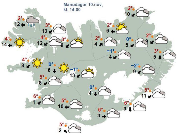 Í hugleiðingum veðurfræðings á vef Veðurstofunnar segir að það verði víða lítilsháttar rigning eða snjókoma, en þurrt og bjart á Vesturlandi. Hiti verður á bilinu núll til átta stig, mildast syðst. „Norðan og norðaustan 5-13 á morgun og léttskýjað á Suður- og Suðvesturlandi. Skýjað og dálítil él í öðrum landshlutum, hiti um eða undir frostmarki. Á miðvikudag er útlit fyrir norðan strekking austast á landinu, en golu eða kalda annars staðar. Skýjað og stöku él norðan heiða, en bjart syðra. Frost 0 til 8 stig,“ segir í hugleiðingum veðurfræðings. Spákort fyrir klukkan 14 í dag.Veðurstofan Veðurhorfur á landinu næstu daga Á þriðjudag: Norðan- og norðaustan 5-13 m/s. Dálítil él norðan- og austanlands, en léttskýjað suðvestantil. Kólnar, frost 0 til 5 stig síðdegis. Á miðvikudag: Norðan 3-10, en 8-13 austast. Skýjað á norðaustanverðu landinu og stöku él, annars bjart með köflum. Frost 1 til 8 stig. Á fimmtudag: Hægur vindur og þurrt, en suðvestan 3-8 og dálítil él norðvestantil. Hlánar við vesturströndina, annars breytist hiti lítið. Á föstudag og laugardag: Suðvestlæg eða breytileg átt. Léttskýjað og áfram kalt austanlands. Skýjað en úrkomulítið vestantil og hiti um eða yfir frostmarki. Á sunnudag: Breytileg átt og skúrir eða él, en að mestu þurrt um landið austanvert.
