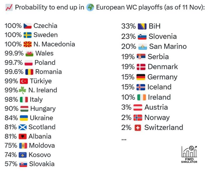 Íslenska liðið þarf að vinna Aserbaídsjan á útivelli í fyrri leiknum, treysta á að Frakkar vinni Úkraínumenn á sama tíma og fá síðan úrslitaleik á móti Úkraínumönnum í lokaleiknum. Tölfræðingarnir á Football Meets Data hafa dundað sér við að reikna út líkurnar á því að þjóðir komist í þetta umspil. Sigurvegari í hverjum riðli kemst beint á HM en liðin tólf í öðru sæti keppa um fjögur laus sæti í umspilinu. Útreikningar þeirra gefa íslenska landsliðinu aðeins fimmtán prósent líkur á því að komast í umspilið sem þýðir að það eru 84 prósent líkur á því að Úkraínumenn tryggi sér annað sætið í riðlinum. Frakkar eru öruggir með sæti í umspilinu en ekki öruggir með fyrsta sætið og þar með sæti á HM: Franska landsliðið er með 10 stig, þremur stigum meira en Úkraína (7 stig) og sex stigum meira en Ísland (4 stig). Íslenska liðið er með einu marki betri markatölu og nægir því jafntefli verði liðin jöfn að stigum eftir fyrri leikina í þessum glugga. Það er hins vegar ljóst að slæm úrslit í fyrri leikjum gluggans gætu þýtt að íslenska liðið væri úr leik. Íslenska liðið þarf því að byrja á því að vinna Aserbaísjan áður en eitthvað gott gerist. Sá mikilvægi leikur er strax á fimmtudaginn. Stórþjóð á sama möguleika og Ísland í öðrum riðli en það er Þýskaland sem er einnig með fimmtán prósenta líkur á sæti í umspili. Serbar, Danir eru með 19 prósent líkur og Írarnir hans Heimis Hallrímssonar standa verr með aðeins tíu prósent líkur. Líkur á því að komast í umspilið um laus sæti á HM 2026. Football Meets Data
