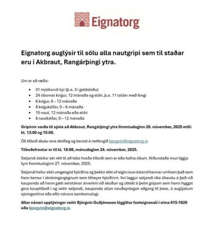 „Ég hef gert mjög mikið af því að selja jarðir ýmist í rekstri eða án reksturs og líka kúabú í rekstri og þannig selt heilu hjarðirnar en þetta er í fyrsta skipti sem maður selur staka hjörð,“ segir Björgvin Guðjónsson fasteignasali í samtali við Vísi. Hjörðin hefur verið auglýst til sölu á tveimur Facebook hópum sem tengjast nautgripum og landbúnaði. „Málið er mér skylt að því leytinu til að ég er sjálfur úr þessari starfsstétt, þó ég sé búinn að starfa miklu lengur sem fasteignasali heldur en í landbúnaði,“ útskýrir Björgvin. Um er að ræða 31 mjólkandi kýr, þar af þrjár í geldstöðu, 24 óbornar kvígur, tólf mánaða og eldri, sex kvígur sex til tólf mánaða, átta kvígukálfa sem eru núll til sex mánaða, fimmtán naut sem eru tólf mánaða og eldri og átta nautkálfar núll til tólf mánaða gamlir. Gripirnir verða til sýnis að Akbraut, Rangárþingi ytra fimmtudaginn 20. nóvember milli 13:00 og 15:00. Óskað er eftir tilboðum og rennur tilboðsfrestur út klukkan 18:00 þann 24. nóvember. Auglýsing Eignatorgs, tekin af Facebook. Jörðin nýlega seld „Þarna er verið að leggja þennan rekstur af, en þessi jörð var nýlega seld,“ segir Björgvin. Jörðin var auglýst til sölu fyrir rúmu ári. Á Fastanum kemur fram að uppsett verð hafi verið þrjúhundruð milljónir króna og jörðin seld sem kúabú í fullum rekstri. Var jörðinni lýst sem mjög fallegum útsýnisstað á bökkum Þjórsár og að allur bústofn, framleiðsluréttur, hey og véla- og tækjakostur til búskapar myndi fylgja við sölu. Björgin segist þegar hafa fundið fyrir miklum áhuga á kaupum á hjörðinni, ekki síst vegna núverandi markaðsaðstæðna og sölu á mjólk. Tíminn verði hinsvegar að leiða í ljós hvort hún muni seljast í heilu lagi eða í hlutum. „Áhuginn er kannski ekki síst vegna þess að það er borgað töluvert fyrir umfram mjólk, mjólk sem er framleidd umfram kvóta og þar af leiðandi er það tiltölulega hagstætt fyrir þá sem hafa pláss og byggingar að nýta þennan glugga á meðan er.“