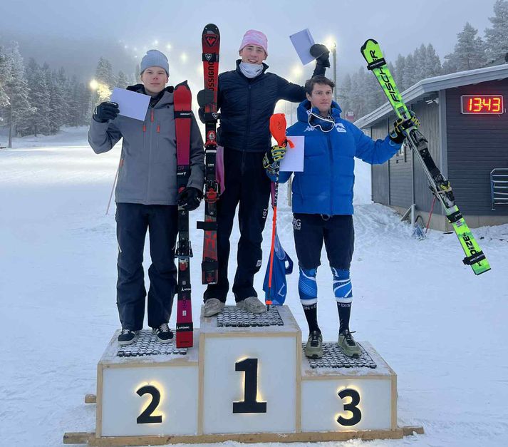 Hann vann svigmótið í dag og endaði í öðru sæti í gær. Jón Erik var með þriðja besta tímann í fyrri ferðinni en vann sig upp í efsta sætið í þeirri síðari. Jón Erik náði síðan besta tímanum í seinni ferðinni og bar sigur úr bítum eftir afar spennandi baráttu við Finnann Erik Saravuo sem var 0,07 sek á eftir honum. Fyrir árangurinn fékk hann 23 FIS-punkta sem er hans besti punktaárangur á ferlinum og styrkir sömuleiðis stöðu hans á Ólympíulistanum. Jón Erik átti líka frábæra seinni ferð í gær. Hann tryggði sér þá annað sætið eftir að hafa verið með fimmta besta tímann í fyrri ferðinni. „Ég er ánægður með góða byrjun á vetrinum en ég á nóg inni og við erum rétt að byrja,“ sagði Jón Erik í stuttu spjalli við heimsíðu Skíðsambands Íslands. Jón Erik Sigurðsson efstur á verðlaunapallinum.ski.is