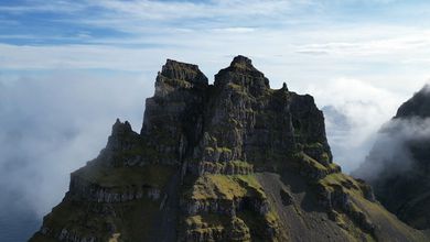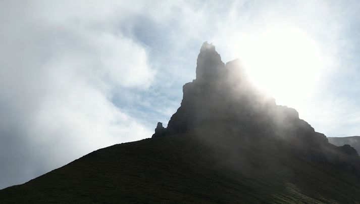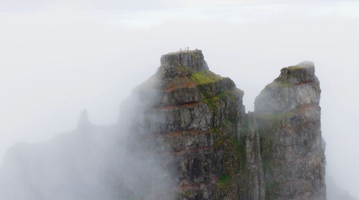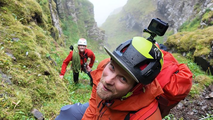 „Þegar ég sá Súlur hugsaði ég bara: „Ég verð einhvern veginn að standa þarna uppi.“ Þannig ég fór fyrst í fjallgöngu þarna upp, skoðaði þetta og drónaði,“ segir Garpur um fjallið Súlur í Eyjafirði sem er til umfjöllunar lokaþætti seríunnar Okkar eigið Ísland. „Svo fór ég aðra ferð og þá ætlaði ég að athuga hversu hátt ég kæmist án þess að lenda í veseni sem, eftir á að hyggja, var ekki sniðugt.“ Fann ekki fyrir neinu eftir fallið Garpur komst ekki nema upp fyrstu fimmtán metrana vegna þess hve erfitt undirlendið var, mosagróið, illfært og grjótið ansi laust í sér. „Þetta er allt drasl, allt óþægilegt og mér líður aldrei vel. Þetta fjall gefur manni ekkert rosalega mikinn afslátt, sérstaklega þessa fyrstu metra. Svo er ég að fara upp smá kafla sem lítur ekki út fyrir að vera þægilegur og þá (ég átta mig ekki á því hvað gerist, steinn losnað og ég misst takið) fleygist ég af fjallinu,“ segir Garpur. Súlur er tilkomumikið fjall, um 1.213 metrar að hæð. „Ókei, þetta er bara búið, ég átti gott líf, þetta var skemmtilegt og fullt af góðum minningum,“ segist hann hafa hugsað með sér meðan hann flaug í loftinu. Garpur skoppaði niður mósagróið fjallið og lenti líklega þrisvar utan í því áður en hann lenti. Hann var sem betur fer í línu og hefði því ekki getað dottið lengra en þrjátíu metra. „Svo lendi ég með hausinn niður í móti við brún og tuttugu-þrjátíu metra fall eftir það. Ég finn engar tilfinningar, hvorki líkamlega né andlega, ekki neitt, ég bara ligg þarna. Svo fer ég að hreyfa tærnar og þær hreyfast og hreyfi hausinn varlega til hliðanna, þreifa á hausnum á mér og öxlunum og finn að Go-Pro-vélin sem ég var með á hausnum er farin þannig ég hef greinilega lent á hausnum,“ segir hann. „Ég ákvað að ég yrði að koma þarna aftur og kalla til liðsauka,“ segir hann um fjallið og sú ganga er umfjöllunarefnið í lokaþætti fjallgönguþáttanna Okkar eigið Ísland sem hafa verið sýndir á Vísi í haust og vetur. Fjallið er stundum umvafið skýjum. Miserfitt að sannfæra vinina Garpur heyrði í Andra Má Ómarssyni, Bergi Sigurðssyni og Jónasi G. Sigurðssyni. Þrátt fyrir að verkefnið virtist ógnvænlegt reyndist Garpur of sannfærandi og ákváðu þremenningarnir því að slá til og fara með honum. „Ég var svo spenntur að klára þetta, losa þetta úr hausnum mínum, ég var búinn að hugsa svo mikið um þetta. Þetta var búið að festast í sjálfsmyndinni minni að hafa dottið þarna,“ segir Garpur. Krefjandi klifur. Mennirnir héldu því af stað norður keyrandi. Eftir ágætis bíltúr tók við eins og hálfs tíma ganga upp að rótum Súlna sem var þakið í þoku og skýjabakka. Fljótt áttuðu mennirnir þrír sem Garpur hafði fengið með sér að klifrið yrði krefjandi, undirlagið þakið lafþunnum mosa og illfæru grjóti. „Ég fann það alveg strax að ég hafði náð að sannfæra Andra um að koma með en hann var ekkert peppaðasti gæinn þegar hann sá í hvað stefndi. Jonni er alltaf til í allt og Bergur var spenntastur af okkur,“ segir Garpur um viðmót þremenninganna. „Ég hlakka til þegar þú fyrirgefur mér“ Eftir því sem fjórmenningarnir klifruðu hærra varð erfiðara fyrir þá sem voru komnir upp að eiga í samskiptum við þá sem voru niðri og öfugt. Mosinn var sömuleiðis svo sleipur að þeir runnu ítrekað með tilheyrandi grjóthruni í átt að næsta manni. „Ég hlakka til þegar þú fyrirgefur mér,“ sagði Garpur við Andra í miðju klifrinu. „Gæti verið svolítið í það,“ svaraði Andri sem sagðist síðar hafa viljað vera hvar sem er annars staðar en akkúrat þarna á þeim tímapunkti. Þokan minnkaði aðeins þegar mennirnir voru komnir upp. Upplýsingar um klifurleiðina voru af skornum skammti og fóru þeir félagar fljótt að hafa áhyggjur af því hvernig þeir kæmust niður. Til allrar hamingju batnaði undirlendið eftir því sem þeir komust hærra, mosinn og mulningurinn véku fyrir traustara bergi. Þrátt fyrir það var smá hasar eftir enda þykk þoka sem umvafði toppinn. Hægt er að sjá alla ferðasöguna, klifrið og spennandi lokahlutann í þættinum í heild sinni hér að neðan: