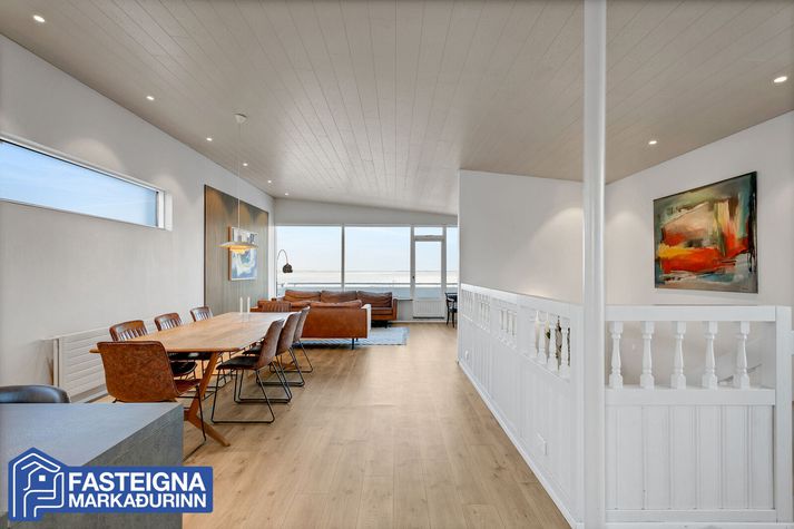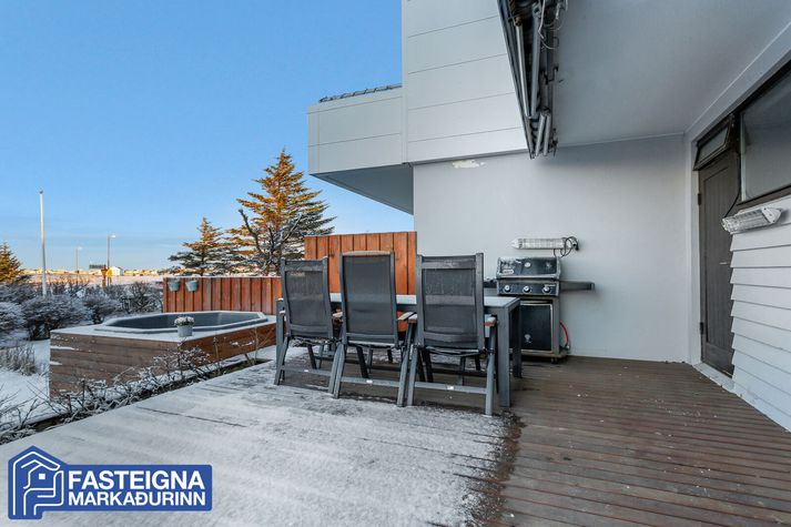 Á fasteignavef Vísis kemur fram að um sé að ræða 180,8 fermetra raðhús með innbyggðum 22,7 fermetra bílskúr. Eignin hefur verið mikið endurnýjuð. Ásett verð er 170 milljónir. Má meðal annars finna við húsið viðarverönd og heitan pott. Þannig var baðherbergi á báðum hæðum endurnýjað 2024 og 2025 og árið 2020 var sem dæmi sett innbyggð LED-lýsing í loft á efri hæð. Fasteignamarkaðurinn Fasteignamarkaðurinn Fasteignamarkaðurinn Fasteignamarkaðurinn Fasteignamarkaðurinn Fasteignamarkaðurinn Fasteignamarkaðurinn Fasteignamarkaðurinn Fasteignamarkaðurinn Fasteignamarkaðurinn