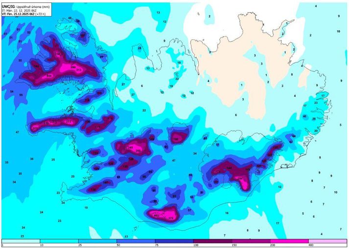 Veðurstofa Íslands gerir ráð fyrir sunnanstormi um jólin og spáir hlýindum, leysingu og talsverðri rigningu. Vegna þessa er búið að gefa út úrkomuviðvörun fyrir Suðurland, Faxaflóa, Breiðafjörð og Vestfirði. Sunnanstormur er væntanlegur á morgun og talið að mikil rigning fylgi hvassviðrinu. Búist er við að þessu veðri fylgi talsverð uppsöfnuð úrkoma. Á Snæfellsnesi er spáð 100 til 150 millimetra úrkomu á láglendi yfir þrjá sólarhringa. Sömu tölur er að sjá á Vestfjörðum, að því er fram kemur í tilkynningu frá Veðurstofunni. Samfara hlýindum og úrkomu í þessu magni er sagt hætt við vatnavöxtum í ám og lækjum. Vegna magns úrkomu megi heldur ekki útiloka vatnsflóð í kringum vatnsfarvegi. Þá sé gott að huga að niðurföllum í kringum hús til að forðast vatnstjón. Skriðuhætta mest á Snæfellsnesi og Vestfjörðum Einnig getur skapast skriðuhætta í þessum aðstæðum, að sögn sérfræðinga Veðurstofunnar. Auknar líkur séu á skriðuföllum þar sem úrkoman sé mest eða einna helst á Snæfellsnesi og Vestfjörðum. Ofanflóðavakt Veðurstofunnar bendir sérstaklega á grjóthrunshættu þar sem mikil umferð sé á þessum tíma árs. Varað er við vegum undir bröttum hlíðum sem eru þekktir fyrir grjóthrunshættu. Þar megi nefna vegi um Súðavíkurhlíð, Raknadalshlíð, Hafnarmúla, Barðaströnd og undir Búlandshöfða. Á þeim svæðum sem mestri rigningu er spáð verði að mestu snjólaust en þar sem snjór sé í giljum og lækjarfarvegum geti krapaflóð fallið meðan veðrið stendur yfir. Spáð uppsöfnuð úrkoma 22 til 25. desember.Veðurstofa Íslands Ofanflóðavakt Veðurstofunnar biður því fólk um að sýna aðgát þegar ferðast er undir bröttum hlíðum, horfa í kringum sig og forðast að dvelja lengi innan og neðan farvega. Auk þess þurfi að hafa í huga að skriður geti fallið eftir að mesta ákefð rigningar sé liðin hjá. Þá er fólk hvatt til að fylgjast með veðurspám, viðvörunum og ástandi vega á vef Vegagerðarinnar. Sunnanstormur á morgun Um hádegi á morgun kemur sunnanstormur að vestanverðu landinu sem varir fram yfir aðfangadag jóla, 24. desember. Hvassviðrinu fylgir mikil rigning og hlýindi, að sögn Veðurstofunnar. Mest rignir um sunnan- og vestanvert landið en önnur landsvæði verða að mestu þurr. Á aðfangadagskvöld fer að draga úr vindi og úrkomu. Áfram verður hlýtt á jóladag, fimmtudaginn 25. desember, og súld eða rigning með köflum á sunnan- og vestanverðu landinu.