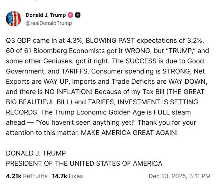 Blússandi hagvöxtur í Bandaríkjunum Jón Ísak Ragnarsson skrifar 23. desember 2025 23:17 Trump á samkomu í síðustu viku. AP Hagvöxtur í Bandaríkjunum jókst hraðar en björtustu spár höfðu gert ráð fyrir á þriðja ársfjórðungi, þar sem útflutningur jókst og innlend eftirspurn var sterk. Hagvöxtur mælist nú 4,3 á ársgrundvelli, en á öðrum ársfjórðungi mældist hann 3,8 prósent, og er því um að ræða mesta hagvöxt sem mælst hefur á síðustu tveimur árum. Erlendir miðlar eins og BBC fjalla um málið en þar segir að Bandaríkjamenn hafi verið að fást við ýmsar áskoranir í innflytjendamálum og milliríkjaviðskiptum, en hagkerfið hafi staðið þetta af sér. Fram kemur að innflutningur Bandararíkjamanna hafi dregist saman í kjölfar umfangsmikilla innflutningstolla sem ríkisstjórn Donalds Trump lagði á flest önnur ríki. Donald Trump, Bandaríkjaforseti, og Jerome Powell, seðlabankastjóri Bandaríkjanna fara yfir málin.AP Útflutningur hafi aftur á móti aukist verulega, eða um allt að 7,4 prósent. Aftur á móti hafi dregið úr fjárfestingum í Bandaríkjunum, og þá sé húsnæðismarkaðurinn erfiður erfiður og vextir enn þokkalega háir. „Þetta hagkerfi hefur staðið af sér allar dómsdagsspár síðan 2022,“ segir Aditya Bhave, aðalhagfræðingur bankans Bank of America við BBC. Hagvöxturinn hafi verið umfram spár bankans, sem gerðu ráð fyrir um 3,2 prósenta vexti. Í umfjöllun Telegraph er fullyrt að hagvöxturinn sé drifinn áfram af gríðarlegum fjárfestingum í gervigreindarfyrirtækjum og gagnaverum í tengslum við þau. Haft er eftir sérfræðingum þýska bankans Deutsche Bank, að án gervigreindarverkefnanna hefði hagvöxtur í Bandaríkjunum sennilega verið neikvæður. Í frétt Telegraph segir að útflutningur hafi aukist um 8,8 prósent á ársgrundvelli, og innflutningur dregist saman um 4,7 prósent. Donald Trump sagði í færslu á samfélagsmiðlum að árangurinn væri ábyrgri ríkisstjórn og tollastefnunni að þakka. „Fulla ferð áfram í gullöld Trumps. Við erum rétt að byrja,“ sagði hann. Truth Social Donald Trump Bandaríkin Mest lesið Ríkissjóður greiðir fyrir flutning hinna látnu til Íslands Innlent Gaf fingurinn á Miklubraut Innlent „Ég hef aldrei upplifað annan eins harm“ Innlent Falskar netverslanir: Auglýsir rýmingarsölu nokkrum dögum eftir opnun Innlent „Krítískur massi af snarbrjáluðu fólki nær yfirhöndinni“ Innlent Hyggst kæra dyraverði Auto til lögreglu Innlent Ný könnun Maskínu: „Væri alveg ný staða í íslenskum stjórnmálum“ Innlent Hrindir af stað söfnun fyrir móður stúlkunnar sem lést í Suður-Afríku Innlent Maðurinn fundinn Innlent Íslendingur í gæsluvarðhaldi í Kólumbíu vegna gruns um kynferðisbrot Innlent Fleiri fréttir Blússandi hagvöxtur í Bandaríkjunum Nýjar ákærur á hendur Russell Brand Fleiri Epstein-skjöl birt: Prinsinn bað um „óviðeigandi vinkonur“ Saka AfD um að ganga erinda Kremlverja Kínverjar og Rússar lýsa yfir stuðningi við Venesúela Skapari Call of Duty lést í bílslysi Trump nefnir nýja kynslóð orrustuskipa í höfuðið á sjálfum sér „Bandaríkin eiga ekki að taka yfir Grænland“ Nýr ritstjóri stöðvaði umfjöllun um brottvísanir Trump Breiddi út faðminn fyrir rasista: „Þið þurfið ekki að biðjast afsökunar á að vera hvít lengur“ Sprengdu rússneskan hershöfðingja í loft upp í Moskvu Undirbúningur árásarinnar stóð yfir í marga mánuði Trump skipar sendifulltrúa fyrir Grænland Segir unnið að því að móta sameiginlega nálgun Bandaríkjanna, Úkraínu og Evrópu Sýknaður af nauðgun eftir að hafa verið skimaður fyrir sjaldgæfri svefnröskun Málið sem Trump getur ekki losað sig við Grunaður um manndráp eftir að tveggja ára drengur féll úr blokk Fóru um borð í vélvana rússneskt skip Baulað á Albanese á minningarathöfn á Bondi-strönd Kvarta yfir ritskoðun Epstein-skjala: „Við vitum ekki hvað við vitum ekki“ Níu skotnir til bana á krá Sextán ára fékk greitt fyrir að færa Epstein stúlkur Ljósmyndir horfnar úr Epstein-skjölunum, þar á meðal ein af Trump Vilja dauðarefsingu af borðinu vegna hagsmunaáreksturs ráðherra Pútín sagður hafa valið Witkoff Gerðu umfangsmiklar árásir gegn ISIS í Sýrlandi Það helsta úr fyrsta skammti Epstein-skjalanna Epstein-skjölin birt Draga tilvist neðanjarðarhafs á Títan í efa Réðust á skip úr skuggaflotanum þúsundir kílómetra frá Úkraínu Sjá meira