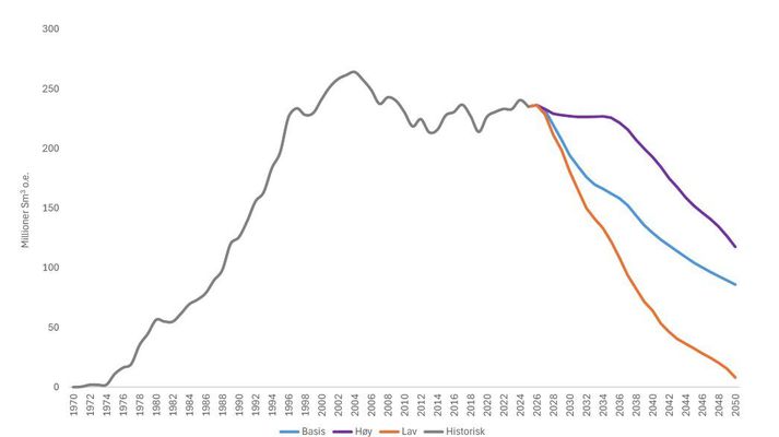 Þetta kemur fram í árlegri samantekt Landgrunnsstofnunar Noregs, sem áður hét Olíustofnun Noregs. Þar segir forstöðumaður stofnunarinnar, Torgeir Stordal, það hvetjandi að sjá að enn sé mögulegt að ná árangri í leit á landgrunnssvæðum sem þegar séu vel nýtt og þróuð. Kort frá Landgrunnsstofnun Noregs yfir olíu- og gasfundi í lögsögu Noregs á árinu 2025.Sokkeldirektoratet „Margar og nokkrar mikilvægar uppgötvanir hafa verið gerðar. Nokkrar af uppgötvunum eru afleiðing þess að ný og háþróuð tækni hefur verið tekin í notkun. Meðal annars hafa verið boraðar borholur á yfir tíu kílómetra dýpi,“ segir stofnunin. Boraðar voru alls 49 holur í lögsögu Noregs á árinu. Af þeim reyndist 21 hola geyma olíu eða gas. Bráðabirgðatölur áætla að þær geti skilað 67 milljónum rúmmetra olíuígilda, sem samsvarar 424 milljónum olíutunna. Tvöfalt meira fannst af olíu en gasi. Langstærsti fundurinn var í ágúst á Yggdrasils-svæðinu í Norðursjó um 180 kílómetra vestur af Bergen í verkefni sem kallast Omega Alfa. Olíufélagið Aker BP metur olíufundinn þar upp á 96 til 134 milljónir olíutunna og segir hann einn þann stærsta við Noreg í áratugi. Þar fór borinn niður á 10,7 kílómetra dýpi. Næstmesti olíu- og gasfundurinn var í mars á svæði sem kallast Kjøttkake, eða Kjötbolla. Það svæði er um 27 kílómetra frá Troll C-gasvinnslusvæðinu, sem er um 65 kílómetra vestur af Sognfirði. Fundurinn er metinn á 39 til 75 milljónir olíutunna. Borpallurinn Deepsea Yantai fann olíu- og gaslindina á Kjøttkake-svæðinu.odfjell drilling Bæði framleiðsla og fjárfestingar norska olíuiðnðarins reyndust mjög miklar á árinu 2025. Olíuvinnslan, upp á 106 milljónir rúmmetra, reyndist sú mesta frá árinu 2009 en lítilsháttar samdráttur varð í gasvinnslu frá metárinu 2024. Samtals voru um 120 milljarðar rúmmetra af gasi seldir. Framleiðsla á norska landgrunninu skiptist nokkurn veginn jafnt á milli olíu og gass. „Við búumst við að gasvinnsla haldist á þessu stigi næstu þrjú til fjögur árin. Norskt gas nemur um 30 prósentum af gasnotkun Evrópusambandsins og Noregur er stærsti birgir Evrópu eftir að gas hætti að berast frá Rússlandi,“ segir Stordal. Þróun olíu- og gasvinnslu Norðmanna. Hún náði hámarki árið 2004 og hefur haldist nokkuð stöðug síðan. Mismunandi sviðsmyndir sýna mikinn samdrátt eftir árið 2027, þó minni ef hert verður á olíuleit.Sokkeldirektoratet Norska landgrunnsstofnunin áætlar að fjárfestingar í leit og vinnslu á árinu 2026 verði um 256 milljarðar norskra króna. Það sé 6,5 prósentum minna en á síðasta ári. Jafnframt er því spáð að fram til ársins 2030 muni fjárfestingarstigið smám saman minnka sem og heildarframleiðsla. Því þurfi að taka ákvarðanir um meiri leit á olíusvæðum Noregs innan skamms tíma ef hægja eigi á yfirvofandi framleiðsluminnkun. „Mikilvægt er að viðhalda mikilli leit. Skortur á fjárfestingum mun leiða til verulegs samdráttar í olíuiðnaðinum,“ segir Landgrunnsstofnun Noregs.