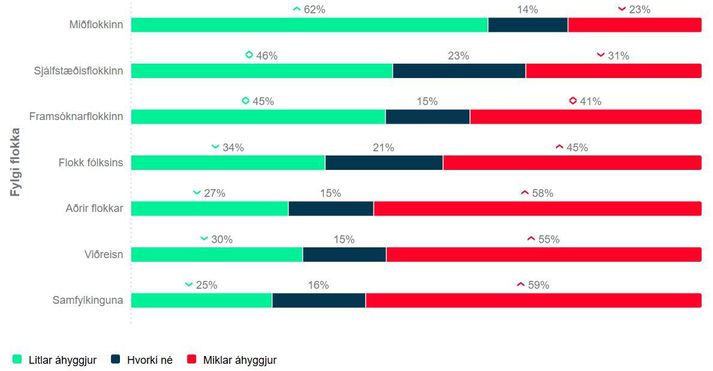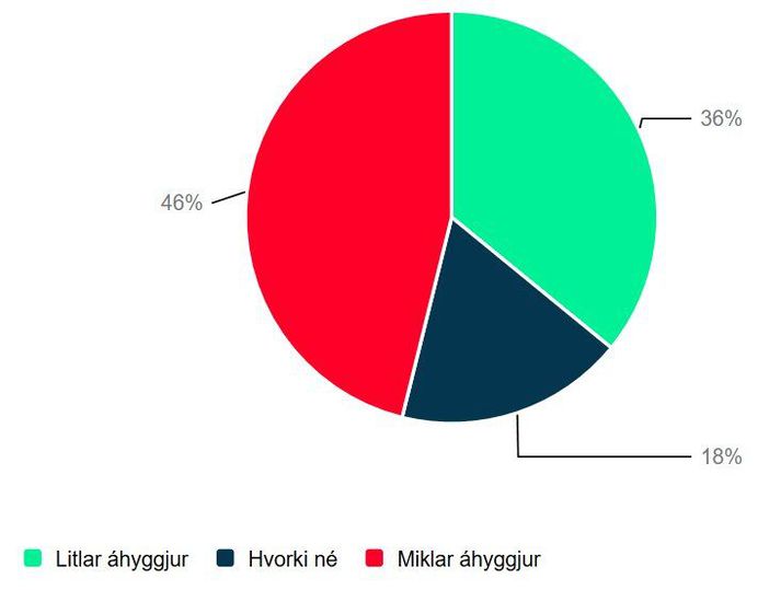 Gögnum var safnað frá 29. janúar til 16. febrúar og voru þátttakendur spurðir eftirfarandi: Hversu miklar eða litlar áhyggjur hefur þú af því að Bandaríkin nái yfirráðum yfir Grænlandi? Tæpur helmingur landsmanna hefur miklar áhyggjur.Prósent Niðurstöður könnunarinnar benda til þess að konur hafi meiri áhyggjur af ásælni Bandaríkjanna í Grænland en karlar. 55 prósent kvenna sem tóku afstöðu sögðust hafa miklar áhyggjur en 38 prósent karla. Aðeins 26 prósent kvenna sögðust hafa litlar áhyggjur en 45 prósent karla. Fylgjendur Miðflokksins og Sjálfstæðisflokksins hafa marktækt minni áhyggjur en fylgjendur annarra flokka og Miðflokksmenn alveg einstaklega rólegir. 62 prósent fylgjenda Miðflokksins hafa litlar áhyggjur og aðeins 23 prósent miklar. 46 prósent Sjálfstæðismanna sögðust hafa litlar áhyggjur en 31 prósent miklar. Áhyggjur landsmanna af ásælni Bandaríkjanna í Grænland eftir flokkum.Prósent Jafnaðarmenn hafa mestu áhyggjurnar, 59 prósent þeirra sögðust hafa miklar áhyggjur og aðeins 25 prósent litlar.