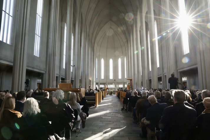 Síðasta opinbera útförin var þegar Halldór Ásgrímsson fyrrverandi forsætisráðherra var borinn til grafar 2015. Þá var opinber útför þegar Steingrímur Hermannsson fyrrverandi forsætisráðherra var kvaddur árið 2010. Opinberar útfarir voru tíðari á árum áður en virtir listamenn á borð við Kjarval og Laxness voru meðal þeirra sem hlutu opinbera útför. Séra Geir Waage gengur inn kirkjugólfið við upphaf athafnar.vísir/Vilhelm Séra Geir Waage stýrði athöfninni og flutti minningarorð um Davíð. Þar vitnaði hann meðal annars til sálma Davíðs úr Biblíunni. Kristinn Sigmundsson söng ásamt karlakórnum Fóstbræðrum og Sigurgeir Agnarsson lék Slá þú hjartans hörpustrengi eftir Bach á selló við upphaf athafnar. Í lok athafnar var lagið Ísland er land þitt flutt áður en Tómas Guðni Eggertsson organisti spilaði Við Reykjavíkurtjörn, lag Gunnars Þórðarsonar sem Davíð samdi textann við til Ástríðar konu sinnar. Ástríður Thorarensen eiginkona Davíðs og Þorsteinn Davíðsson sonur þeirra á fremsta bekk ásamt Heiðrúnu Geirsdóttur eiginkonu sinni og dætrum þeirra tveimur.Vísir/Vilhelm Vilhelm Gunnarsson ljósmyndari Vísis var með myndavélina á lofti og myndaði gesti og það sem fyrir augu bar. Séra Geir Waage les upp úr guðspjallinu. Geir er tengdafaðir Þorsteins sonar Davíðs.Vísir/Vilhelm Sólin skein inn um háa glugga Hallgrímskirkju á meðan útför stóð.Vísir/Vilhelm Karlakórinn Fóstbræður undir stjórn Árna Harðarsonar söng við útförina.vísir/Vilhelm Daði Már Kristófersson fjármálaráðherra.vísir/Vilhelm Líkmennirnir og vinir Davíðs þeir Haraldur Johannessen ritstjóri, Hannes Hólmsteinn Gissurarson prófessor í stjórnmálafræði, Þórólfur Gíslason kaupfélagsstjóri, Þórarinn Eldjárn skáld og Kjartan Gunnarsson fyrrverandi framkvæmdastjóri Sjálfstæðisflokksins sátu á fremsta bekk.Vísir/Vilhelm Bjarni Benediktsson var formaður Sjálfstæðisflokksins í sextán ár en Davíð í fjórtán. 27 ára seta Ólafs Thors í stóli formanns verður seint leikin eftir. Þóra Margrét Baldvinsdóttir eiginkona Bjarna var með í för í dag.Vísir/vilhelm Ólafur Ragnar fyrrverandi forseti ásamt Dorrit Moussaieff eiginkonu sinni.Vísir/Vilhelm Gunnlaugur Sævar Gunnlaugsson, stjórnarformaður Ísfélagsins í Vestmannaeyjum, og Ásgeir Jónsson seðlabankastjóri voru á meðal líkmanna.Vísir/Vilhelm Guðrún Karls Helgudóttir biskup Íslands fylgdist með Geir Waage stýra athöfninni.Vísir/Vilhelm Halla Tómasdóttir forseti og Björn Skúlason eiginmaður hennar. Kristrún Frostadóttir forsætisráðherra og Benedikt Bogason forseti Hæstaréttar voru með þeim á öðrum bekk en öll þrjú eru handhafar forsetavalds.Vísir/vilhelm Skjáir voru í kirkjunni til að auðvelda fólki að fylgjast með athöfninni.Vísir/Vilhelm Líkmennirnir tíu ganga inn í kirkjuna. Gunnlaugur Sævar Gunnlaugsson, Ólafur Börkur Þorvaldsson, Ásgeir Jónsson, Eiríkur Jónsson, Albert Jónsson, Haraldur Johannessen, Hannes Hólmsteinn Gissurarson, Þórólfur Gíslason, Þórarinn Eldjárn og Kjartan Gunnarsson.Vísir/Vilhelm Ráðherrar ríkisstjórnarinnar gáfu ekki kost á viðtölum eftir ríkisstjórnarfund í dag vegna skamms tíma á milli fundar og fram að útför. Hér eru Jóhann Páll Jóhannsson og Alma Möller.Vísir/Vilhelm Guðrún Hafsteinsdóttir formaður Sjálfstæðisflokksins virðir líkmennina Hannes Hólmstein, Þórólf Gíslason, Þórarinn Eldjárn og Kjartan Gunnarsson fyrir sér.Vísir/vilhelm Katrín Jakobsdóttir og Bjarni Benediktsson fallast í faðma en þau voru saman í ríkisstjórn frá 2017 til 2024. Vísir/Vilhelm Guðna Th. Jóhannessyni fyrrverandi forseta vísað til sætis.vísir/vilhelm Geir Haarde og Friðrik Sophusson takast í hendur. Inga Jóna Þórðardóttir eiginkona Geirs er til hægri.vísir/vilhelm Þorsteinn Pálsson og Sigurður Ingi Jóhannsson takast í hendur. Eitt af mörgum handaböndum Sjáflstæðismanns og Framsóknarmanns en flokkarnir hafa mannað marga ríkisstjórnina saman.vísir/vilhelm Séra Geir Waage gengur inn í kirkju og studdist við staf.vísir/vilhelm Þórarinn Eldjárn og Kjartan Gunnarsson voru góðir vinir Davíðs en allir þrír voru MR-ingar og höfðu gaman af bókum og listum.Vísir/Vilhelm Ráðherrarnir Eyjólfur Ármannsson og Þorbjörg Sigríður Gunnlaugsdóttir hleypa Þorgerði Katrínu Gunnarsdóttur félaga sínum úr ríkisstjórninni í sæti sitt.vísir/vilhelm Stórsöngvarinn Kristinn Sigmundsson söng við athöfnina.vísir/vilhelm Guðrún Bryndís Karlsdóttir biskup bent á hvar hún á að sitja.vísir/vilhelm Halla Tómasdóttir forseti Ísands mætir til athafnar svartklædd líkt og flestir gestir í dag.vísir/vilhelm Ásgeir Jónsson seðlabankastjóri var meðal líkmanna en Davíð var um tíma einn þriggja seðlabankastjóra landsins.Vísir/vilhelm Sigmundur Davíð Gunnlaugsson formaður Miðflokksins mætir ásamt Önnu Sigurlaugu Pálsdóttur eiginkonu sinni.Vísir/vilhelm Hannes Hólmsteinn Gissurarson hefur lýst Davíð Oddssyni sem sínum besta vini.Vísir/vilhelm Geir Haarde tók við formennsku í Sjálfstæðisflokknum af Davíð á sínum tíma. Þá var hann fjármálaráðherra í ríkisstjórn Davíðs.vísir/vilhelm Þorsteinn Davíðsson sonur Davíðs og héraðsdómari var á fremsta bekk.Vísir/vilhelm Þórdís Kolbrún Reykfjörð Gylfadóttir þingmaður Sjálfstæðisflokksins.Vísir/Vilhelm Guðni Ágústsson fyrrverandi formaður Framsóknarflokksins og Lilja Dögg Alfreðsdóttir nýkjörinn formaður flokksins sátu hlið við hlið.Vísir/vilhelm Árni Harðarson stýrði Karlakórnum Fóstbræðrum.vísir/Vilhelm Fjölskylda Davíðs fyrir utan Hallgrímskirkju að athöfn lokinni. Horfa á eftir kistunni á leið í líkbílinn.vísir/vilhelm Lögregluþjónar báru kistu Davíðs úr kirkjunni og fram