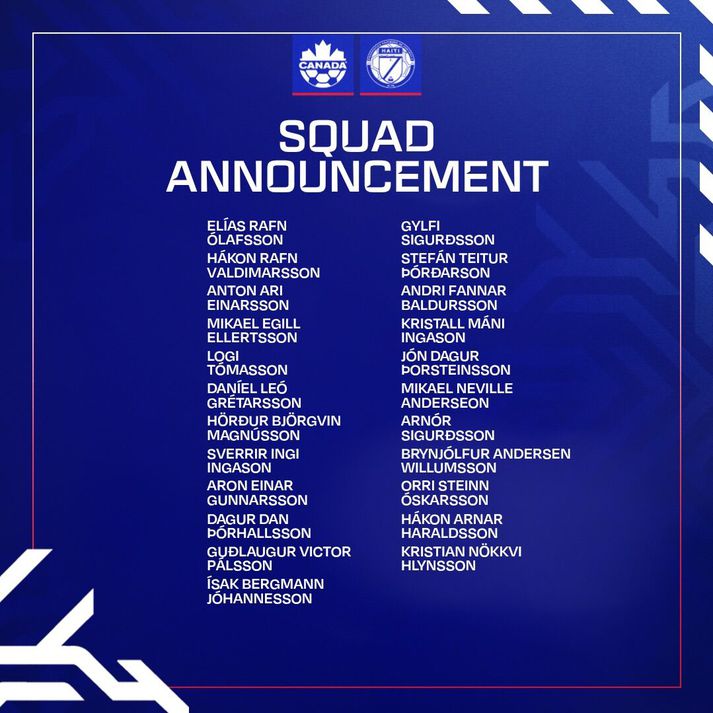 Arnar gat að þessu sinni valið sinn sterkasta hóp eftir að hafa farið með leikmannahóp nánast aðeins skipaðan leikmönnum úr Bestu deildinni, í leikinn við Mexíkó í febrúar. Hópinn má sjá hér að neðan en á meðal þess sem vekur athygli er að Gylfi Þór Sigurðsson, leikmaður Íslandsmeistara Víkings, heldur sæti sínu í hópnum frá leiknum við Mexíkó. Frá því að Arnar tók við landsliðinu snemma árs 2024 hefur hann ekki valið Gylfa í mótsleiki eða aðra leiki þar sem Ísland hefur haft sinn sterkasta hóp. Leikmannahópur Íslands gegn Kanada og Haítí.KSÍ Dagur Dan Þórhallsson, leikmaður CF Montreal í MLS-deildinni, fær einnig tækifæri í hópnum, sem og Kristall Máni Ingason úr Brann sem Arnar þekkir vel, og þá snýr Arnór Sigurðsson aftur eftir fjarveru vegna meiðsla. Á meðal þeirra sem ekki eru í hópnum að þessu sinni eru Albert Guðmundsson, sem Arnar segir vera vegna meiðsla sem hann hafi glímt við, og Jóhann Berg Guðmundsson sem er án félags. Arnar kynnir hópinn í beinni útsendingu á Vísi.