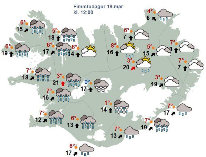 Hvassviðri og talsverð rigning Atli Ísleifsson skrifar 19. mars 2026 07:13 Spáð er hlýnandi veðri þar sem hiti verður á bilinu fimm til þrettán stig. Vísir/Vilhelm Alldjúp lægð fyrir vestan land stýrir veðrinu fram á helgi og veldur hún sunnan hvassviðri eða stormi með talsverðri rigningu, einkum sunnan- og vestantil. Fremur hlýtt verður í veðri. Á vef Veðurstofunnar segir að seinni partinn fari skil lægðarinnar austur yfir land. Vindur verður þá vestlægari, með skúrum og síðar éljum í kvöld, en úrkomulítið norðaustan- og austanlands. Kólnar í veðri. „Lægðin þokast til norðausturs og á morgun er spáð suðvestan hvassviðri eða stormi með dimmum éljum og vægu frosti, sem sagt öflugum útsynningi. Austurland ætti þó að sleppa að mestu við élin. Á laugardag fer smám saman að lægja, en þá nálgast næsta lægð úr suðri. Aðfaranótt sunnudags hvessir líklega talsvert af norðvestri með snjókomu þegar lægðin fer hjá, skammt austur af landinu. Á sunnudaginn fjarlægist lægðin og þá fer að lægja, fyrst vestantil á landinu,“ segir á vef Veðurstofunnar. Spákort fyrir klukkan 12.Veðurstofan Veðurhorfur á landinu næstu daga Á föstudag: Suðvestan 15-23 m/s með dimmum éljum, en þurrt að mestu austanlands. Frost víða 0 til 6 stig. Á laugardag: Suðvestan 13-20 um morguninn og éljagangur, en áfram þurrt á Austurlandi. Lægir smám saman þegar líður á daginn, hiti um eða undir frostmarki. Austlægari og rigning eða snjókoma sunnantil um kvöldið. Á sunnudag: Norðvestan hvassviðri eða stormur, en hægari um landið vestanvert. Víða él, en talsverð snjókoma norðan- og austanlands fram eftir degi. Lægir talsvert seinnipartinn, frost 0 til 5 stig. Á mánudag: Breytileg átt og él á víð og dreif. Frost 0 til 10 stig, kaldast í innsveitum. Á þriðjudag og miðvikudag: Norðlæg átt og él, en yfirleitt þurrt sunnan- og vestanlands. Kalt í veðri. Veður Mest lesið Hafi þegið pening fyrir að giftast kærustu Quang Le Innlent Uppgjör í undirheimunum undir Höfðatorgi Innlent Intuens höfðar mál á hendur landlæknisembættinu Innlent Mun kæra áburð um barnaperraskap til lögreglu Innlent Flugið er líflína milli byggða Grænlands Innlent Trump hótar umfangsmiklum árásum á olíuinnviði Íran Erlent Viðvörun gefin út á Bretlandseyjum vegna heilahimnubólgu Erlent Malbiksskemmdir gríðarlegar þetta árið Innlent Áttu að meta hvort þrettán ára væri nógu þroskuð til að veita samþykki Innlent Afsalar sér verðlaunum fyrir Sykurbað Innlent Fleiri fréttir Hvassviðri og talsverð rigning Holtavörðuheiði lokað á miðnætti og tvísýnt um Öxnadalsheiði Víða hægir vindar en hvessir í kvöld Enn viðvaranir og óvissustig vegna snjóflóðahættu Veðurviðvaranir vegna sterkra hviða og mikillar snjókomu Holtavörðuheiðin opin á ný Bætir í norðaustanáttina að nýju Loka heiðinni og opna fjöldahjálparstöð: Biðja „ALLA“ um að halda sig heima Önnur rúta fór út af og Hringvegi lokað að hluta „Blint í stórhríð á Vestfjörðum“ Gular viðvaranir á norðvesturhorninu: Rýma atvinnuhúsnæði og loka vegum Hvessir á mestöllu landinu í kvöld Stífri norðanátt beint til landsins og vegir lokaðir Reiknað með stormi vestantil og hríðarviðvaranir í gildi Færð geti víða spillst hratt Él og slydduél í dag og önnur lægð á morgun Eldingu laust niður á höfuðborgarsvæðinu Gul viðvörun og enn líkur á eldingum Varað við þrumuveðri með tíðum eldingum Kröpp lægð yfir landinu og úrkoman blönduð Gular veðurviðvaranir í kortunum Köldu lofti beint til landsins Gular viðvaranir á suðvesturhorninu Ört dýpkandi lægð á leiðinni og appelsínugular viðvaranir Appelsínugul viðvörun á morgun Vara við stórhríð á Austurlandi Snjókoma víða en bjart sunnan heiða Væta sunnantil og töluverð hláka í höfuðborginni Hvetja fólk til að fara fyrr heim vegna veðurs Gul viðvörun á höfuðborgarsvæðinu vegna snjókomu Sjá meira