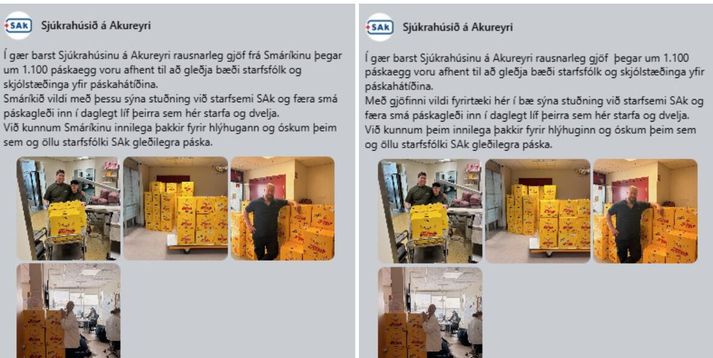 Sjúkrahúsið skilar ekki páskagjöf Smáríkisins Sólrún Dögg Jósefsdóttir skrifar 3. apríl 2026 12:10 Smáríkið, nýliði í áfengissölu á Akureyri, keypti samtals tvö þúsund páskaegg handa framlínustarfsfólki í bænum. Facebook/Tryggvi Páll Foreldrasamtök gegn áfengisauglýsingum fara fram á að starfsfólk Sjúkrahússins á Akureyri skili páskaeggjum sem það fékk að gjöf frá Smáríkinu, sem opnaði í bænum í vikunni. Forstjóri sjúkrahússins segist hingað til hafa tekið við öllum gjöfum og ekki gert upp á milli gefenda. Verkferlar verði þó skoðaðir. Árni Guðmundsson, formaður Foreldrasamtaka gegn áfengisauglýsingum, sendi Erlu Björnsdóttur, settum forstjóra Sjúkrahússins á Akureyri, bréf þar sem hann krafðist þess að 1.100 páskaeggjum sem sjúkrahúsinu barst frá Smáríkinu yrði skilað. Í bréfinu sagði hann meðal annars alvarlegt mál að heilbrigðisstofnun taki við gjöf frá fyrirtæki sem starfi af einbeittum brotavilja og gangi gegn öllum markmiðum heilbrigðiskerfisins. Þá bendir hann á að fyrirtækið sæti ákæru fyrir ólöglega áfengissölu. Facebook-færslu Sjúkrahússins á Akureyri um gjöfina var breytt en í seinni útgáfu er Smáríkisins ekki getið.Facebook Árni segir að Smáríkið starfi á skjön við lög og öll markmið heilbrigðiskerfisins. Því sé það „hvítþvottur“ á brotastarfsemi að taka við gjöf frá slíkum fyrirtækjum og birta þakkarfærslu þess efnis. Nánar má lesa um bréf Árna í frétt Akureyri.net um málið. Greint var frá því í fyrra að framkvæmdastjóri Icelandic Trading Company b.v, sem rekur Smáríkið, hefði verið ákærður vegna meints brots á ákvæði áfengislaga um einkarétt ríkisins til smásölu áfengis. Gera ekki upp á milli Erla Björnsdóttir segir í samtali við fréttastofu að sjúkrahúsinu berist ýmis konar gjafir frá einstaklingum og fyrirtækjum í formi matvæla, svo sem páskaeggja, bakkelsis og pítsu, og verðmæta, eins og til dæmis málverka. Erla Björnsdóttir er settur forstjóri Sjúkrahússins á Akureyri. „Staðan er sú að við tökum við öllum gjöfum og höfum ekki gert upp á milli gefenda hingað til. Við tökum því þannig að þetta sé velvilji,“ segir Erla. Allar ábendingar séu þó vel þegnar og framvegis verði verklag skoðað í þessum efnum. Hún hafi þegar svarað bréfi Árna. En skiljið þið gagnrýnina? „Ég held ég tjái mig sem minnst um það. En við tökum öllum ábendingum sem okkur berast.“ Netverslun með áfengi Akureyri Sjúkrahúsið á Akureyri Páskar Mest lesið Glórulaust að veginum hafi ekki verið lokað fyrr Innlent Sjúkrahúsið skilar ekki páskagjöf Smáríkisins Innlent Brotist inn og gert sig heimakominn Innlent Bondi vikið úr embætti dómsmálaráðherra Erlent Ljósmyndarinn lifir ekki á „tagginu“ einu saman Innlent Kjartan Guðmundsson er látinn Innlent Innanlandsflugi aflýst vegna veðurs Innlent Íslendingur tók þátt í að gera tunglskotið að veruleika Innlent Framsókn næði ekki inn á þing Innlent Þáttaskil í sögu Lýðskólans á Flateyri Innlent Fleiri fréttir Sjúkrahúsið skilar ekki páskagjöf Smáríkisins Glórulaust að veginum hafi ekki verið lokað fyrr Brotist inn og gert sig heimakominn Ljósmyndarinn lifir ekki á „tagginu“ einu saman Framsókn næði ekki inn á þing Þáttaskil í sögu Lýðskólans á Flateyri Innanlandsflugi aflýst vegna veðurs Hryðjuverkamálið á dagskrá Landsréttar í maí Umferðin gengur hægt en stóráfallalaust fyrir sig Íslendingur tók þátt í að gera tunglskotið að veruleika Oddvita sparkað af listanum og segir af sér formennsku Sendiherrum og skrifstofustjórum stokkað Ísland, Grænland og Færeyjar saman hefðu sterka samningsstöðu Kjartan Guðmundsson er látinn Sjálfstæðismenn og óháðir staðfesta listann í Vogum New York Times fjallar um íslenskar pylsur: Ekkert jafnist á við eina með öllu Stjórnstöð í Kópavogi sem líkist geimferðamiðstöð „Leyfið grínurunum aðeins að eiga sviðið í dag“ Vilja fá valdið aftur Hátt í sextíu prósent óánægð með störf borgarstjóra „Ég táraðist í flugvélinni“ Finna aukna fordóma: Syninum sagt að „drulla sér aftur upp í tré“ Yfirgaf Sjálfstæðisflokkinn og leiðir Miðflokkinn í Borgarbyggð Enn ein veðurviðvörunin yfirvofandi í nótt Síðasti séns til að skrá kílómetrastöðuna Páskaeggja-„hefðinni“ var komið á í Covid Gestum neyðarskýla fækkar verulega milli ára Ráðherra vissi af gabbi um kílómetragjald fyrir fram Icelandair á leið til Möltu og heimilislausum fækkar Segja Skúla Tómas hafa hneppt móður þeirra í „lyfjafjötra“ Sjá meira