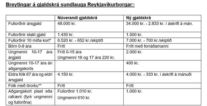 Verð á stökum miða í sund hækkar en árskortið lækkar Silja Rún Sigurbjörnsdóttir skrifar 15. apríl 2026 11:33 Fastagestir í sund geta glaðst en þeir sem sækja sund af og til þurfa að greiða meira. Vísir/Vilhelm Breytingar á gjaldskrám sundlauga Reykjavíkurborgar, Ylstrandarinnar og Fjölskyldu- og húsdýragarðsins voru samþykktar í borgarstjórn í gær. Ársgjaldið í sundlaugarnar lækkar en stakur miði er dýrari. Í fréttatilkynningu frá Reykjavíkurborg segir að ný gjaldskrá hafi það að markmiði að hvetja til aukinnar notkunar og stuðla að sanngjarnari gjaldskrá. Hún eigi að umbuna borgarbúum sem eru fastagestir en á sama tíma tryggja að aðrir gestir borgi nær raunkostnaði fyrir þjónustuna. Þar er sérstaklega minnst á erlent ferðafólk sem sækir þessa þjónustu borgarinnar. Ársgjaldið í sund fer úr 48 þúsund krónum í 34 þúsund krónur á meðan stakt gjald fer úr 1430 krónum í 1500 krónur. Þá hækkar tíu miða kort úr 6.520 krónum í 7 þúsund krónur. Reykvísk ungmenni sem eru sautján ára og yngri fá frítt í sund og á Ylströndina. Breytingarnar taka gildi 5. maí. „Verð á ársmiðum í sund, Ylströnd og Fjölskyldu- og húsdýragarðinn lækkar þannig um 21-77%. Þá er í fyrsta sinn boðið upp á að kaupa ársmiða í áskrift. Ef farið er oftar en einu sinni í viku í sund, einu sinni í mánuði á Ylströndina eða oftar en tvisvar á ári í Fjölskyldu- og húsdýragarðinn, þá borgar sig að vera í áskrift,“ segir í tilkynningunni. Árskort barna í Fjölskyldu- og húsdýragarðinn lækkar um 77 prósent, úr 17.600 krónum í fjögur þúsund krónur, á meðan árskort fullorðinna lækkar um sextíu prósent. Líkt og með sundið þá hækkar verðið á stöku gjaldi fullorðinna, úr 1760 krónum í 2800 krónur. Þá þurfa eldri borgarar nú að greiða fyrir komuna. Í sumar verða sundlaugarnar í Reykjavík opnar lengur. Frá 1. júní til 31. ágúst verða sundlaugar borgarinnar opnar til tíu. Fréttin var uppfærð með nýjum töflum frá Reykjavíkurborg. Sundlaugar og baðlón Reykjavík Borgarstjórn Mest lesið „Já, ég er dálítið reiður“ Innlent Tæpum fjögur hundruð þúsund krónum eytt í vorgjöf Innlent Helgi Bjartur dæmdur í tólf mánaða fangelsi Innlent Sakborningar í Gufunesmálinu mættir í Landsrétt Innlent Skjálfti vegna Írisar innan Sjálfstæðisflokksins í Eyjum Innlent Hælisleitendur aðstoðaðir við að þykjast vera samkynhneigðir Erlent Ók á móti umferð í Hvalfjarðargöng með lögregluna á hælunum Innlent Hæstiréttur hlýðir ekki á Jón Þór Innlent Sjálfsmark með „sjúklega samfylkingarlegu“ kjötvörubanni Innlent Gert að greiða miskabætur eftir að hafa nauðgað táningsstúlku Innlent Fleiri fréttir Margir sátu hjá þegar launin voru hækkuð Halla Bergþóra nýr ríkislögreglustjóri „Nú hef ég auðvitað ekkert á móti fólki frá Nígeríu“ Dómur yfir Helga Bjarti: Fara þyrfti varlega í að draga ályktanir út frá framburði drengsins Rannsóknin á lokametrunum Fjórir landsréttardómarar vilja taka skrefið í Hæstarétt Forsetar Íslands og Slóveníu ræða leiðtogahlutverk í breyttum heimi Segir forsætisráðuneytið misnotað í þágu sveitarstjórnarkosninga Sjálfsmark með „sjúklega samfylkingarlegu“ kjötvörubanni Framkoman laði ekki lækna að Landspítalanum Ók á móti umferð í Hvalfjarðargöng með lögregluna á hælunum Helgi Bjartur dæmdur í tólf mánaða fangelsi Eimskip líta smyglið mjög alvarlegum augum „Já, ég er dálítið reiður“ Matarstefnan bara „orð út í loftið“ Töldu framboðinu ekki til framdráttar að mæta í þáttinn Verð á stökum miða í sund hækkar en árskortið lækkar Árni vill stöðuna þrátt fyrir auglýsingu Skjálfti vegna Írisar innan Sjálfstæðisflokksins í Eyjum Sakborningar í Gufunesmálinu mættir í Landsrétt Bein útsending: Inga ávarpar kennara sem ráða ráðum sínum Hæstiréttur hlýðir ekki á Jón Þór Gert að greiða miskabætur eftir að hafa nauðgað táningsstúlku Sjálfkjörið á Vopnafirði Logi tekur undir mótmæli gegn þátttöku Rússa á Feneyjatvíæringnum Tæpum fjögur hundruð þúsund krónum eytt í vorgjöf Tvö erindi borist Þingvallanefnd vegna tónleika Kaleo „Það gerist ekkert ef ljósin eru slökkt“ Ný atvinnustefna vanmeti stærstu tæknibreytingu samtímans Eftirför lögreglu endaði á Sorpu Sjá meira