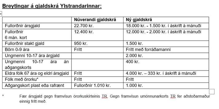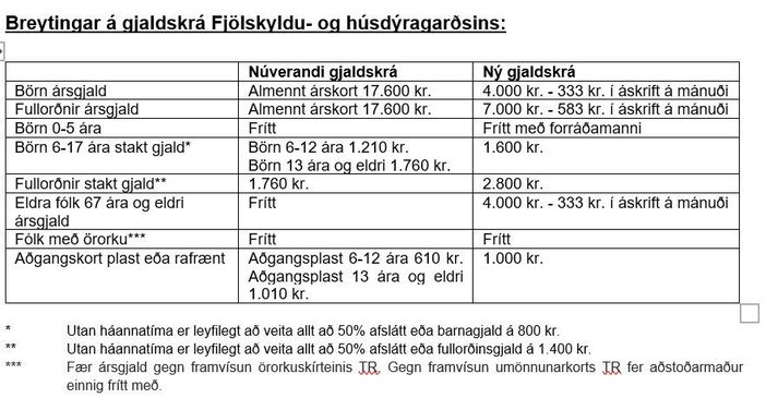 Í fréttatilkynningu frá Reykjavíkurborg segir að ný gjaldskrá hafi það að markmiði að hvetja til aukinnar notkunar og stuðla að sanngjarnari gjaldskrá. Hún eigi að umbuna borgarbúum sem eru fastagestir en á sama tíma tryggja að aðrir gestir borgi nær raunkostnaði fyrir þjónustuna. Þar er sérstaklega minnst á erlent ferðafólk sem sækir þessa þjónustu borgarinnar. Ársgjaldið í sund fer úr 48 þúsund krónum í 34 þúsund krónur á meðan stakt gjald fer úr 1430 krónum í 1500 krónur. Þá hækkar tíu miða kort úr 6.520 krónum í 7 þúsund krónur. Reykvísk ungmenni sem eru sautján ára og yngri fá frítt í sund og á Ylströndina. Breytingarnar taka gildi 5. maí. „Verð á ársmiðum í sund, Ylströnd og Fjölskyldu- og húsdýragarðinn lækkar þannig um 21-77%. Þá er í fyrsta sinn boðið upp á að kaupa ársmiða í áskrift. Ef farið er oftar en einu sinni í viku í sund, einu sinni í mánuði á Ylströndina eða oftar en tvisvar á ári í Fjölskyldu- og húsdýragarðinn, þá borgar sig að vera í áskrift,“ segir í tilkynningunni. Árskort barna í Fjölskyldu- og húsdýragarðinn lækkar um 77 prósent, úr 17.600 krónum í fjögur þúsund krónur, á meðan árskort fullorðinna lækkar um sextíu prósent. Líkt og með sundið þá hækkar verðið á stöku gjaldi fullorðinna, úr 1760 krónum í 2800 krónur. Þá þurfa eldri borgarar nú að greiða fyrir komuna. Í sumar verða sundlaugarnar í Reykjavík opnar lengur. Frá 1. júní til 31. ágúst verða sundlaugar borgarinnar opnar til tíu. Fréttin var uppfærð með nýjum töflum frá Reykjavíkurborg.