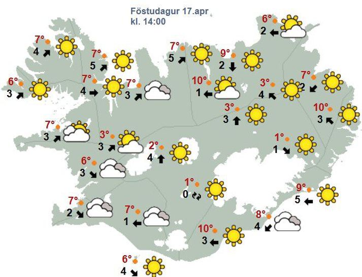 Á vef Veðurstofunnar segir að hitinn verði yfirleitt fimm til tíu stig yfir daginn. Seint annað kvöld komi lægð uppundir Austfirðina með rigningu, en líklega slydda eða snjókoma til fjalla. „Síðan dagana þar á eftir er útlit fyrir suðaustanátt. Einna hvassast suðvestantil, en hægari í örðum landshlutum. Væta af og til um suðvestanvert landið en lengst af þurrt í öðrum landshlutum. Hiti svipaður eða heldur hlýrra,“ segir á vef Veðurstofunnar. Spákort fyrir klukkan 14.Veðurstofan Veðurhorfur á landinu næstu daga Á laugardag: Norðvestan 5-10 m/s og rigning eða slydda austast fram eftir degi. Hægari og skýjað með köflum, en stöku skúrir eða slydduél í öðrum landshlutum. Hiti 1 til 9 stig, mildast suðaustanlands. Á sunnudag: Suðaustan 8-15 suðvestantil, annars hægari. Bjartviðri um landið norðaustanvert, annars skýjað og þurrt að kalla. Hiti 3 til 8 stig. Á mánudag: Suðlæg átt og skýjað sunnan- og vestanlands, en léttskýjað fyrir norðan. Hiti 5 til 10 stig. Á þriðjudag og miðvikudag: Suðvestlæg átt og skýjað við suður- og vesturströndina, en annars bjartviðri. Fremur hlýtt í veðri. Á fimmtudag (sumardagurinn fyrsti): Útlit fyrir áframhaldandi suðvestlæga átt. Fer líklega að rigna með morgninum, fyrst á Vestfjörðum, en þurrrt allra syðst. Kólnandi veður og möguleiki á að snjói nyrst um kvöldið.