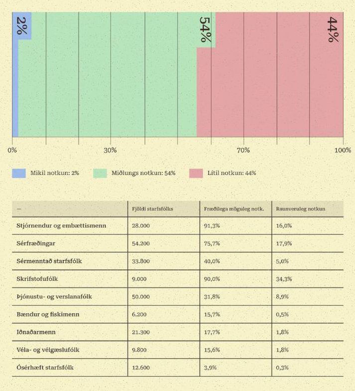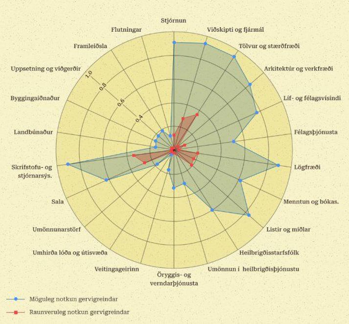 Í nýrri skýrslu Almannaróms um stöðu gervigreindarinnar eru áhrif hennar á störf og vinnumarkað sérstaklega útlistuð. Rúmlega sjö þúsund einstaklingar á íslenskum vinnumarkaði sinna störfum þar sem meira en fimmtungur verkefna er nú þegar unninn af gervigreind. Samkvæmt greiningu gervigreindarfyrirtækisins Anthropic eru þetta störf sem gætu verið unnin að öllu leyti af gervigreind. Tekið er fram í skýrslu Almannaróms að forsenda rannsóknarinnar sé að notkun gervigreindar á Íslandi og í Bandaríkjunum sé sú sama, sem er ólíklegt að sé í raun. Hins vegar er talið að notkun Íslendinga muni þróast í sömu átt og notkun vestanhafs fyrr en síðar. Greining Anthropic gerir ráð fyrir því að hægt sé að nota gervigreind í að sinna níutíu prósent verkefna skrifstofustarfsfólks en þegar sér gervigreindin um þriðjung verkefnanna. Sömu sögu má segja um störf stjórnenda og embættismanna. Þeir nýta nú þegar gervigreindina í sextán prósent verkefna en gætu nýtt hana í rúm níutíu prósent verkefna. Á efri hluta myndar má sjá hvar notkunar gervigreindar gætir á vinnumarkaði þegar horft er á heildina. Flestir eru í störfum þar sem notkunin er „miðlungs“ og fæstir í störfum þar sem notkunin er „mikil“. Í töflunni að neðan má sjá fjölda starfsfólks eftir starfsstéttum (skv. flokkun Hagstofu), þar sem sýnt er hlutfall bæði fræðilega mögulegrar notkunar gervigreindar og raunverulegrar notkunar.Almannarómur Sá hópur sem mun finna hvað minnst fyrir gervigreindina er ósérhæft starfsfólk en það eigi að geta nýtt gervigreindina í 3,9 prósent verkefna. Þar á undan er véla- og vélgæslufólk sem gæti látið gervigreindina sjá um tæp sextán prósent. Konur eru líklegri til að sinna störfum þar sem gervigreindin getur séð um meirihluta verkefna. Háskólamenntaðir munu finna töluvert meira fyrir áhrifum gervigreindarinnar. Þrátt fyrir að talið sé að gervigreindin muni hafa áhrif á flest störf er ólíklegt að upp komi óvæntar sviptingar eða fjöldaatvinnuleysi. Líklegt er að þróunin sjáist nú þegar í eðli starfanna sem gervigreindin kann að hafa áhrif á. Langt frá því að fullnýta tæknina Gervigreindarmállíkön á við ChatGPT og Claude geta nú leyst verkefni sem tækju starfsmann nokkrar klukkustundir að leysa og er talið að gervigreindin geti fljótlega leyst verkefni sem annars tæki fólk fleiri mánuði að vinna á mun styttri tíma. Almennt starfsfólk er hins vegar langt frá því að fullnýta gervigreindina, sem getur til að mynda verið vegna takmarkanna laga- og regluumhverfis og staðreyndarinnar að tækninni hefur fleygt fram hraðar en færni og þekkingu fólks. „Það er ótvírætt að eftir því sem tæknin verður betri, notkun útbreiddari og innleiðing dýpri í verkferla fyrirtækja þá mun rauða svæðið á myndinni, svæði hinnar raunverulegu notkunar, smám saman þekja stærri hluta bláa svæðisins, svæði hinnar fræðilega mögulegu notkunar. Þessi svæði munu þó seint renna saman í eitt,“ segir í greiningunni. Greining Anthropic ber saman fræðilega mögulega notkun gervigreindar (bláa svæðið á myndinni) og raunverulega notkun samkvæmt notkunartölum frá Anthropic sjálfum (rauða svæðið á myndinni).Almannarómur „Rétt er að ítreka hér að allt eru þetta vísbendingar um hvar gervigreind kann nú þegar að hafa áhrif eða er líkleg til að hafa áhrif í náinni framtíð. Þessi nálgun segir hins vegar í raun ekki með beinum hætti til um mögulegt atvinnuleysi, líklega þróun ráðninga eða áhrif á launaþróun. Slík áhrif munu velta á ákvörðunum fyrirtækja og stjórnvalda og þróun ólíkra atvinnugreina.“