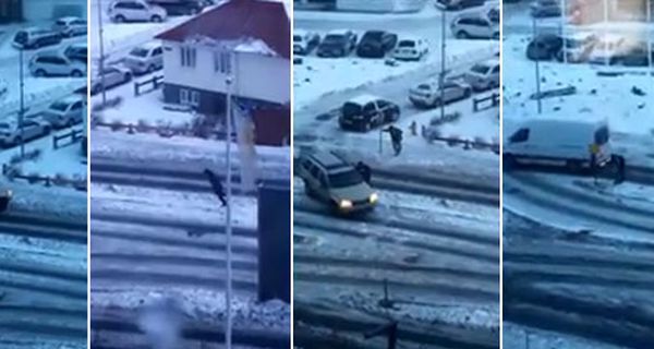 Gangandi vegfarendur eiga í miklum erfiðleikum vegna mikilla vindstrengja við háhýsin við Höfðatorg og í Borgartúni í dag.