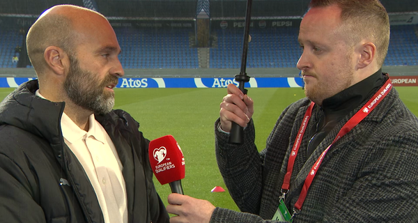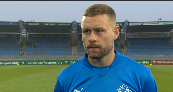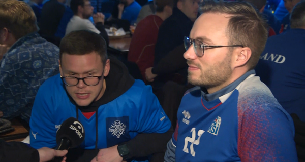 Berglind Hrund Jónasdóttir fékk væna vatnsgusu frá Glódísi Perlu og Söndru Maríu í viðtali eftir fyrsta landsleikinn.
